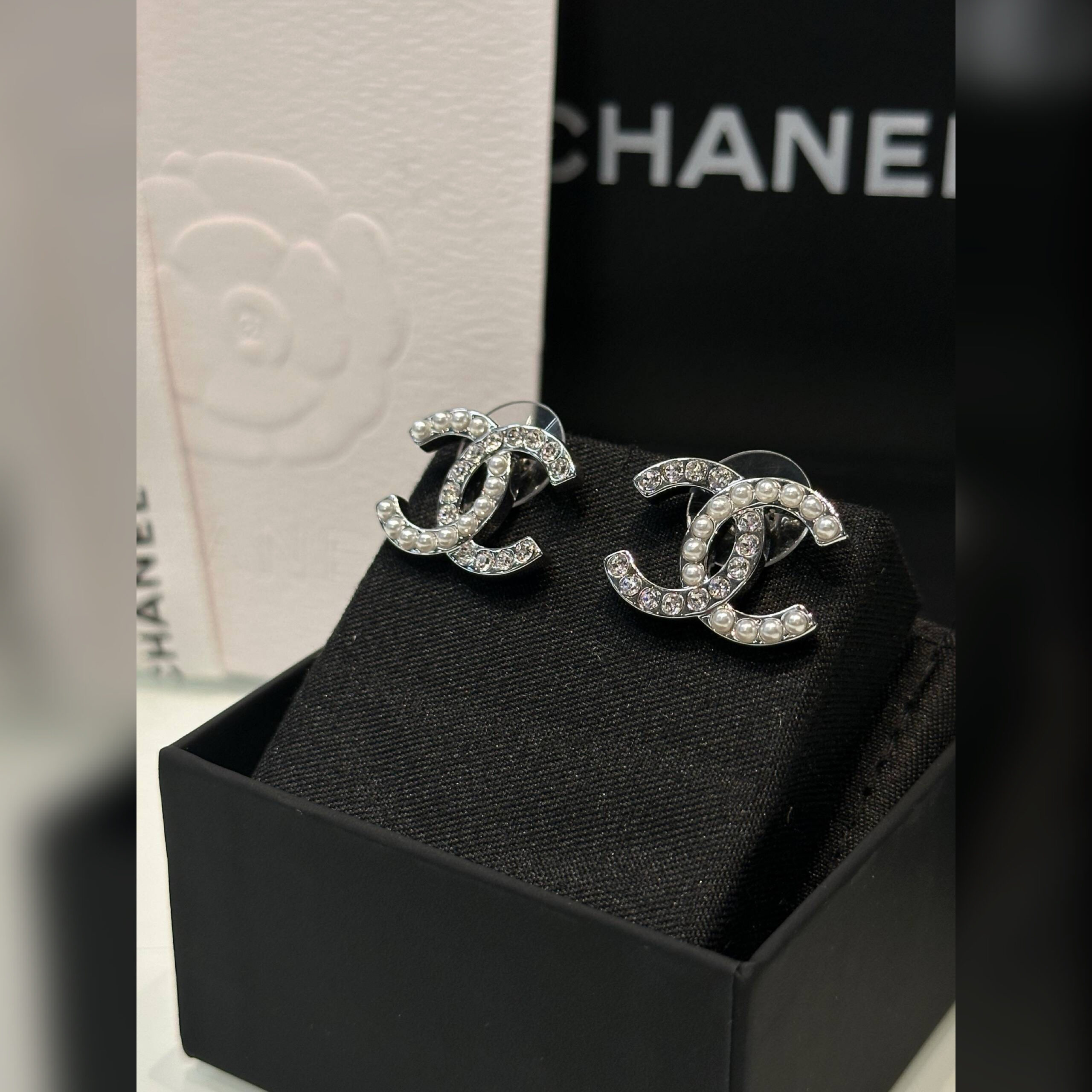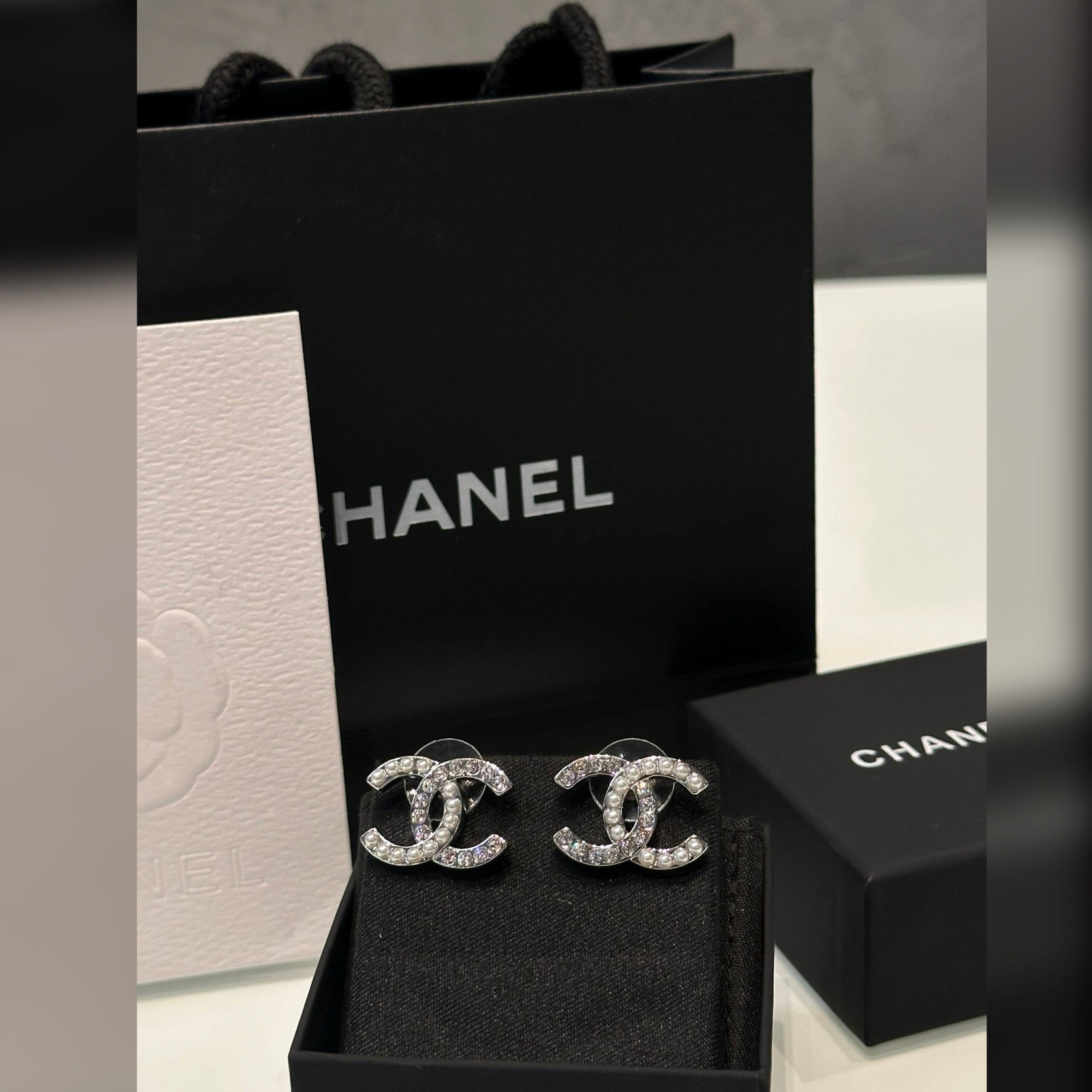 Серьги из ювелирного сплава с серебристым финишем выполнили в виде монограммы СС. Одну половину изделия подчеркнули прозрачными кристаллами, а вторую— полусферами фантазийного жемчуга.