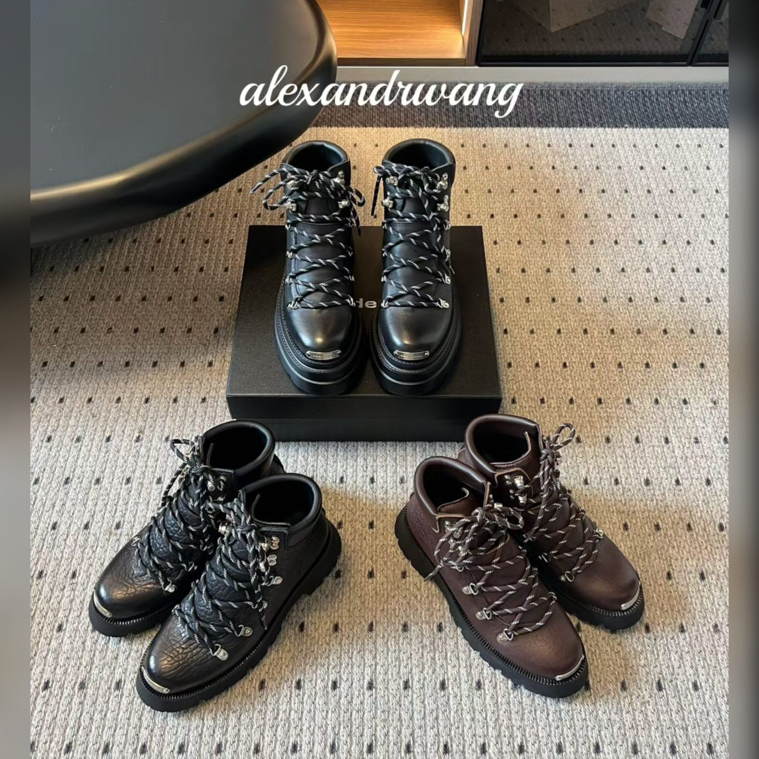 Для изготовления модели с широкой подошвой и шнуровкой, как у трекинговой обуви, мастера марки использовали прочную натуральную кожу. Александр Вэнг декорировал мыс металлической вставкой с выгравированной эмблемой.