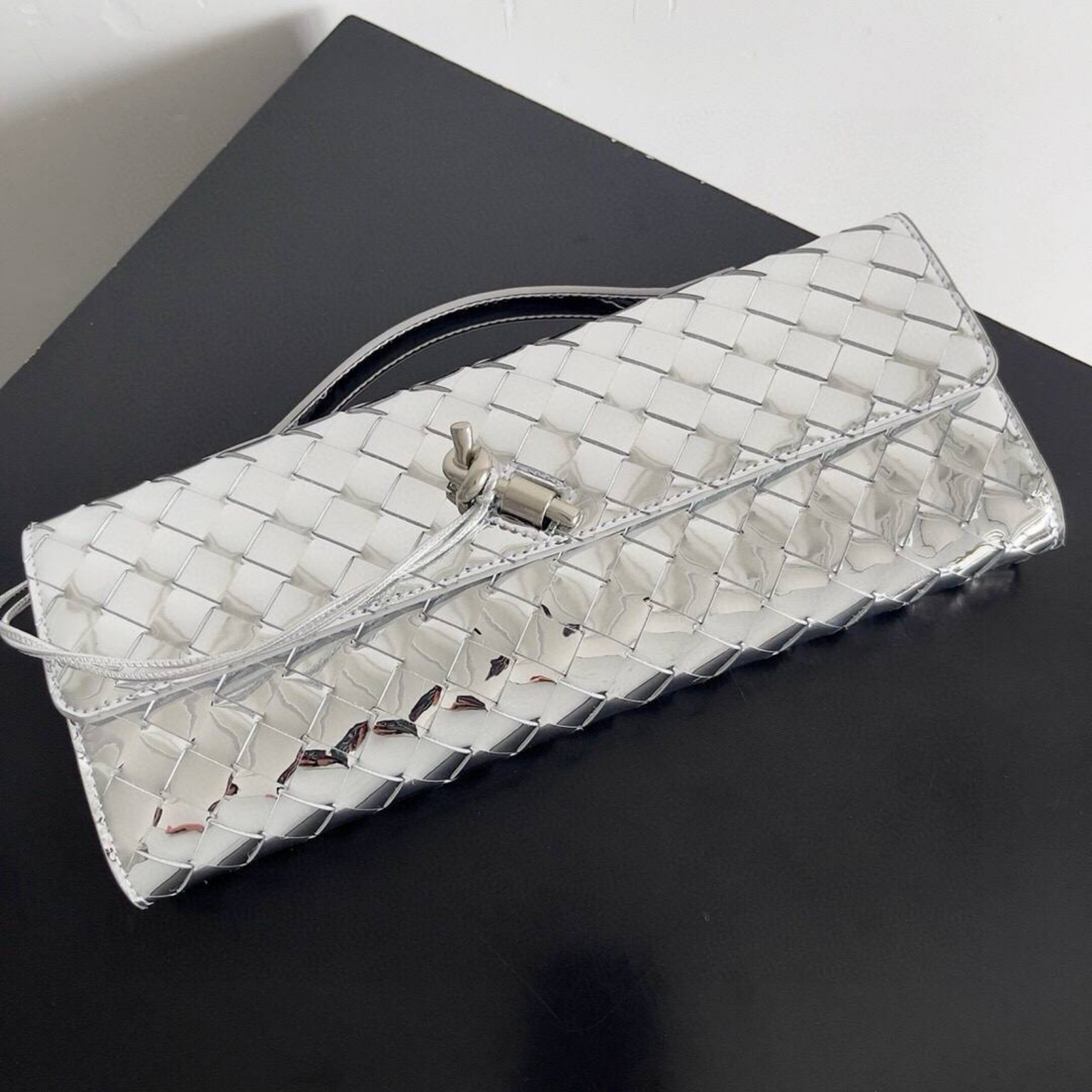 Клатч Andiamo с одной ручкой выполнен из натуральной кожи серебристого цвета с глянцевым финишем в фирменной технике плетения intrecciato. Фактурный узор оттеняет металлическая деталь в виде узла на функциональном откидном клапане.