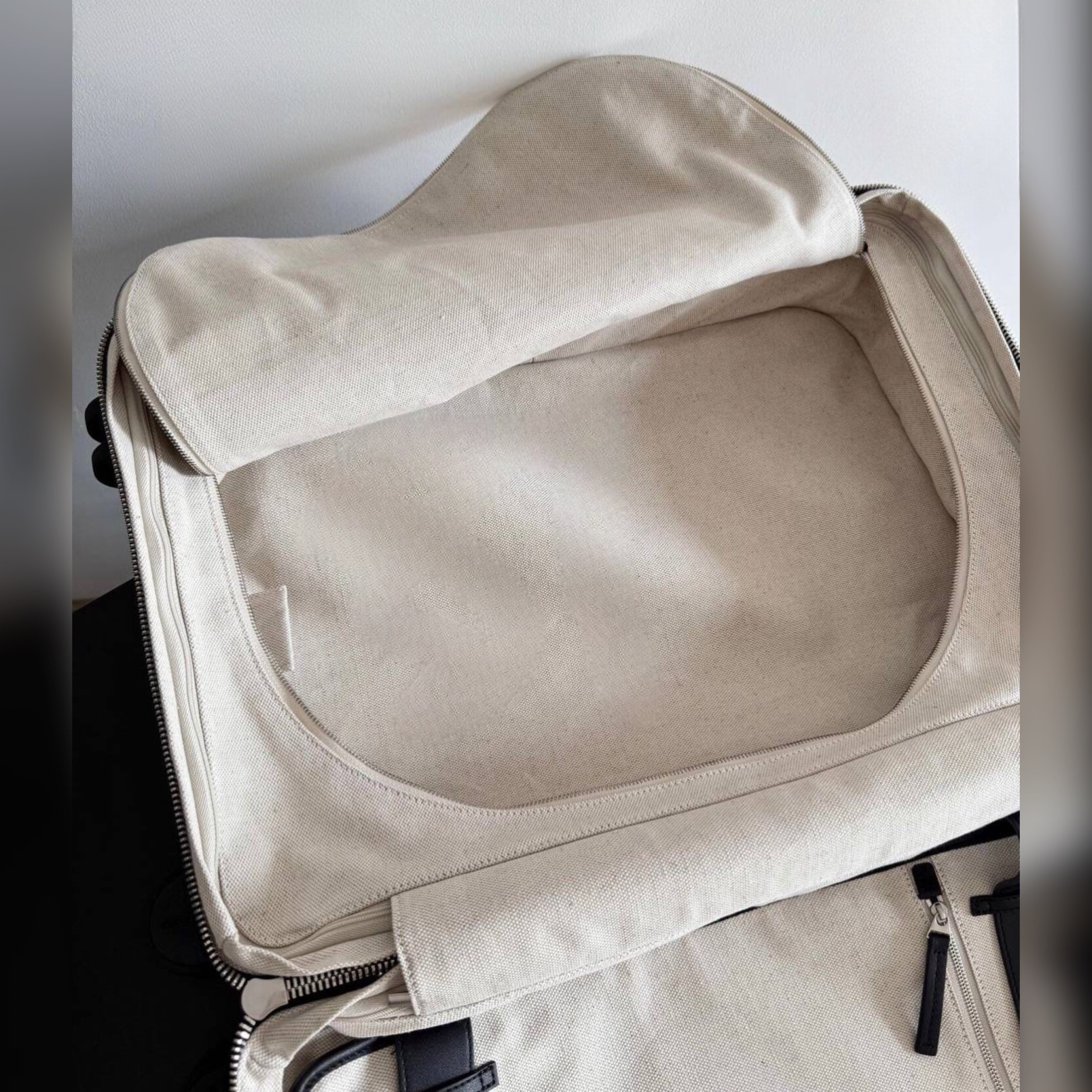 Изделие достаточно просторно, чтобы вместить все необходимое для путешествия. Внутри одно отделение на молнии и одно отделение на ремнях со съемным разделителем и плоским карманом на молнии.