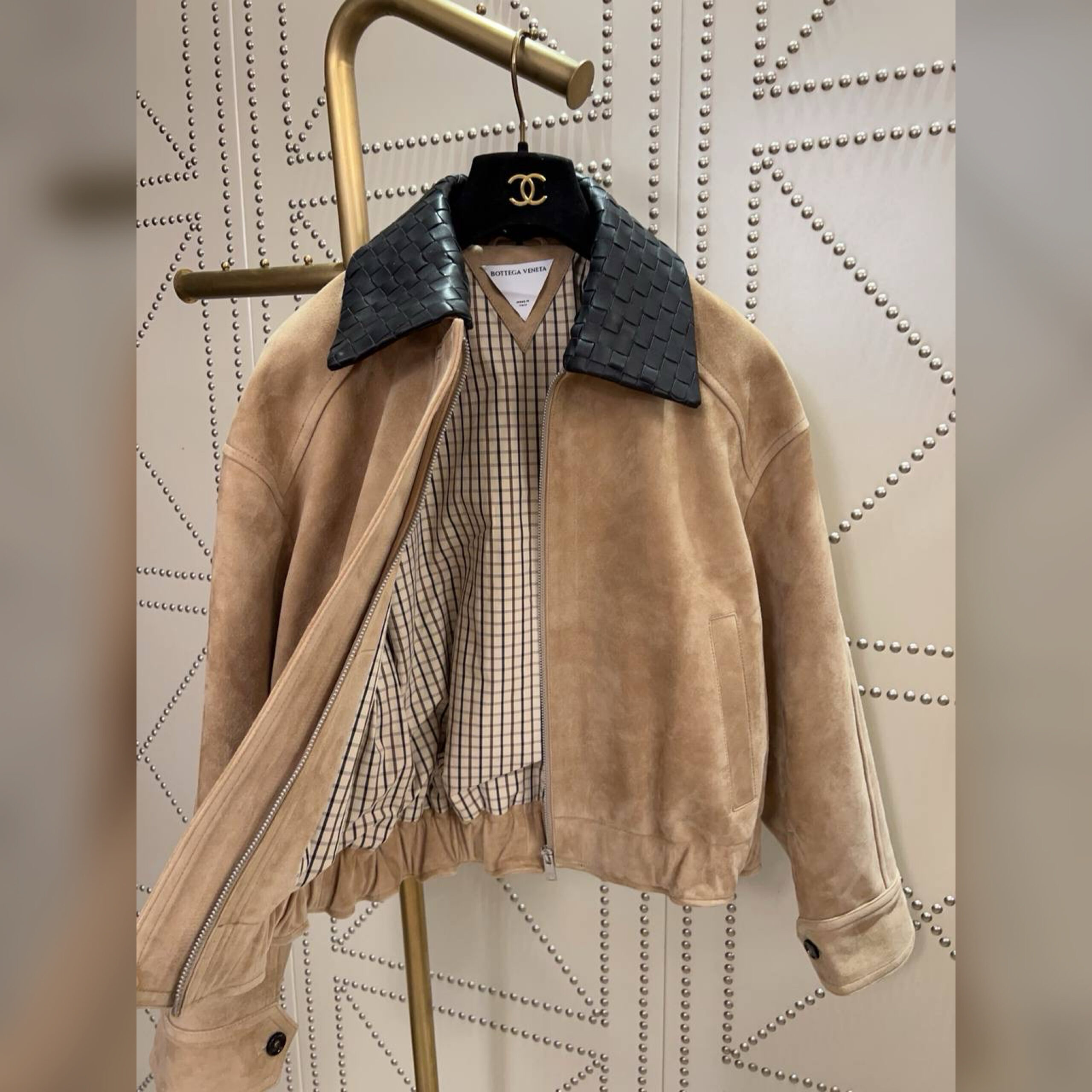 Бомбер сшили из ультрамягкой бархатистой замши. Воротник изделия выполнили из кожи и украсили плетением intrecciato ad incerto—реверанс в сторону знакового для марки декора.