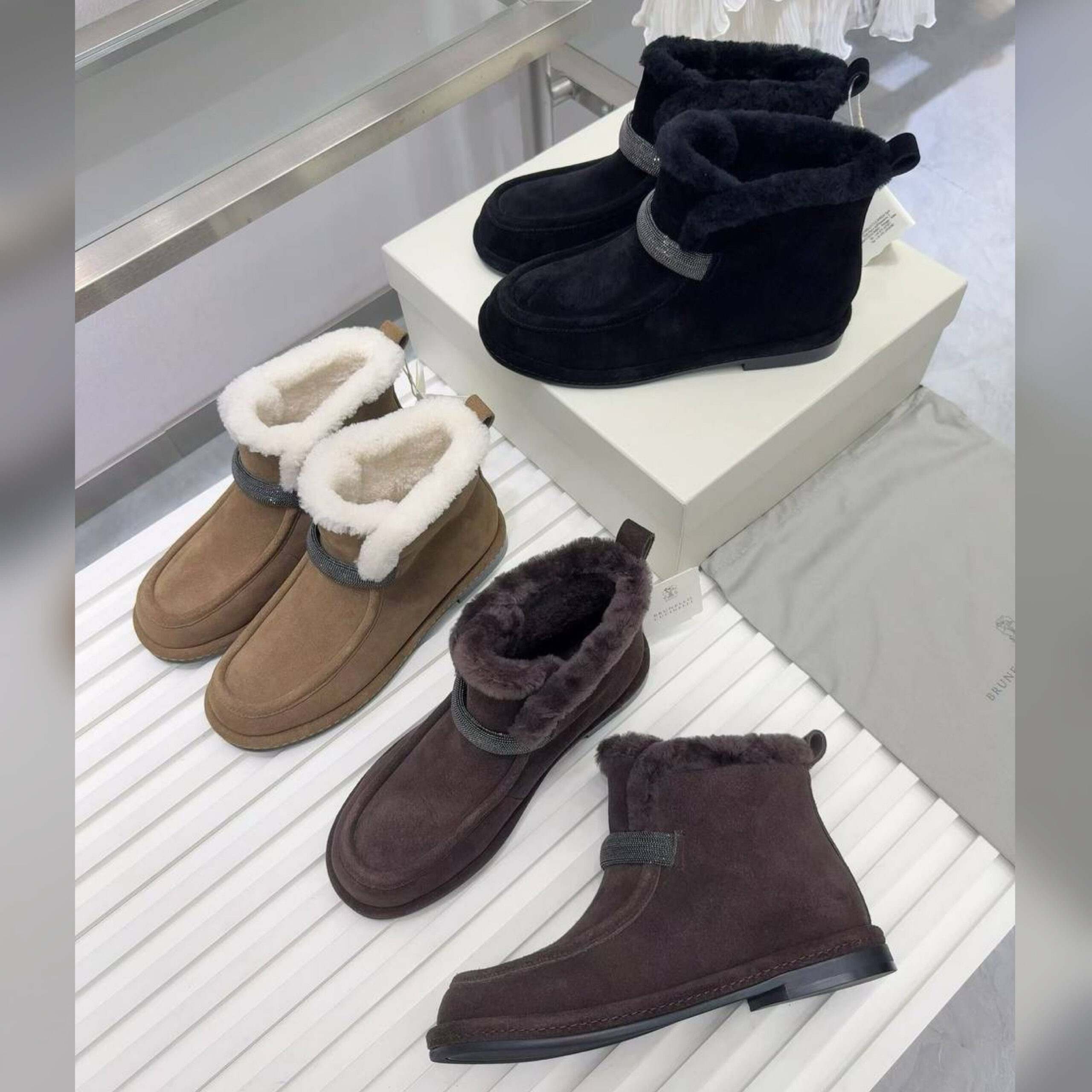 Ботинки с внутренней отделкой из пушистого меха выполнили из замши. Пару с рельефным швом вдоль мыса и фирменной накладкой на язычке, украшенной цепочками Мониль, установили на гибкую подошву с едва заметным каблуком.