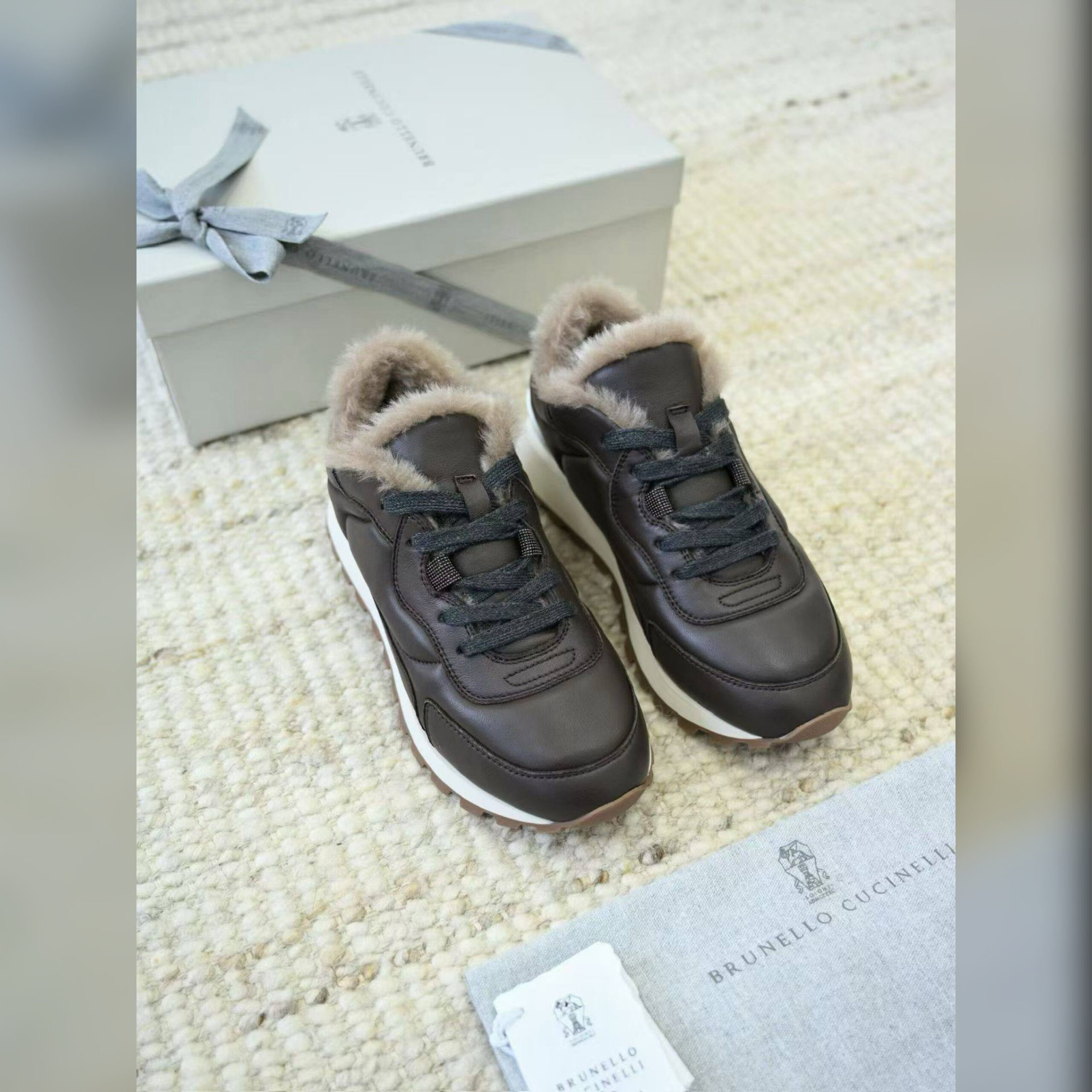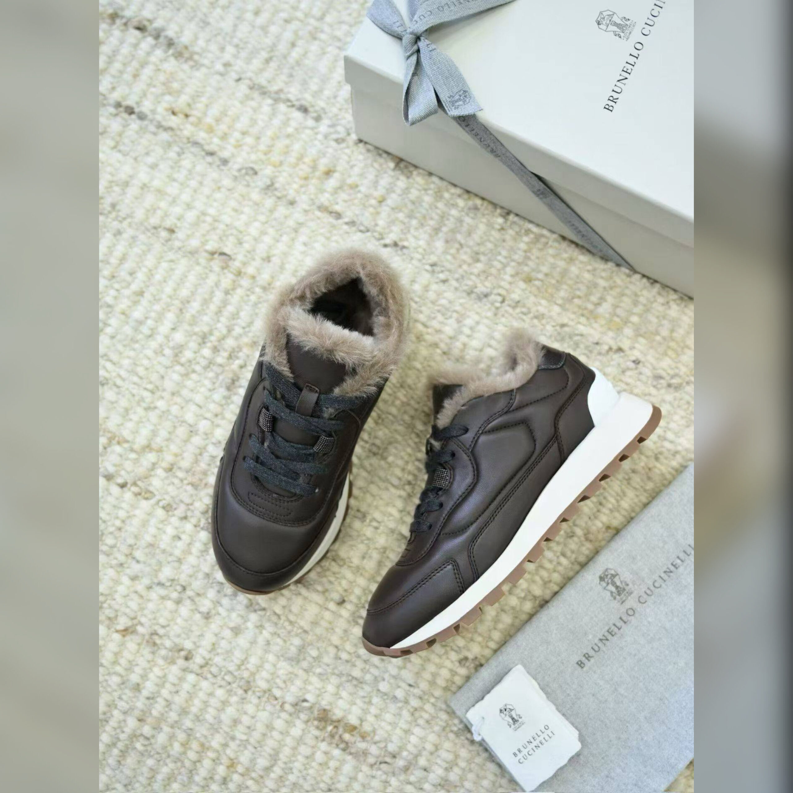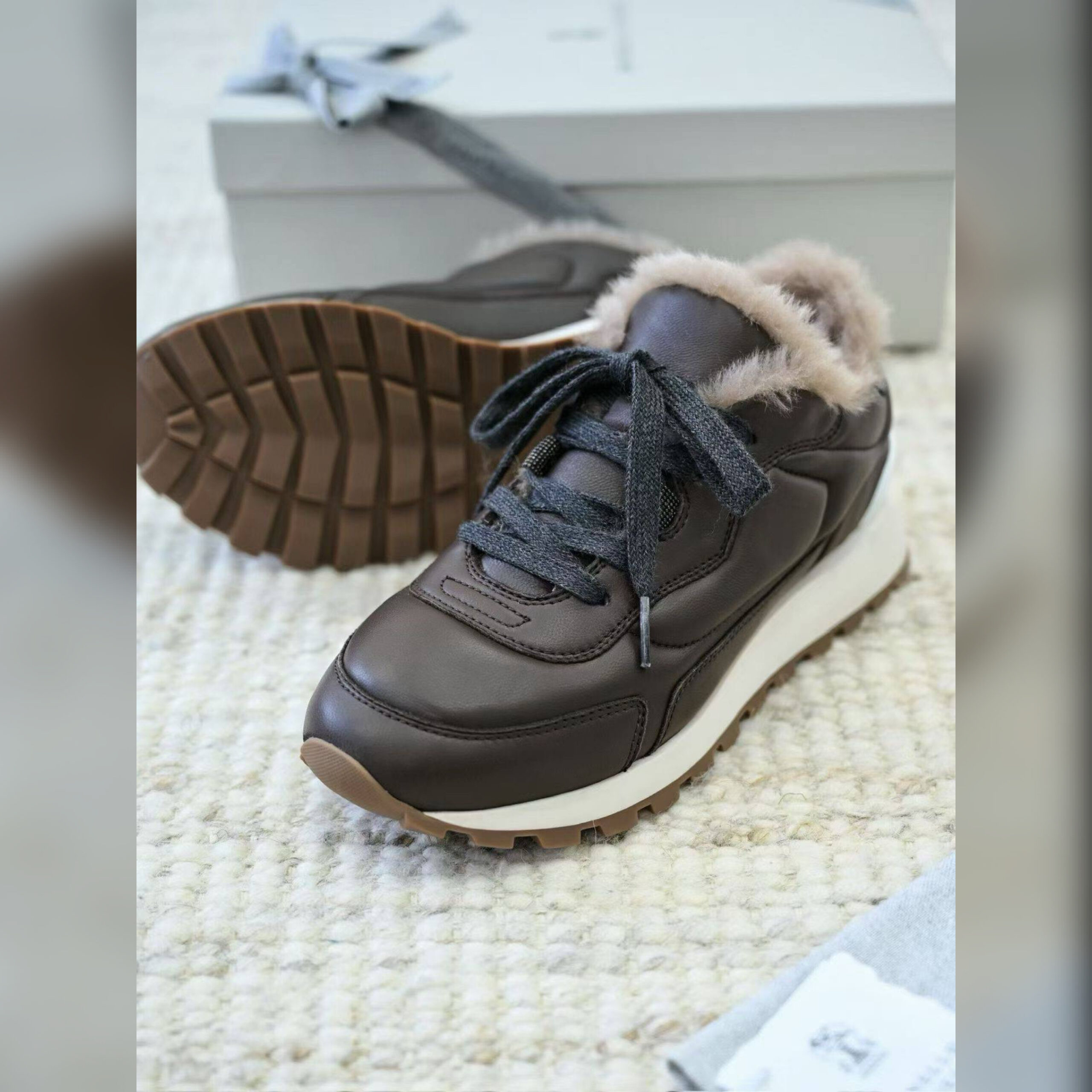 Кроссовки с внутренней отделкой из меха выполнили из телячьей кожи. Шнуровку подчеркнули петлями из фирменной цепочки мониль, а задник укрепили контрастной брендированной накладкой.