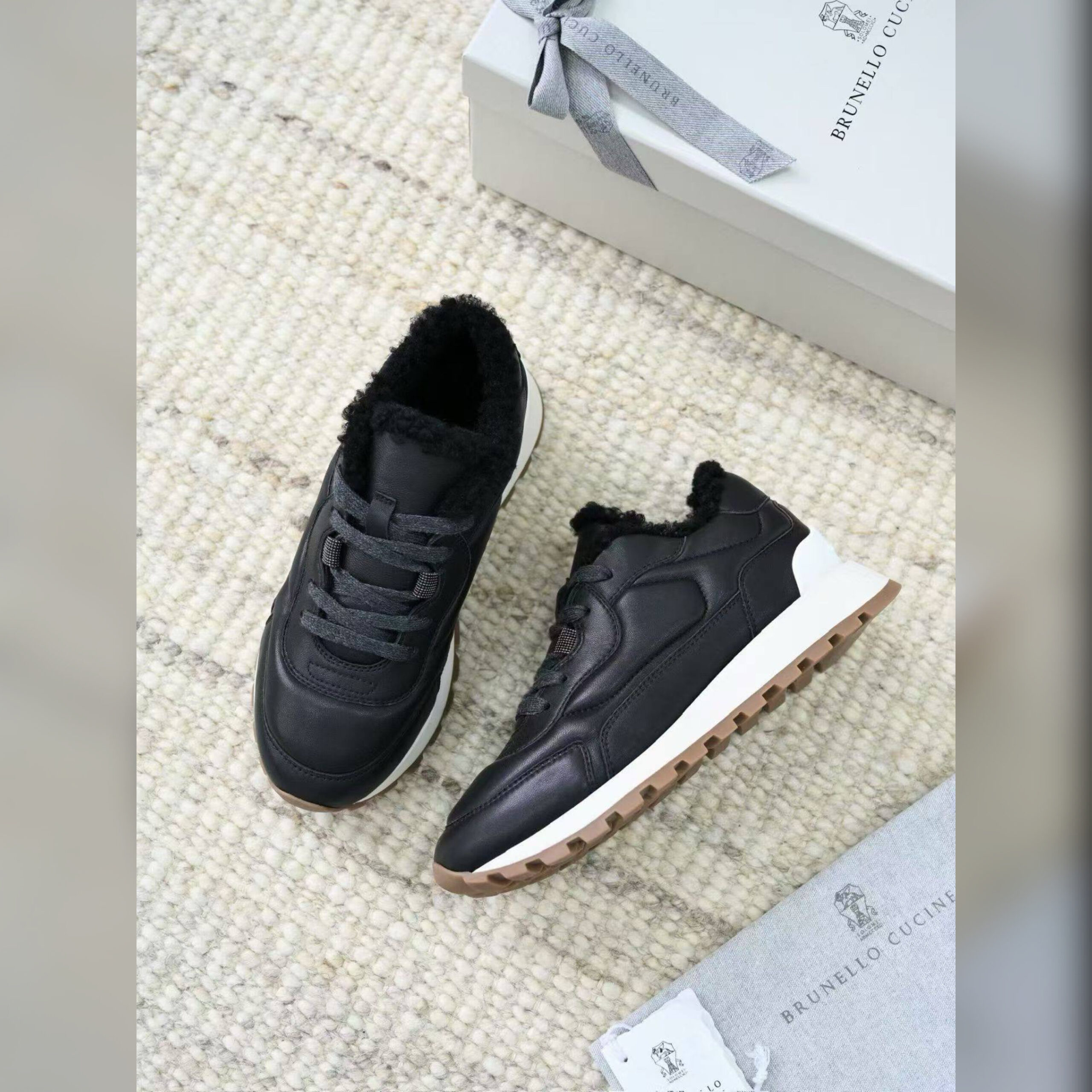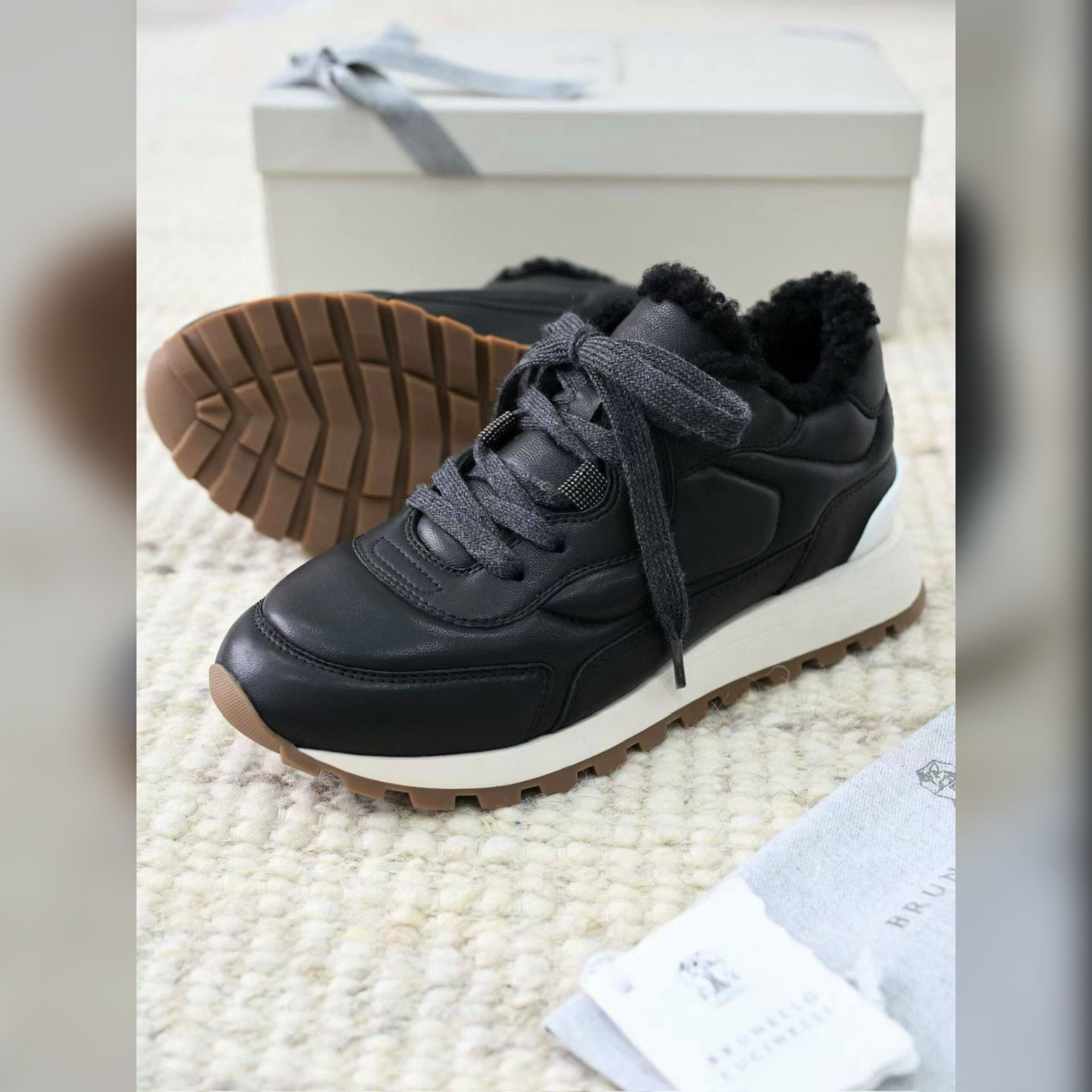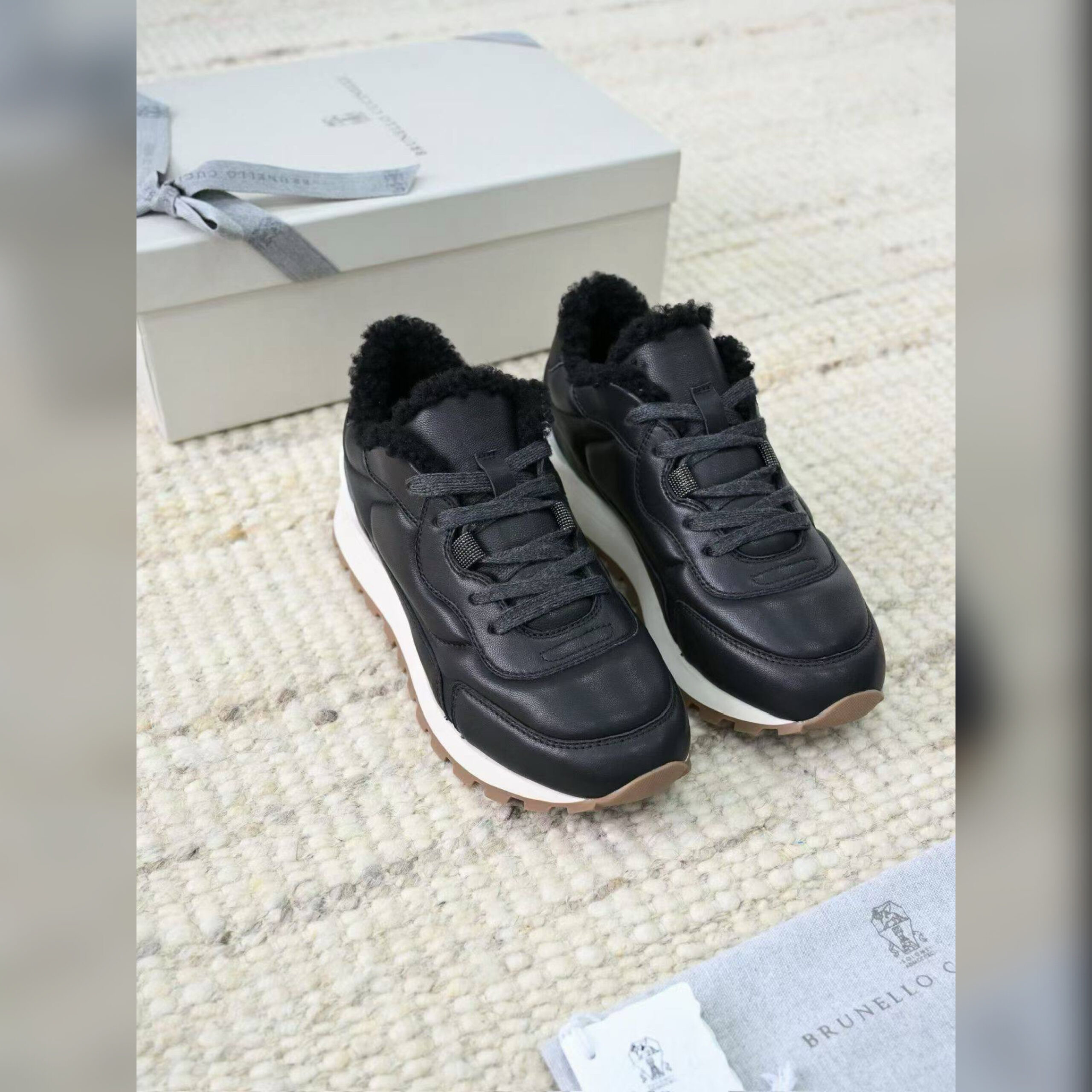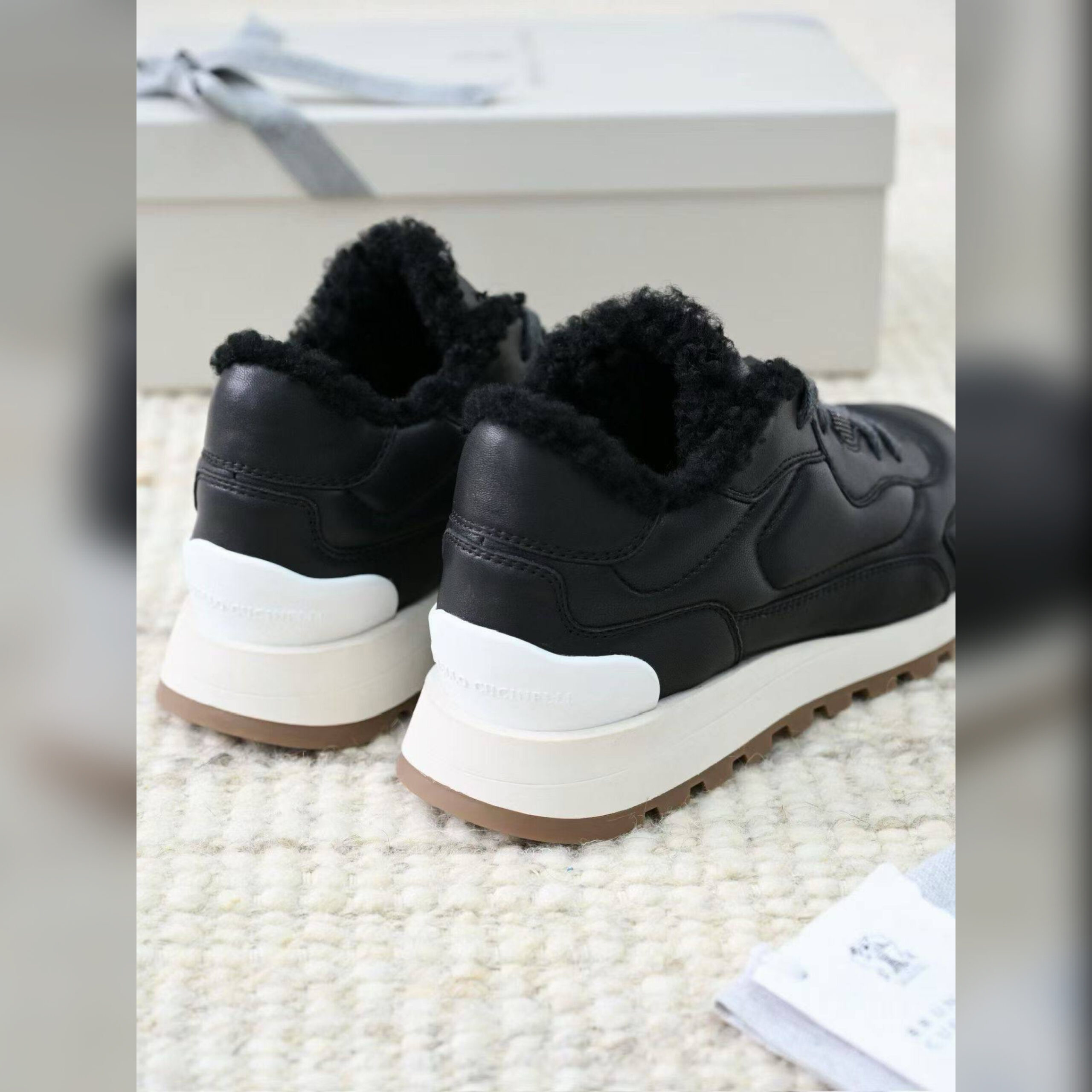 Кроссовки с внутренней отделкой из меха выполнили из телячьей кожи. Шнуровку подчеркнули петлями из фирменной цепочки мониль, а задник укрепили контрастной брендированной накладкой.