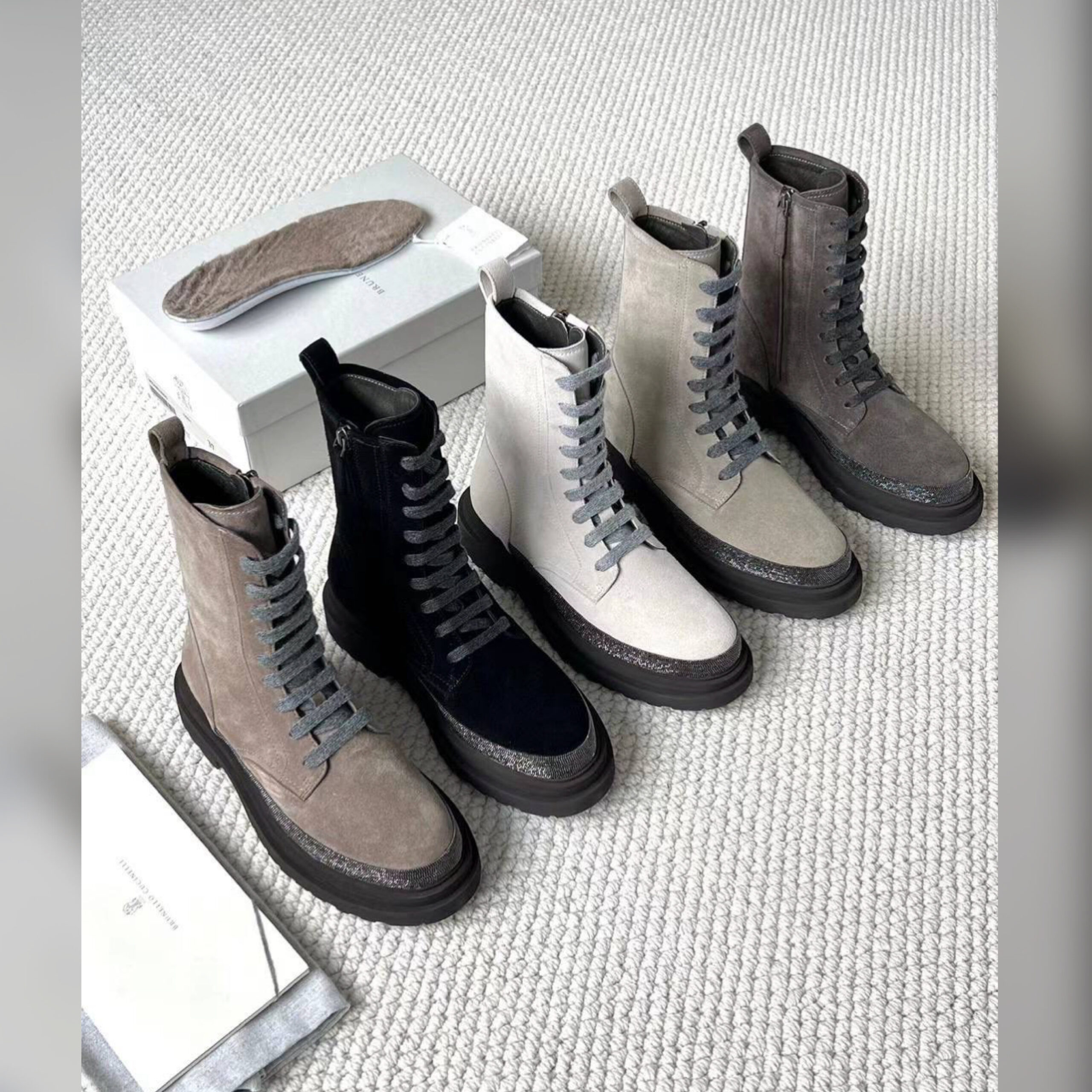 Замшевые ботинки на тракторной подошве из легкого полимера ЭВА дополнили рантом, вышитым цепочкой мониль. Модель с высокой шнуровкой и петлей на заднике застегивается молнией сбоку.
