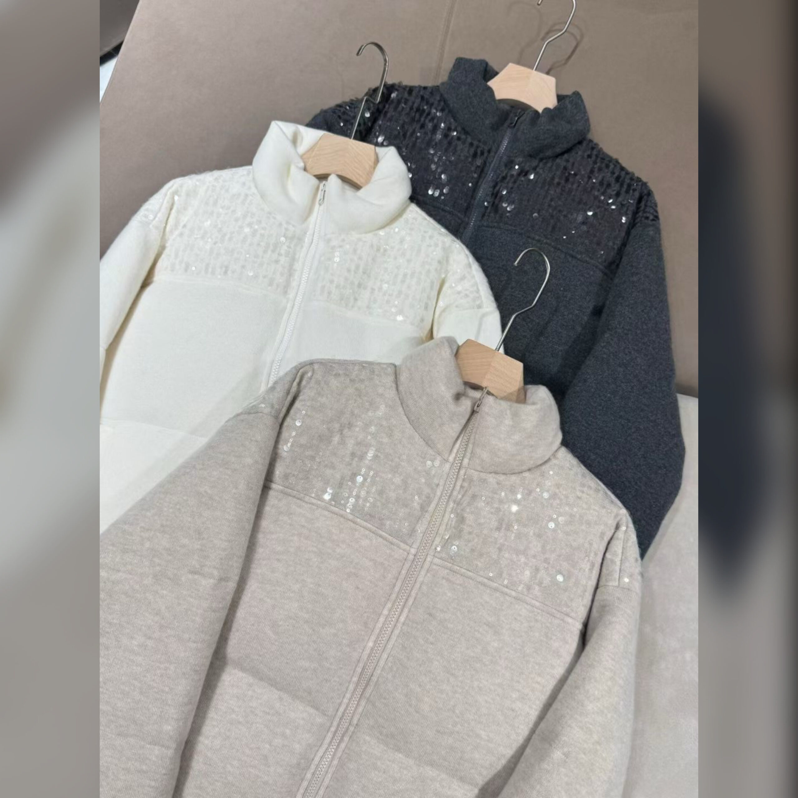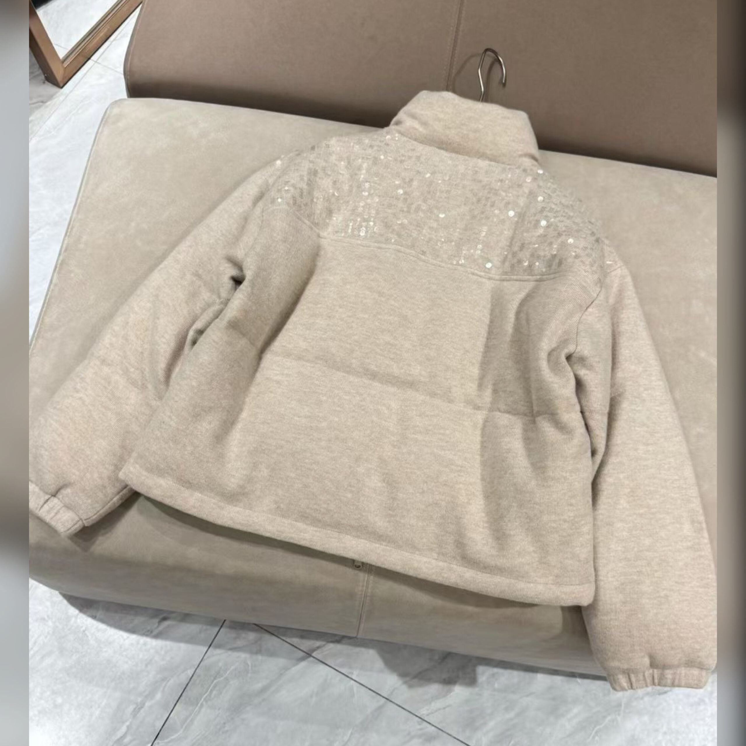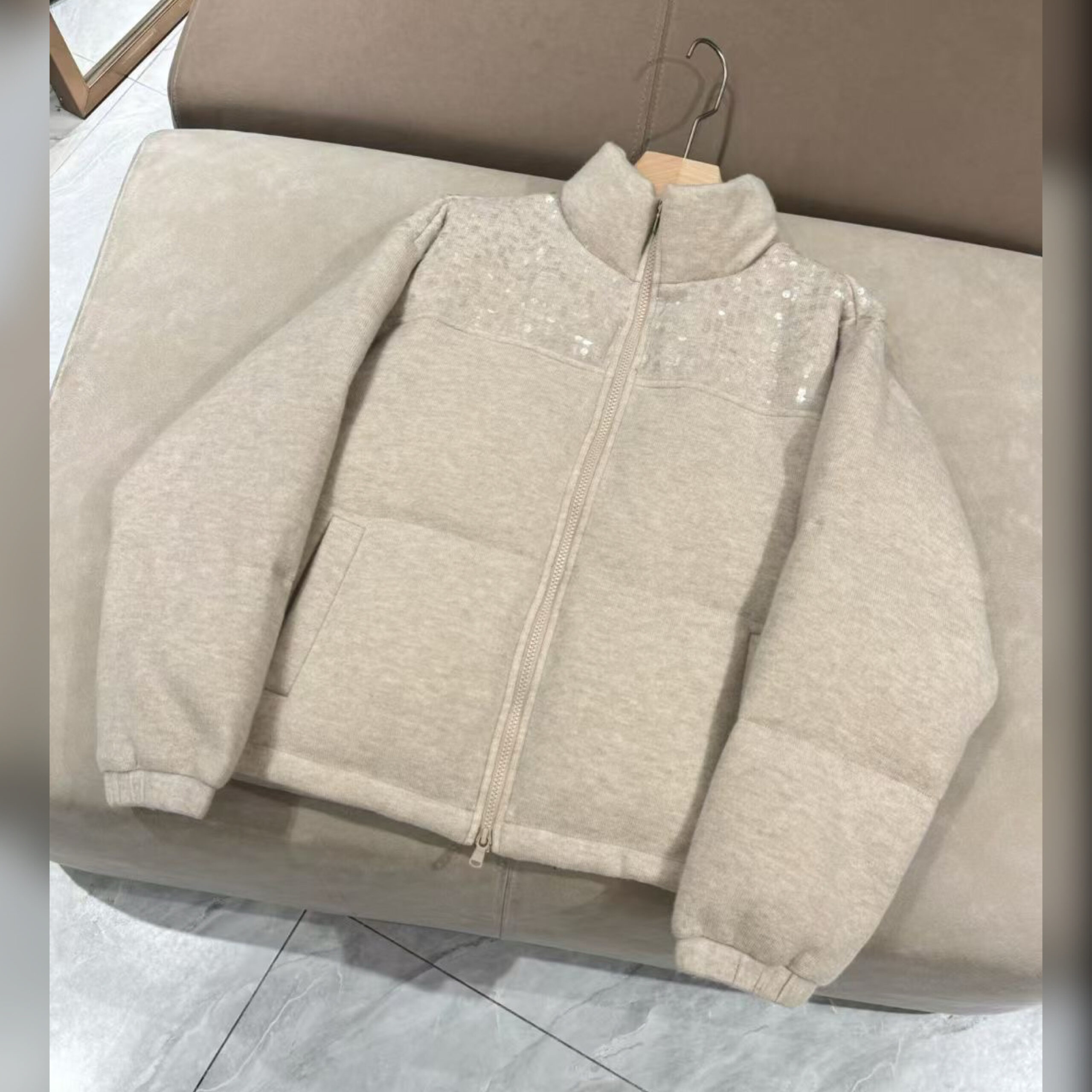 Инструментом стал блеск: утепленное гусиным пухом изделие сверкает за счет множества крупных полупрозрачных пайеток.
