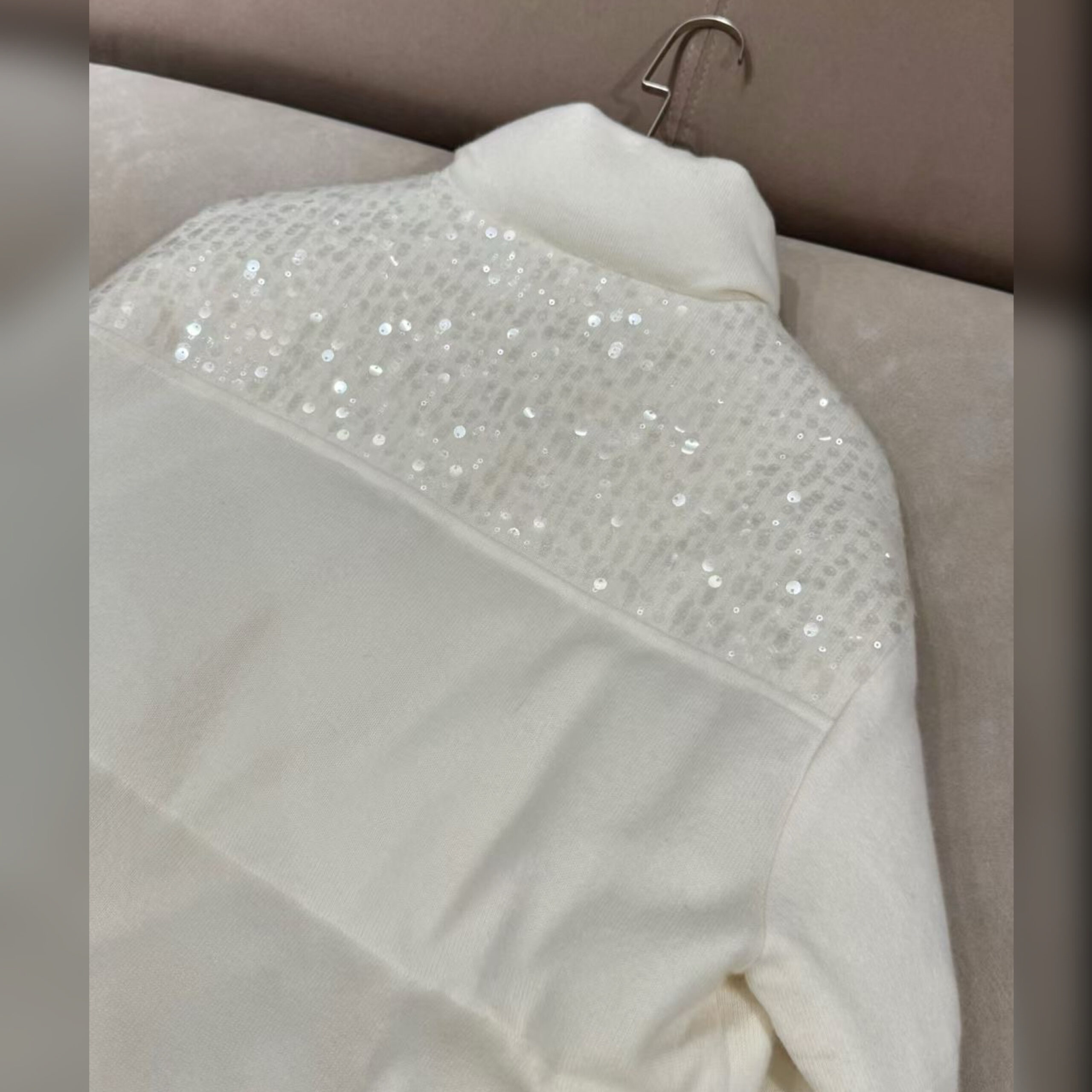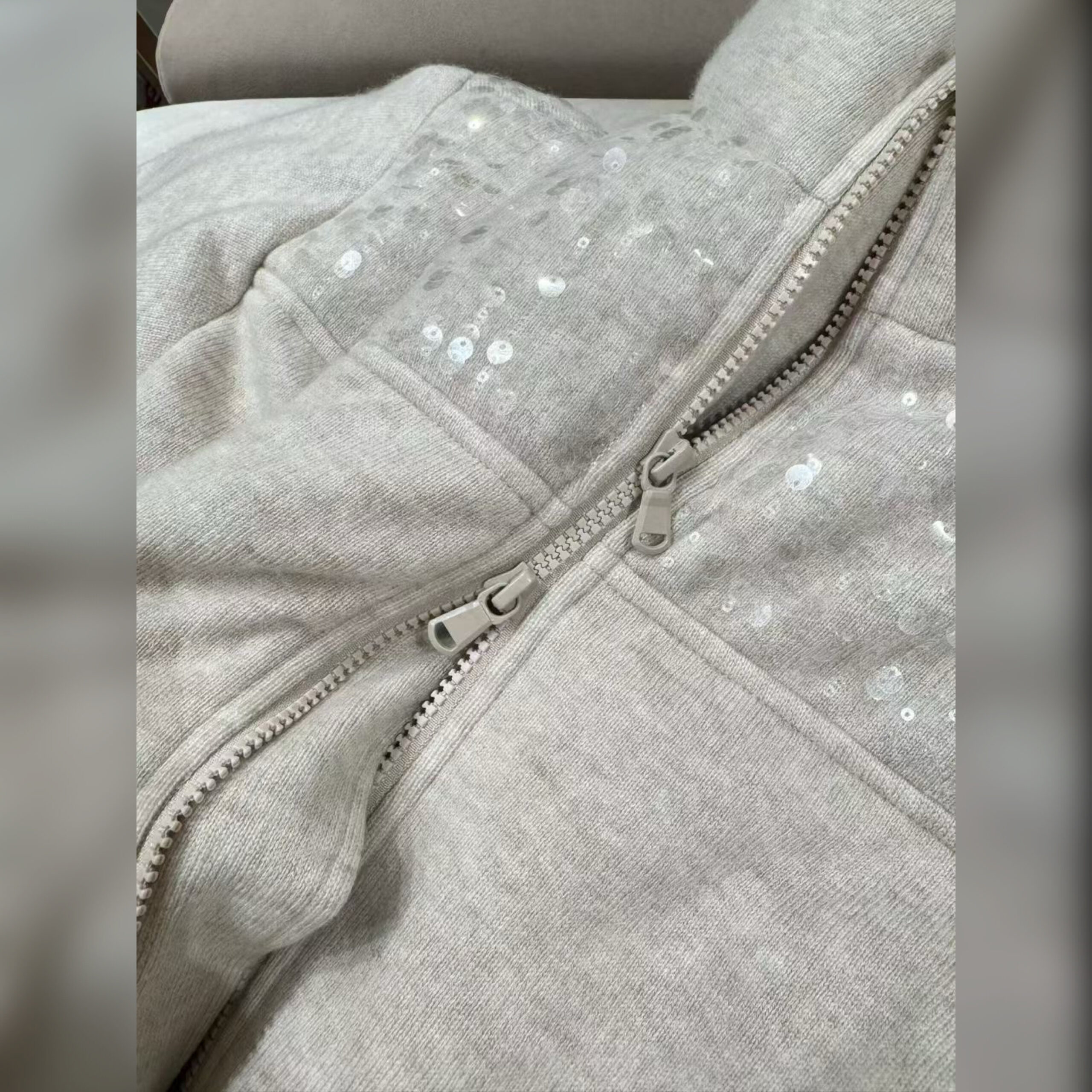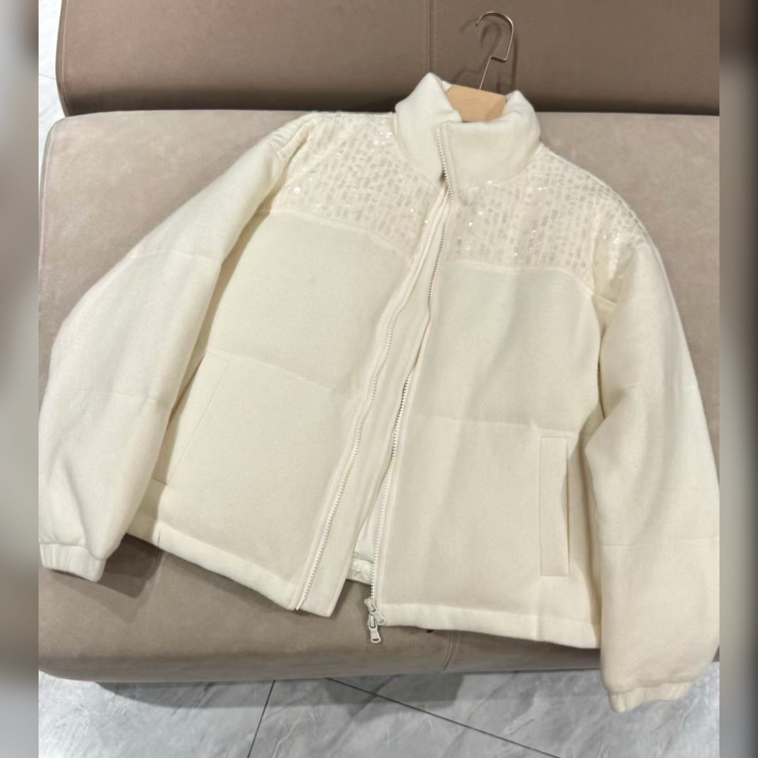 Инструментом стал блеск: утепленное гусиным пухом изделие сверкает за счет множества крупных полупрозрачных пайеток.