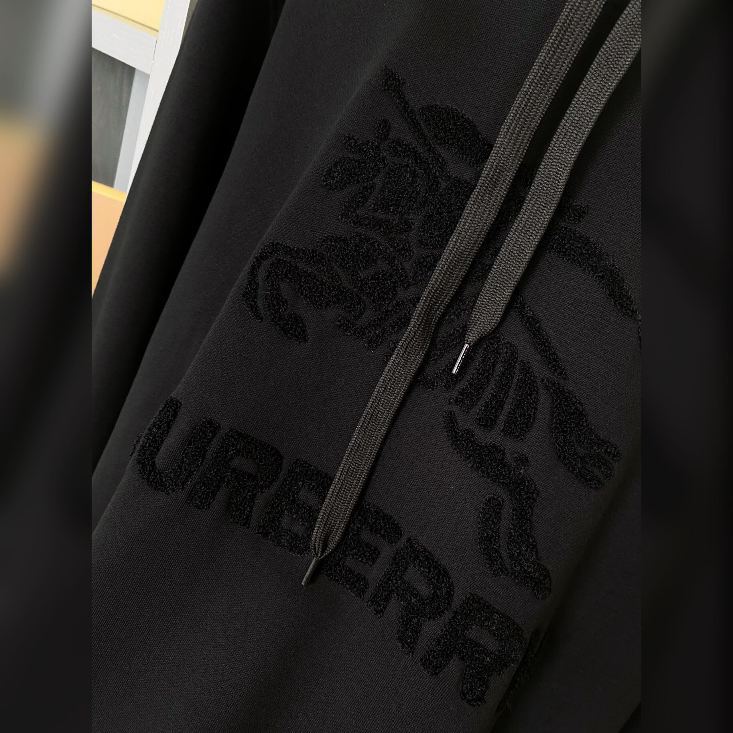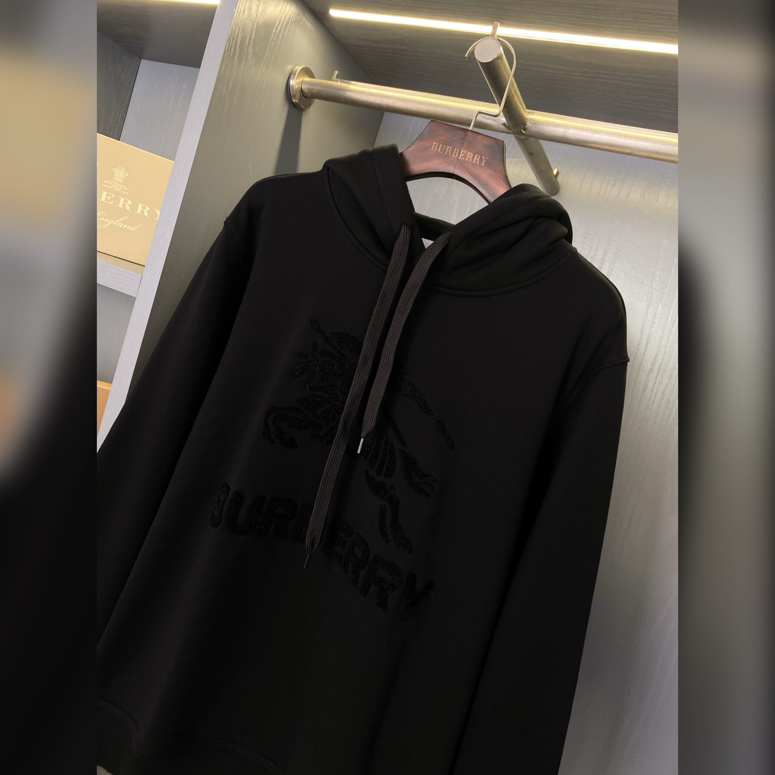 На первый взгляд худи выглядит предельно аскетично, но при ближайшем рассмотрении становится виден узор в виде знакового конного рыцаря и логотипа марки.