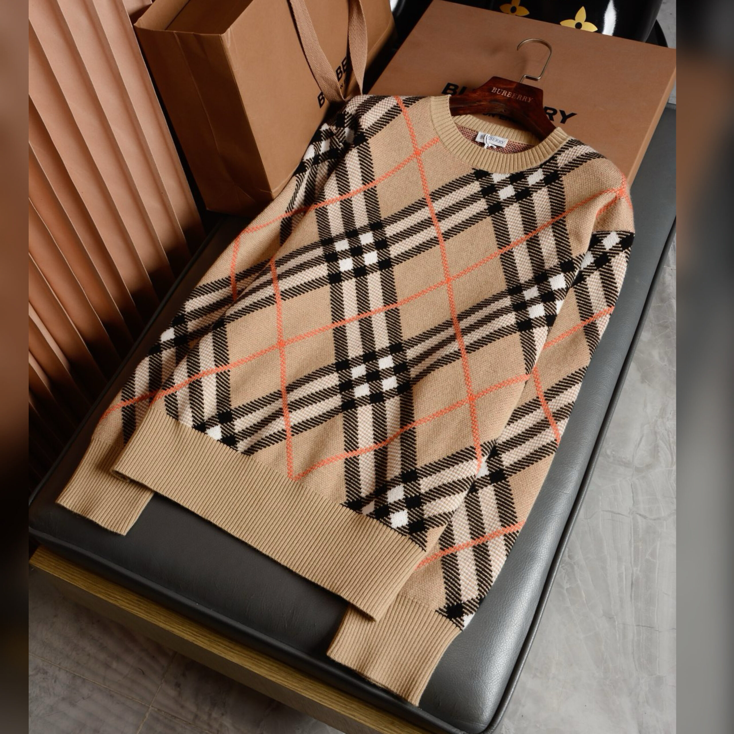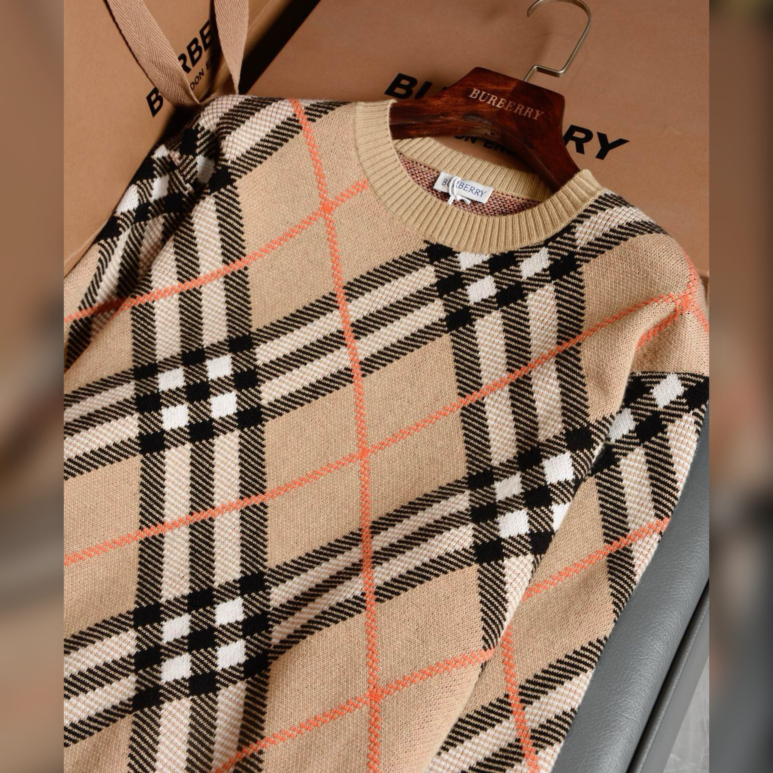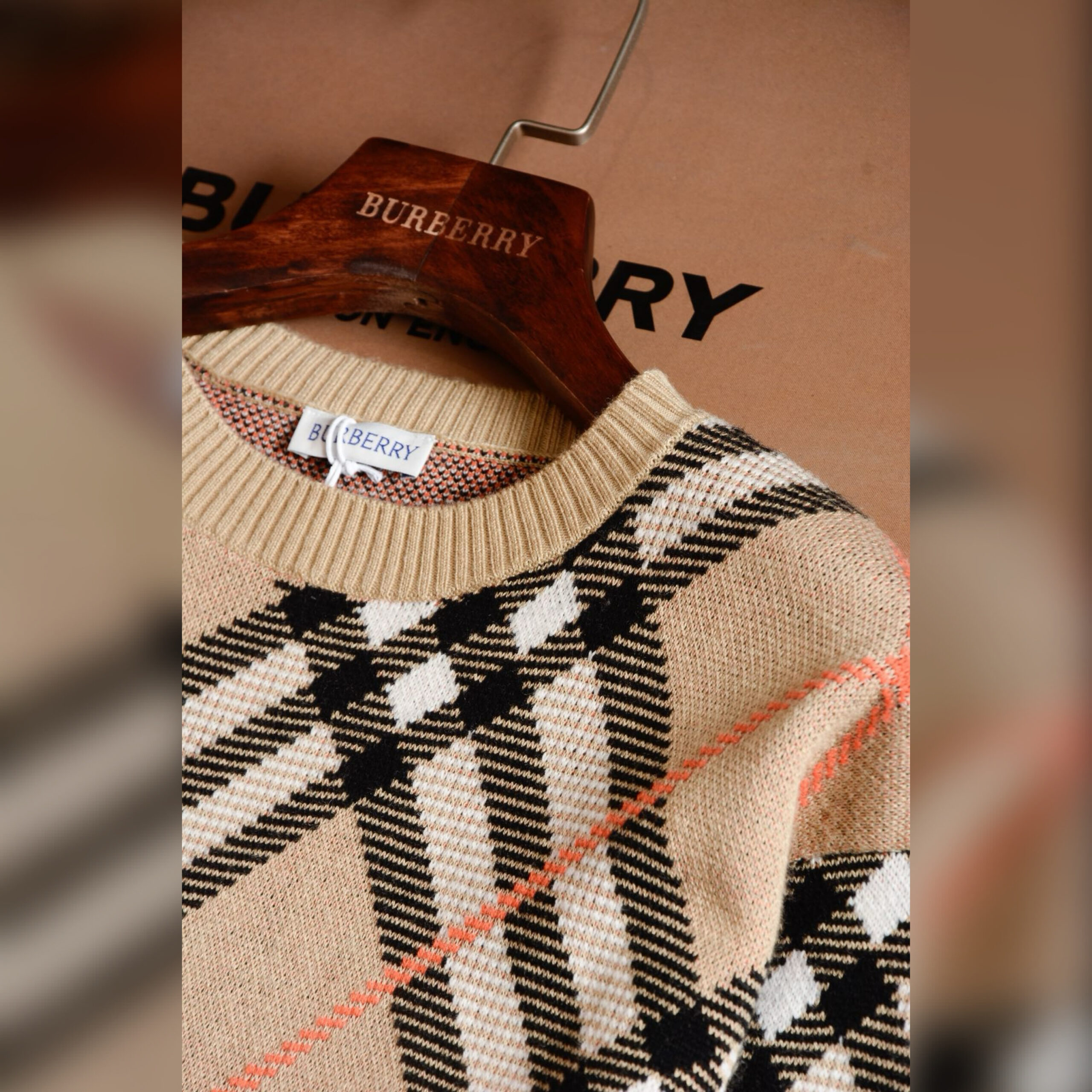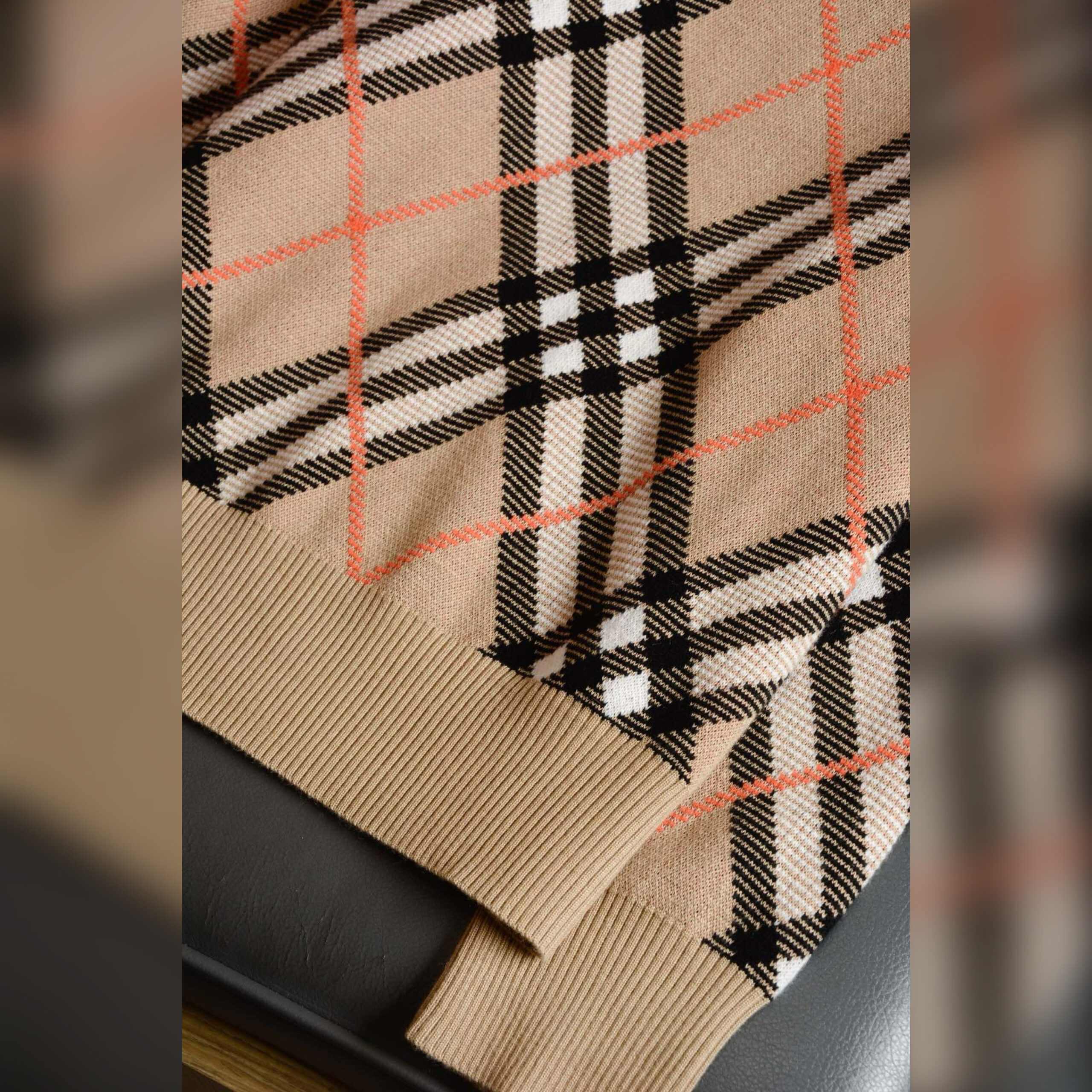 Пуловер в фирменную клетку Burberry Check связали из шерстяной пряжи с добавлением мохера и нейлона. Однотонные манжеты, пояс и круглую горловину выполнили в рубчик.