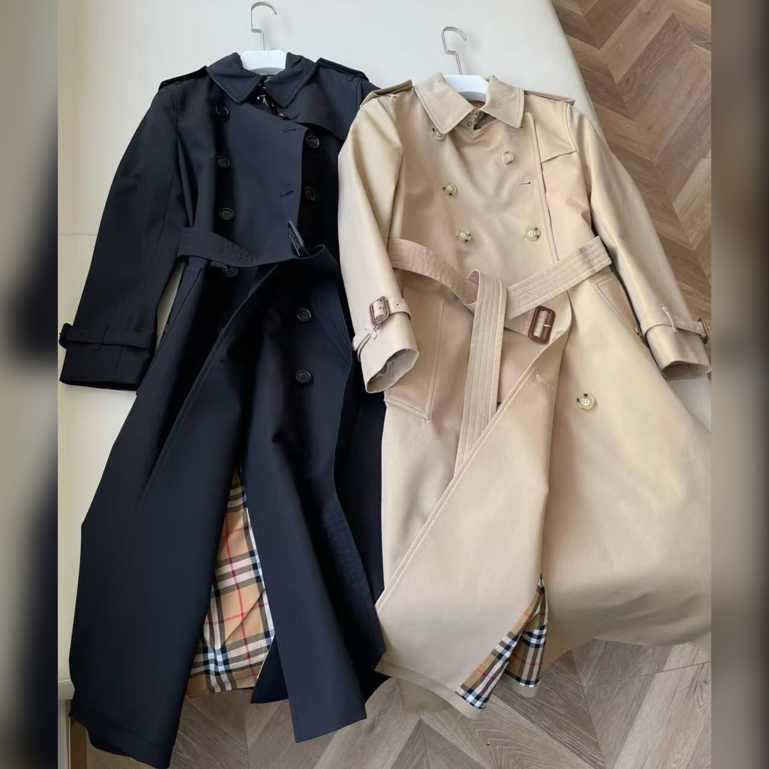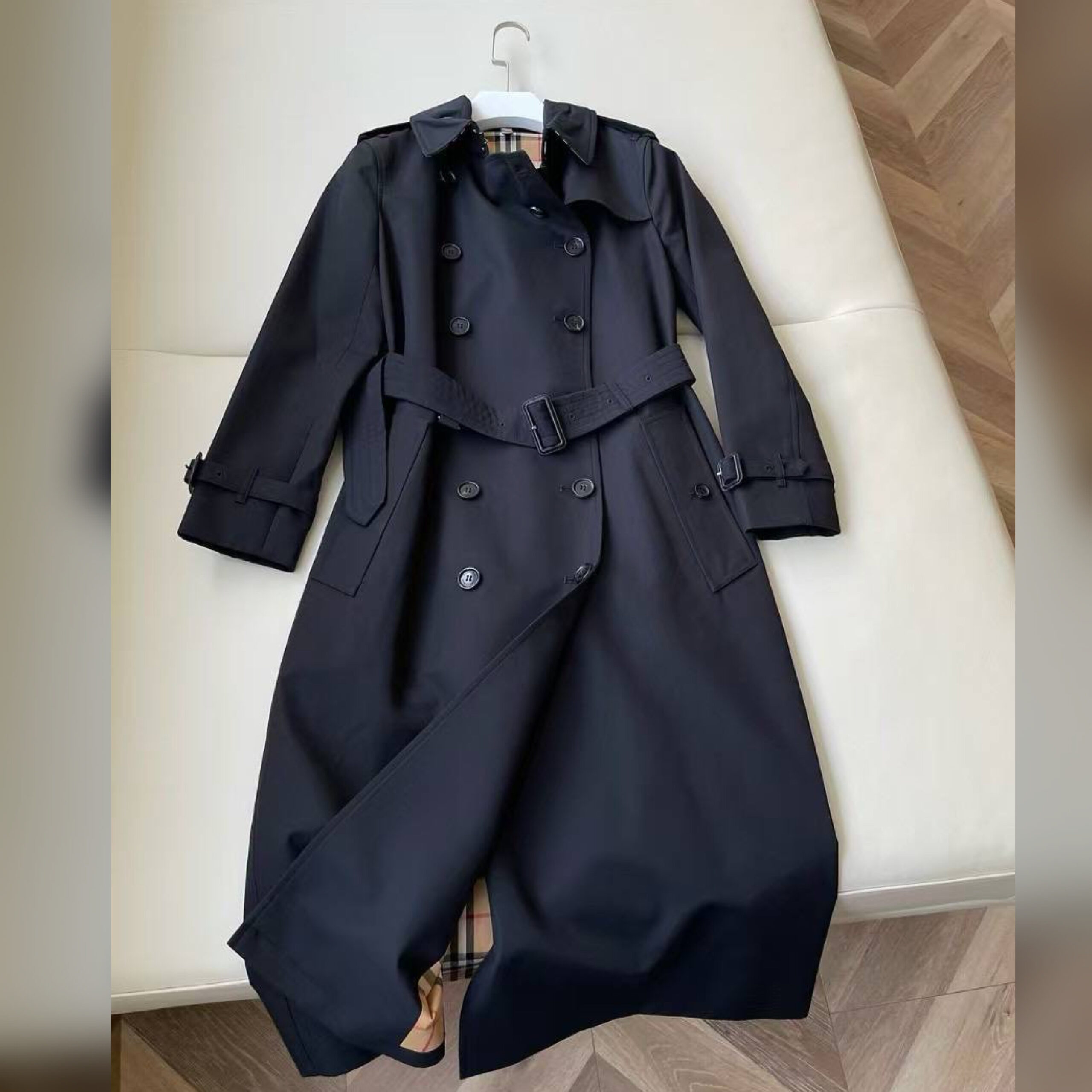 О принадлежности бренду напоминает знаковая клетка Burberry Check на подкладе и изнанке воротника с ремешком.