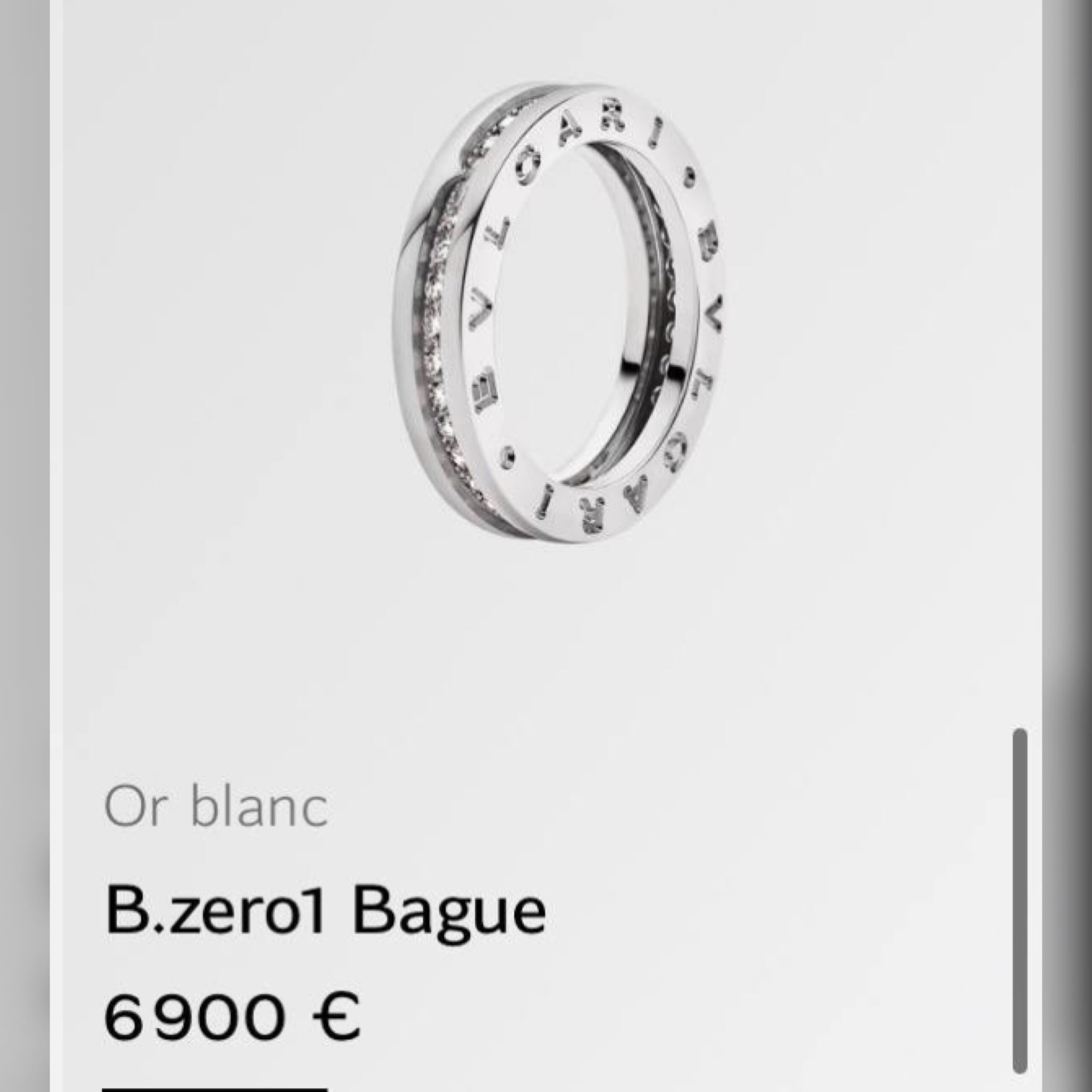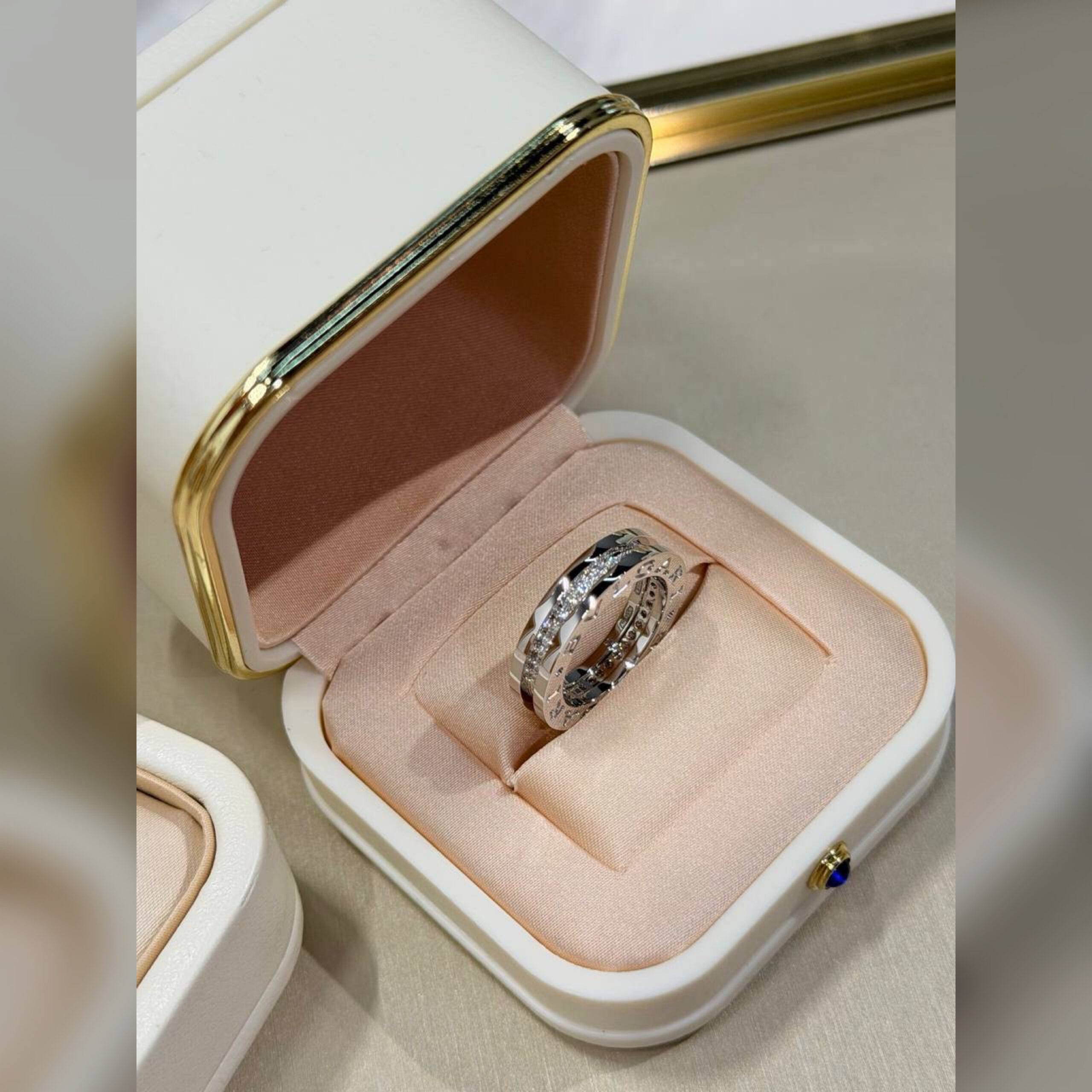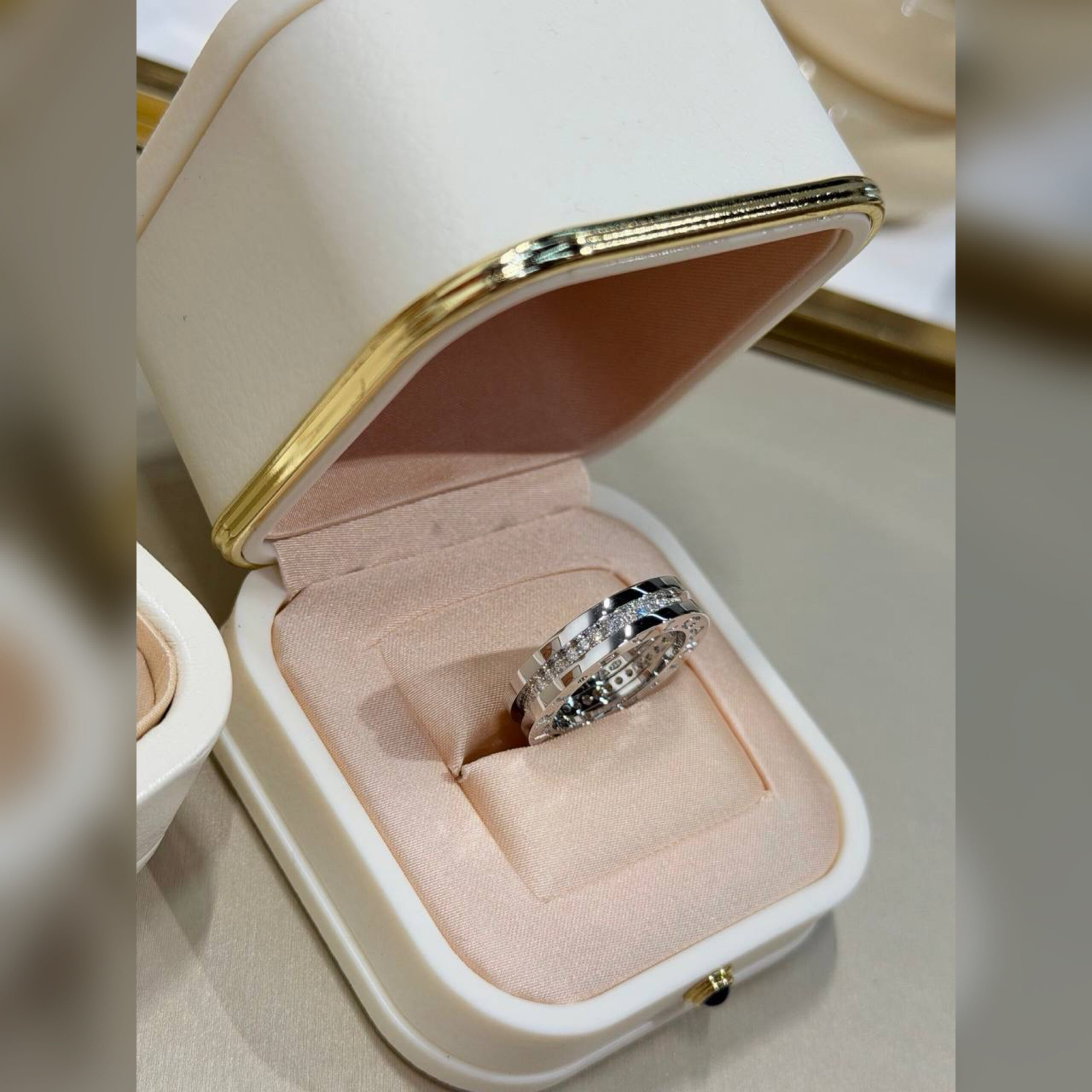 Коллекция B.zero1, настоящая легенда с 1999 года, бросает вызов устоявшимся канонам и тенденциям благодаря фирменному сочетанию римского наследия, индустриального дизайна и инновационных технологий. Кольцо в один виток из белого золота 18 карат с бриллиантовым паве на спирали передает вневременную эстетику римской архитектуры. Мгновенно узнаваемая модель представляет собой авангардное выражение творческого видения и неустанного стремления к инновациям Bvlgari.