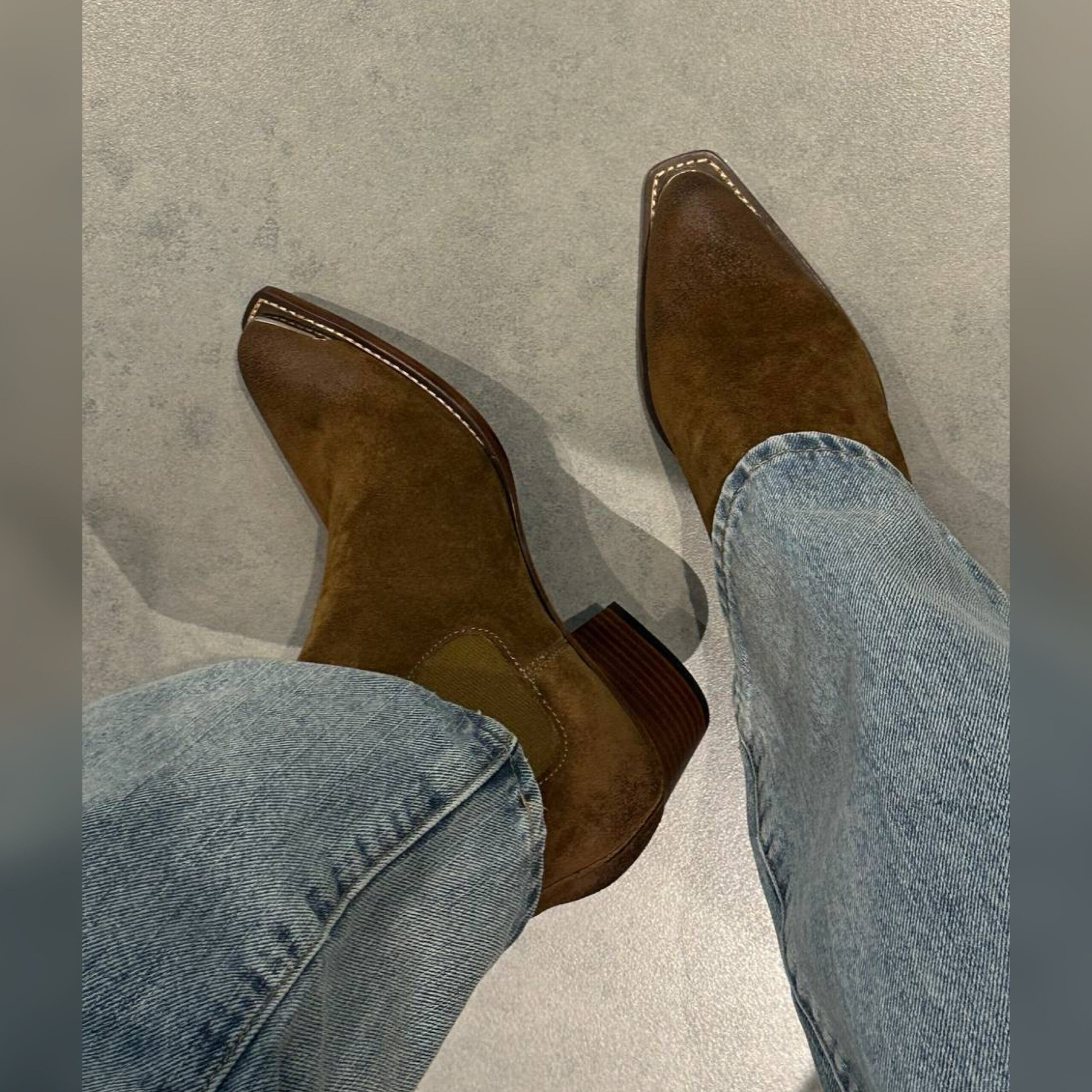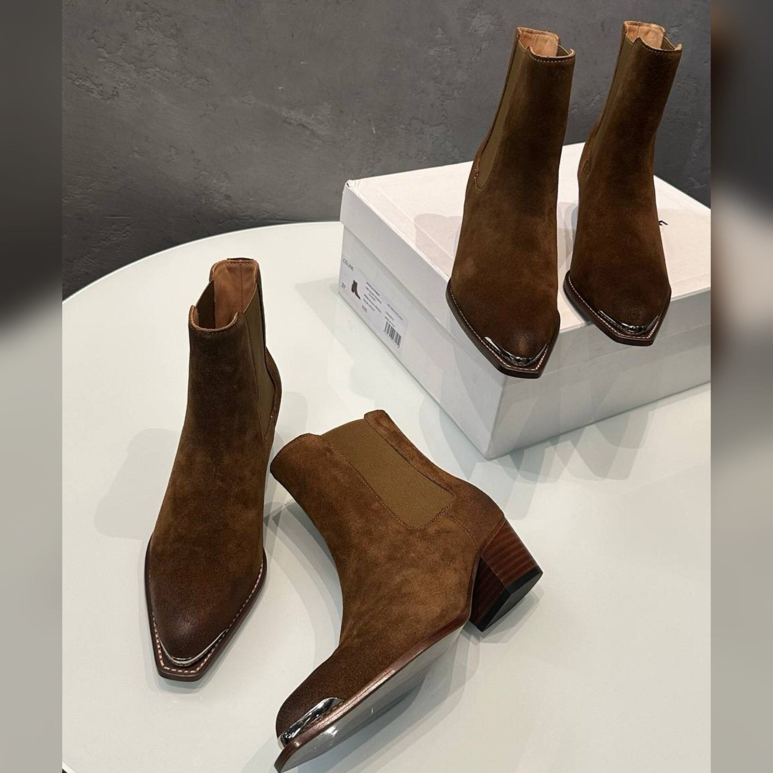 Миндалевидный мыс ботильонов подчеркнули металлической накладкой. Пару на выступающей подошве с широким скошенным каблуком сшили из замши, отделав внутри телячьей кожей. По бокам предусмотрели широкие эластичные вставки, поэтому модель не нуждается в застежке.