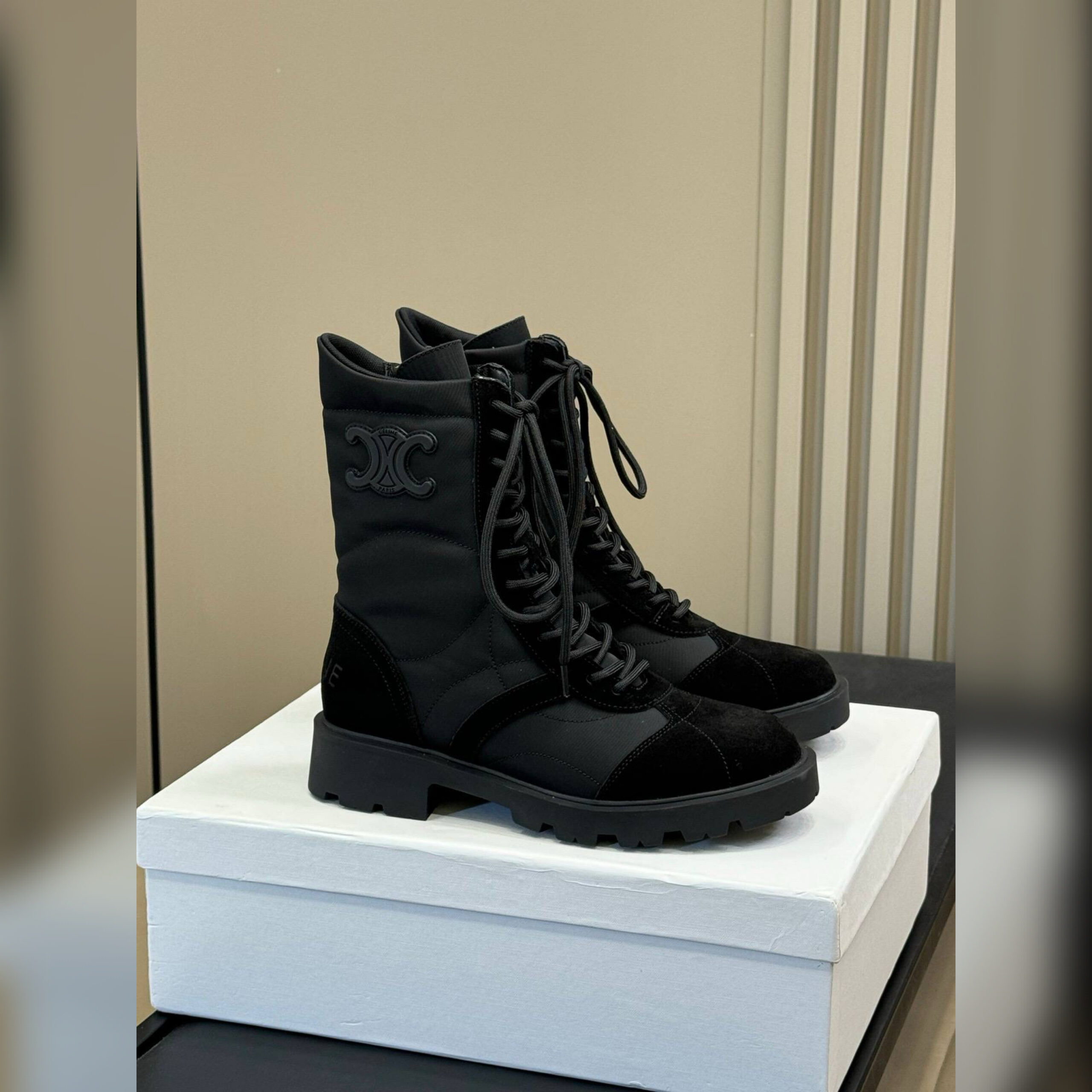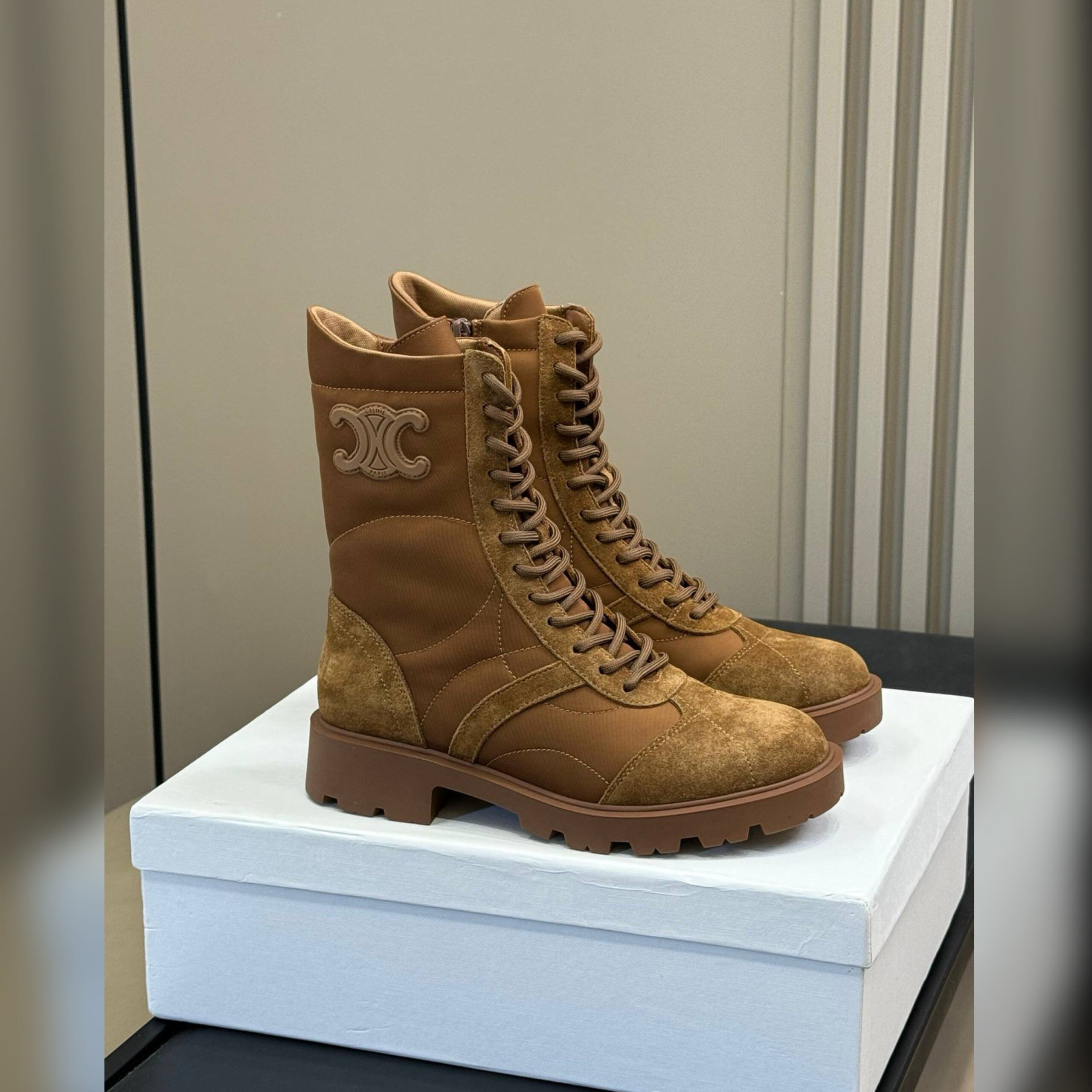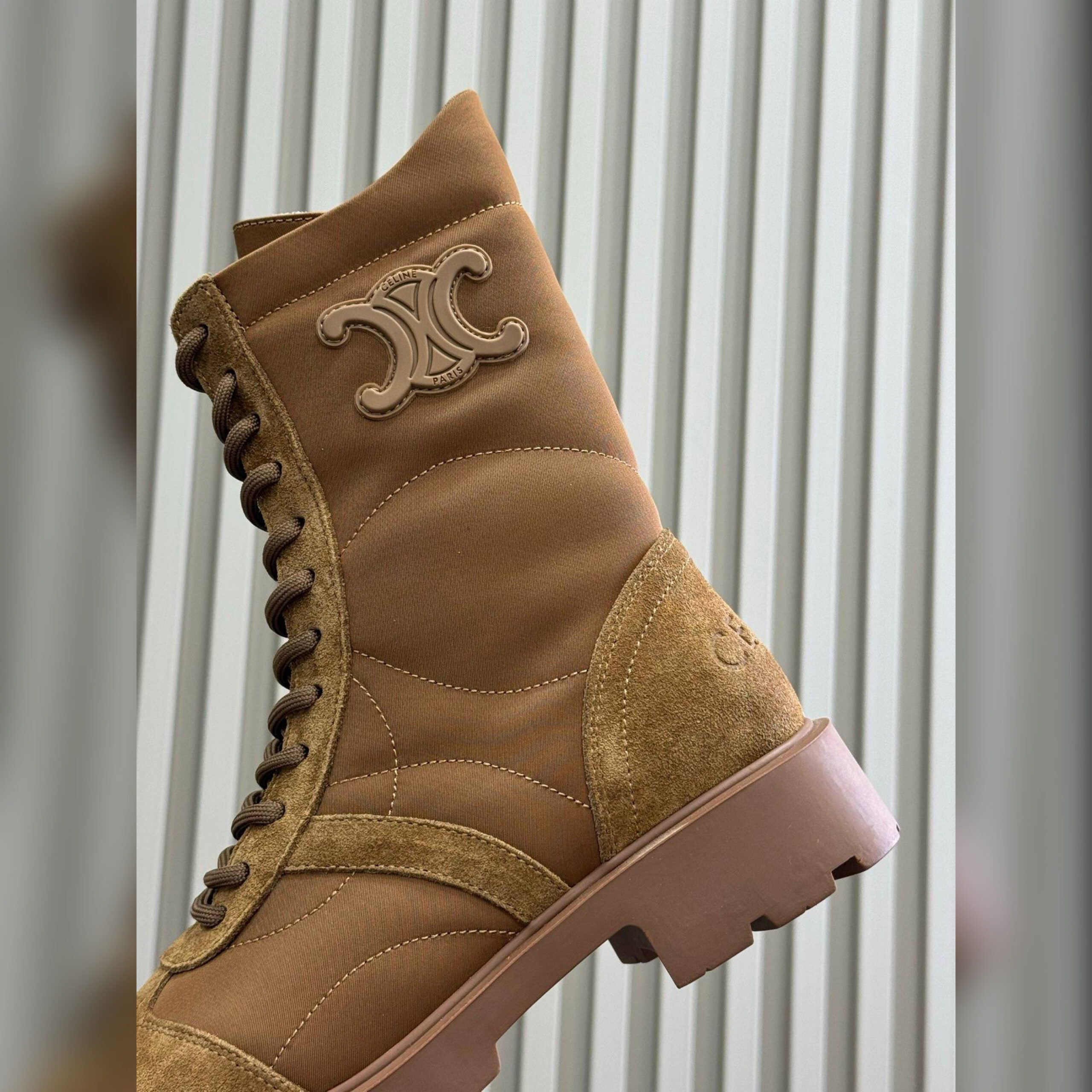 Голенище изделия украсили резиновыми патчами Triomphe, а сзади — тисненым логотипом Celine.