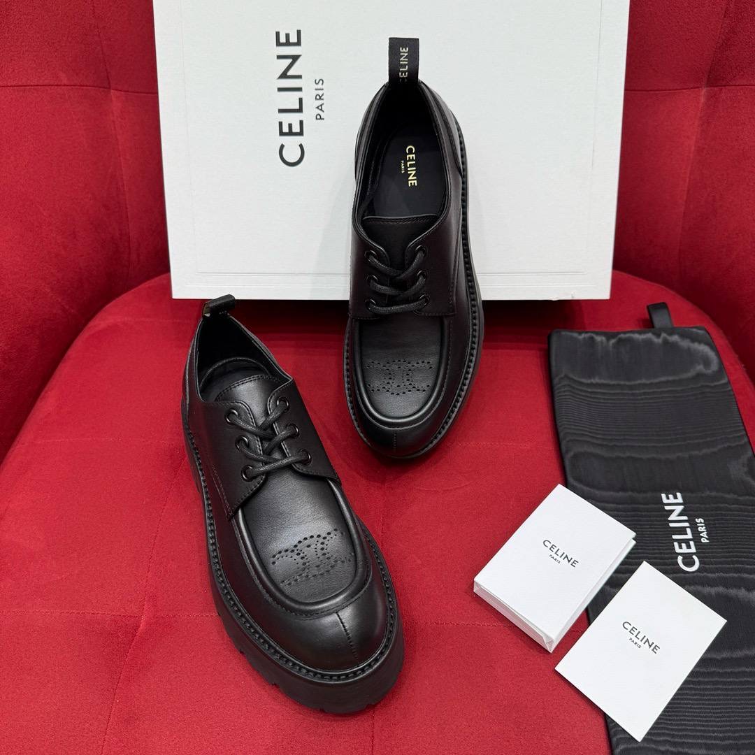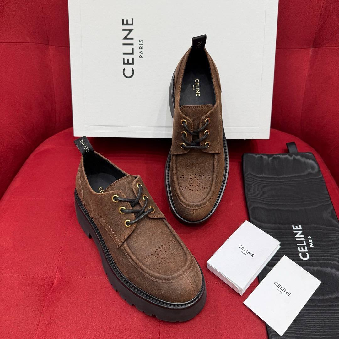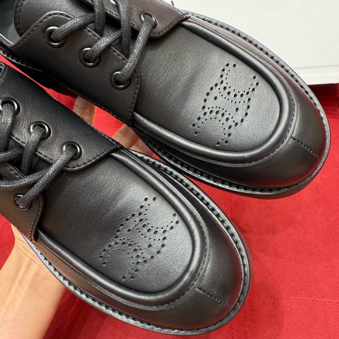 Дерби поставили на выступающую протекторную подошву и широкий каблук. Для изготовления моделей с округлым мысом, очерченным рельефным швом, использовали мягкую мелкозернистую кожу и бархатистую замшу.