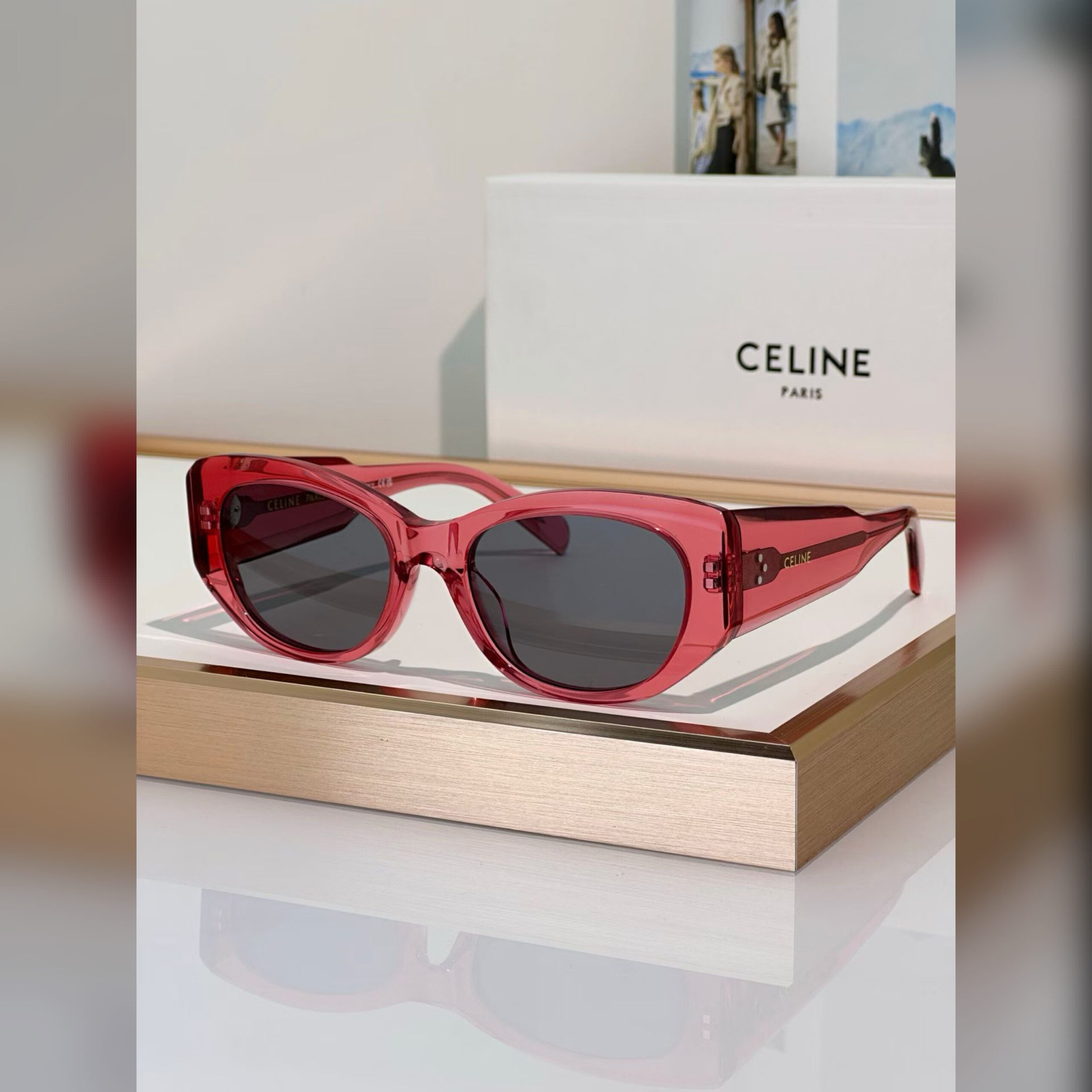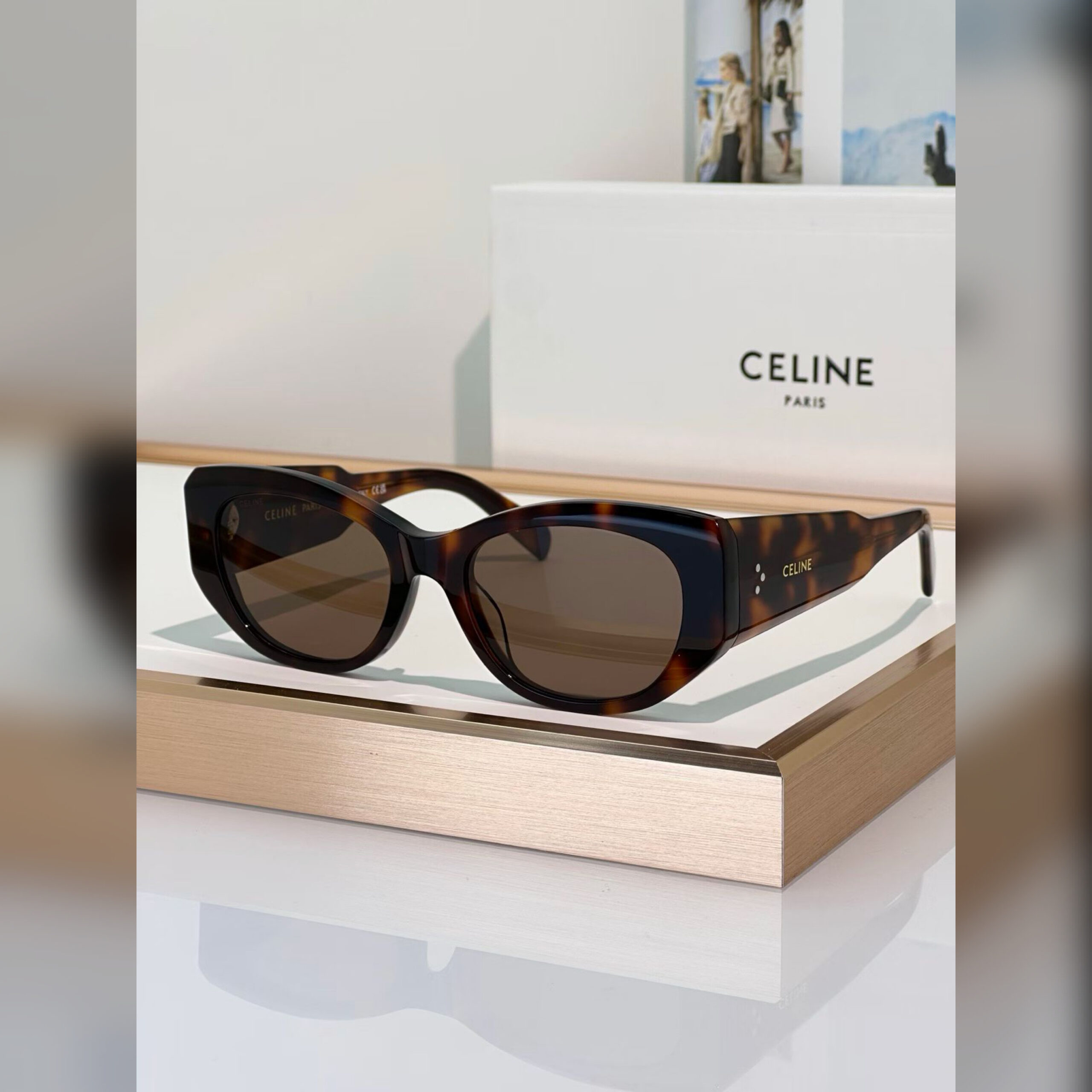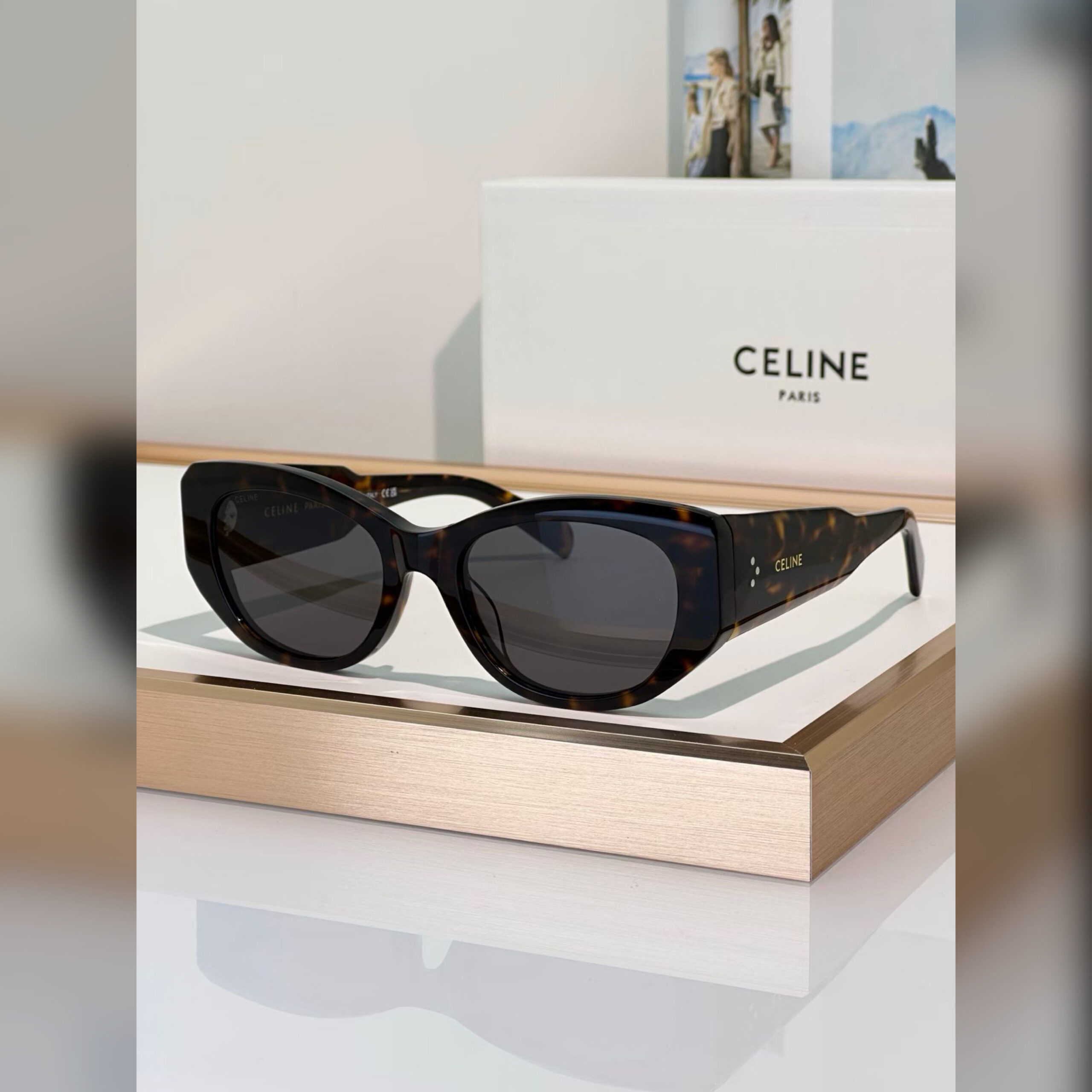 Подпись Celine и три точки на дужках добавили этим очкам фирменной эстетики, не нарушив их лаконичность. Она стала единственной деталью на широкой оправе из ацетата