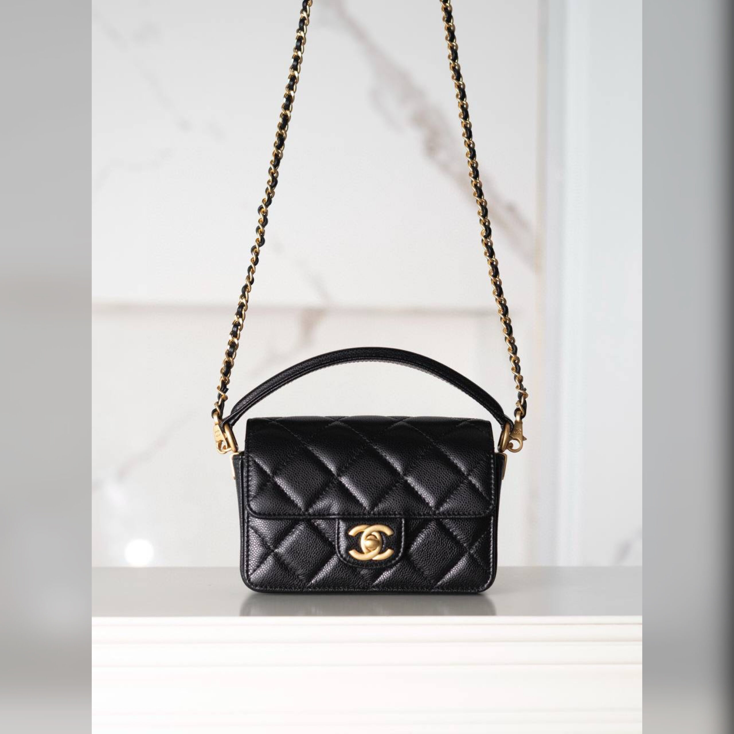 Фирменный знак сумок Chanel — двойная застежка C — расположена спереди на откидном клапане.