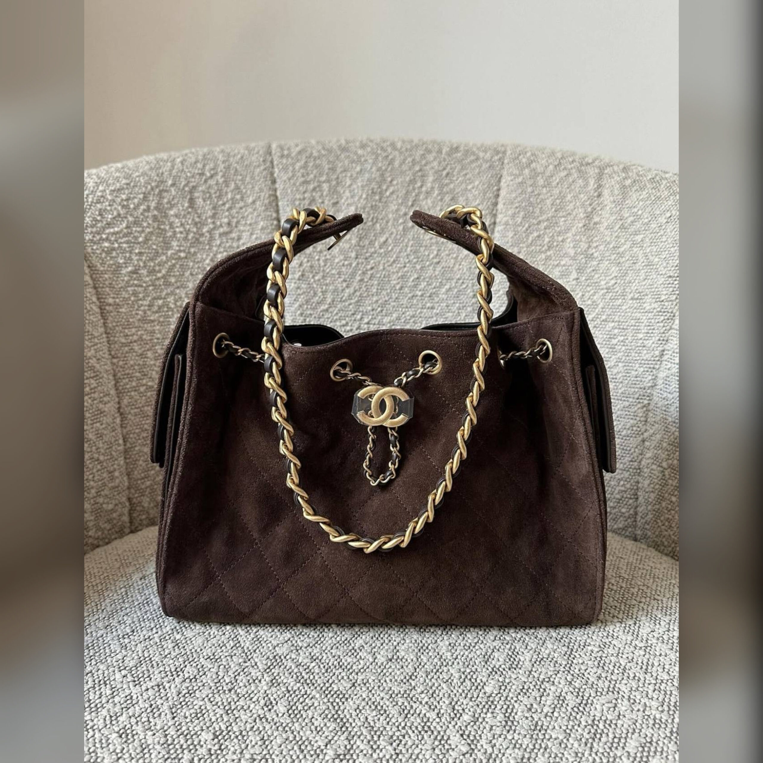 Классические элементы Chanel, такие как культовые эмблемы CC и стеганый ромбовидный узор интегрированы в современный и функциональный дизайн изделия из мягкой фактурной замши.