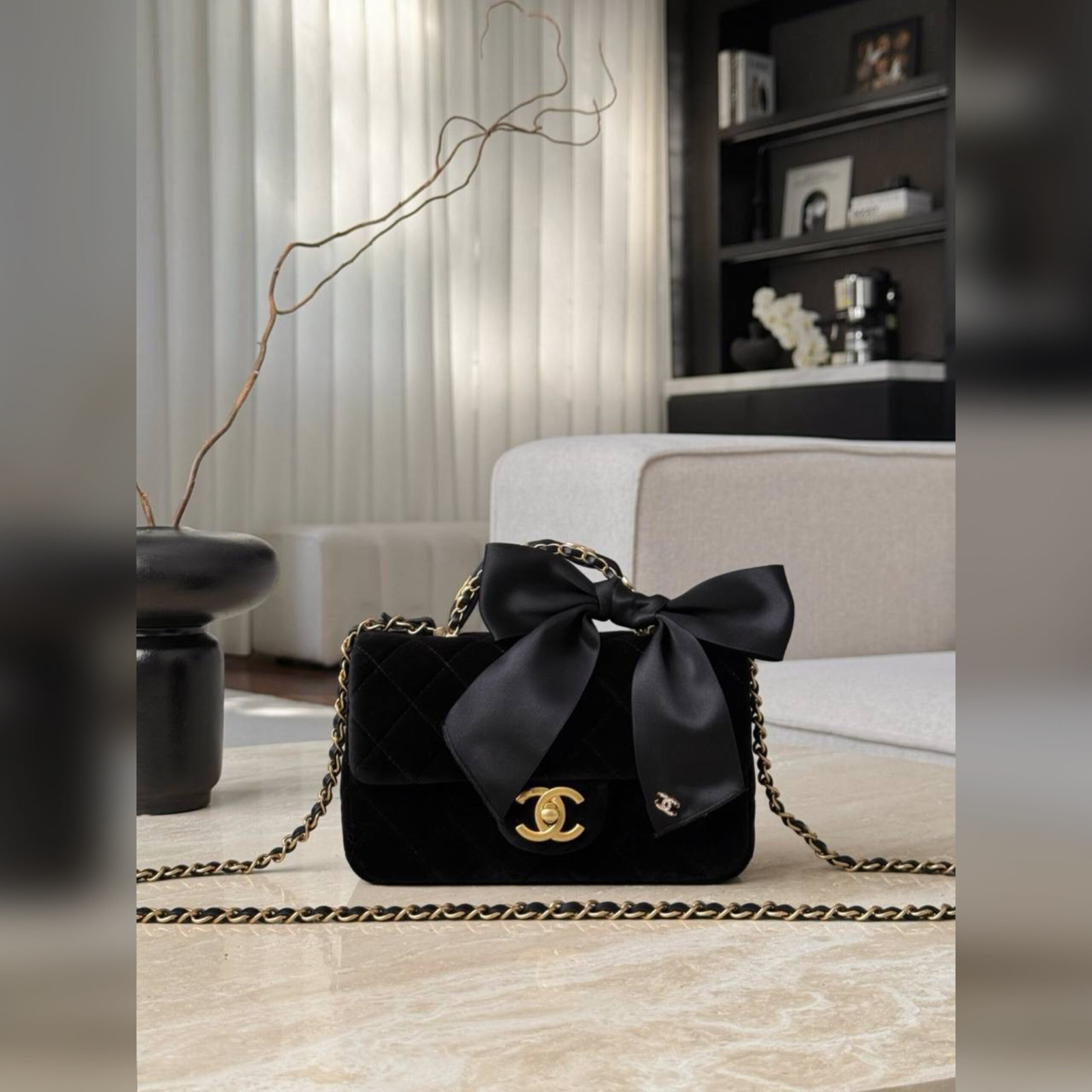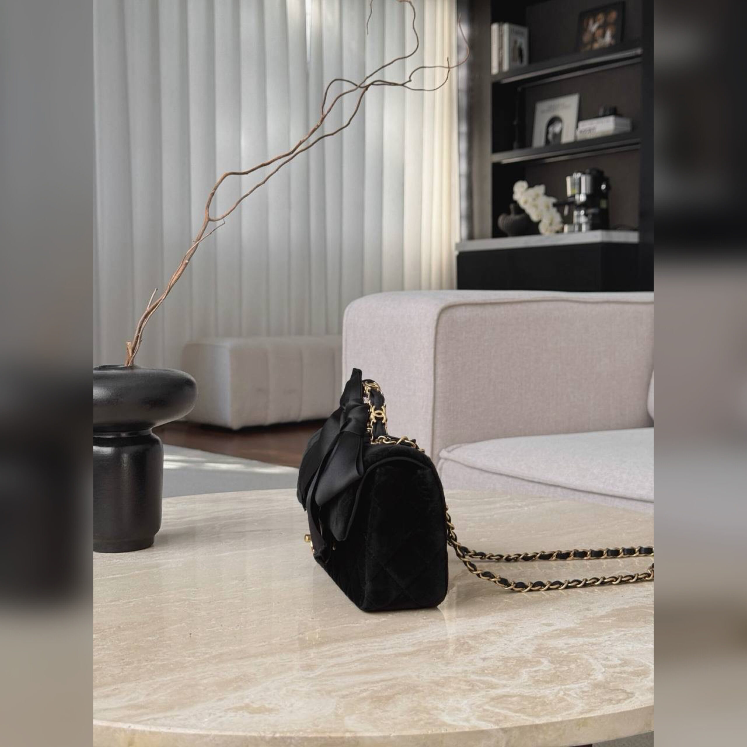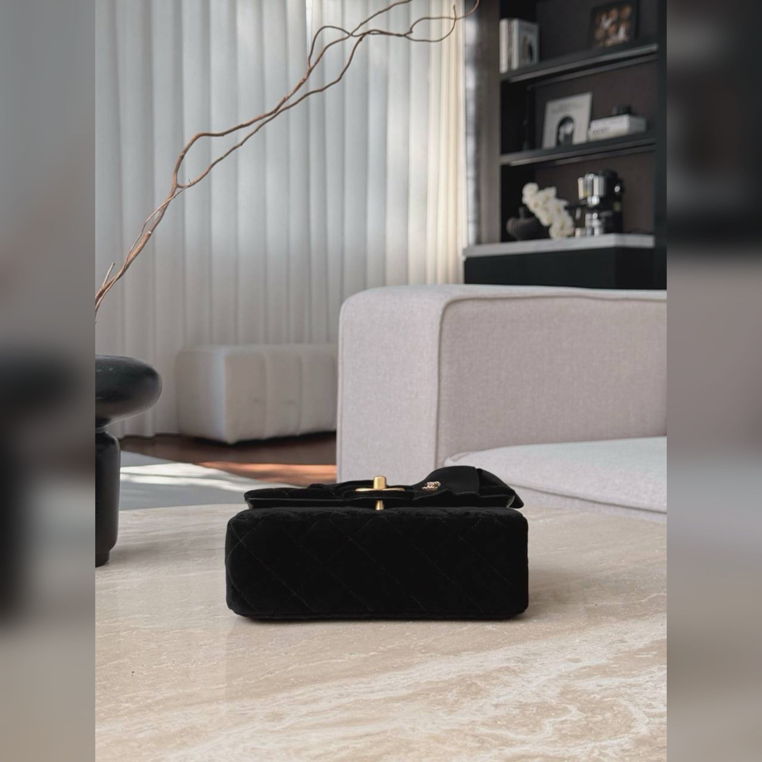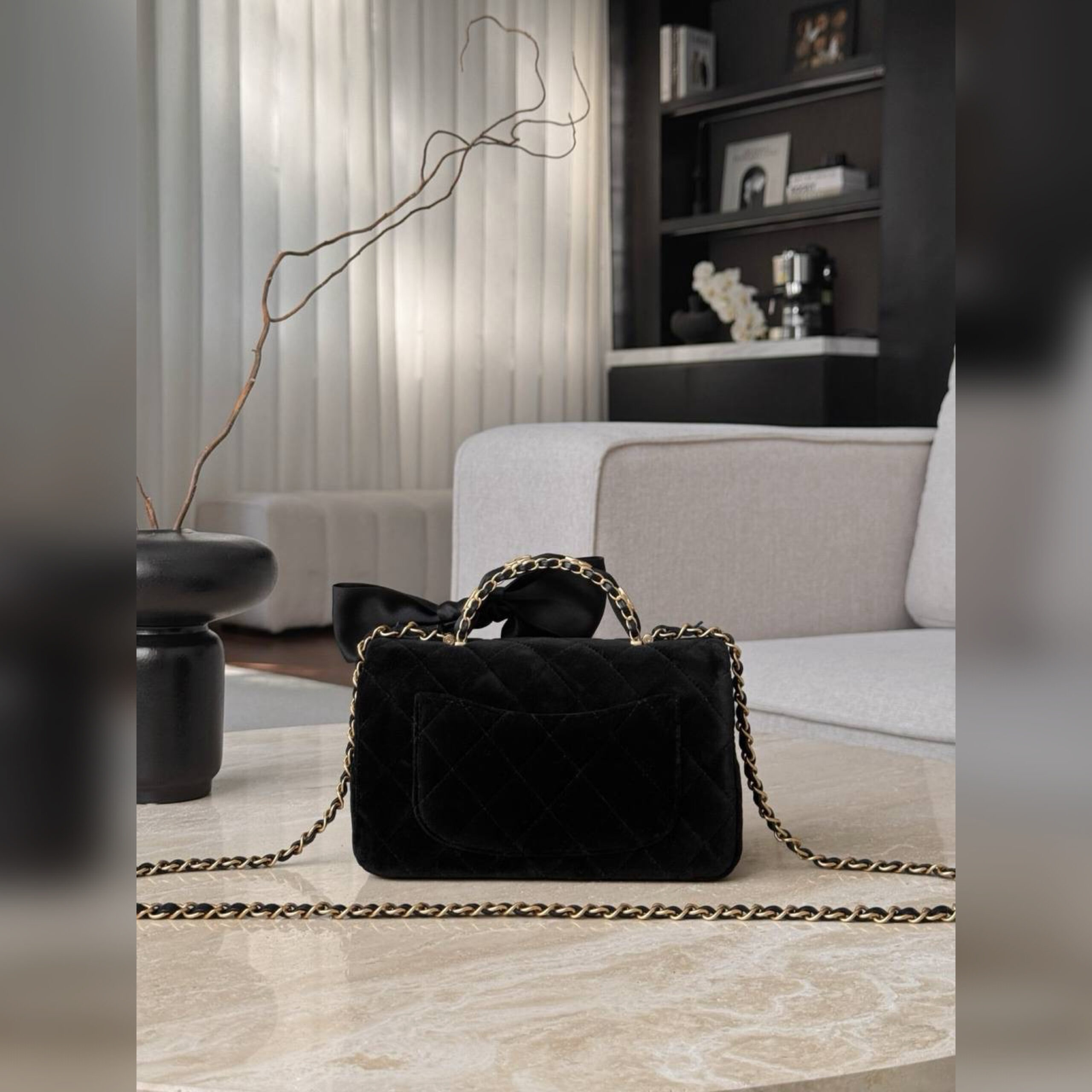 Сдержанный черный цвет сумки из приятного на ощупь мягкого бархата дизайнеры марки компенсировали стеганым ромбовидным узором, громко заявляющим о принадлежности бренду.