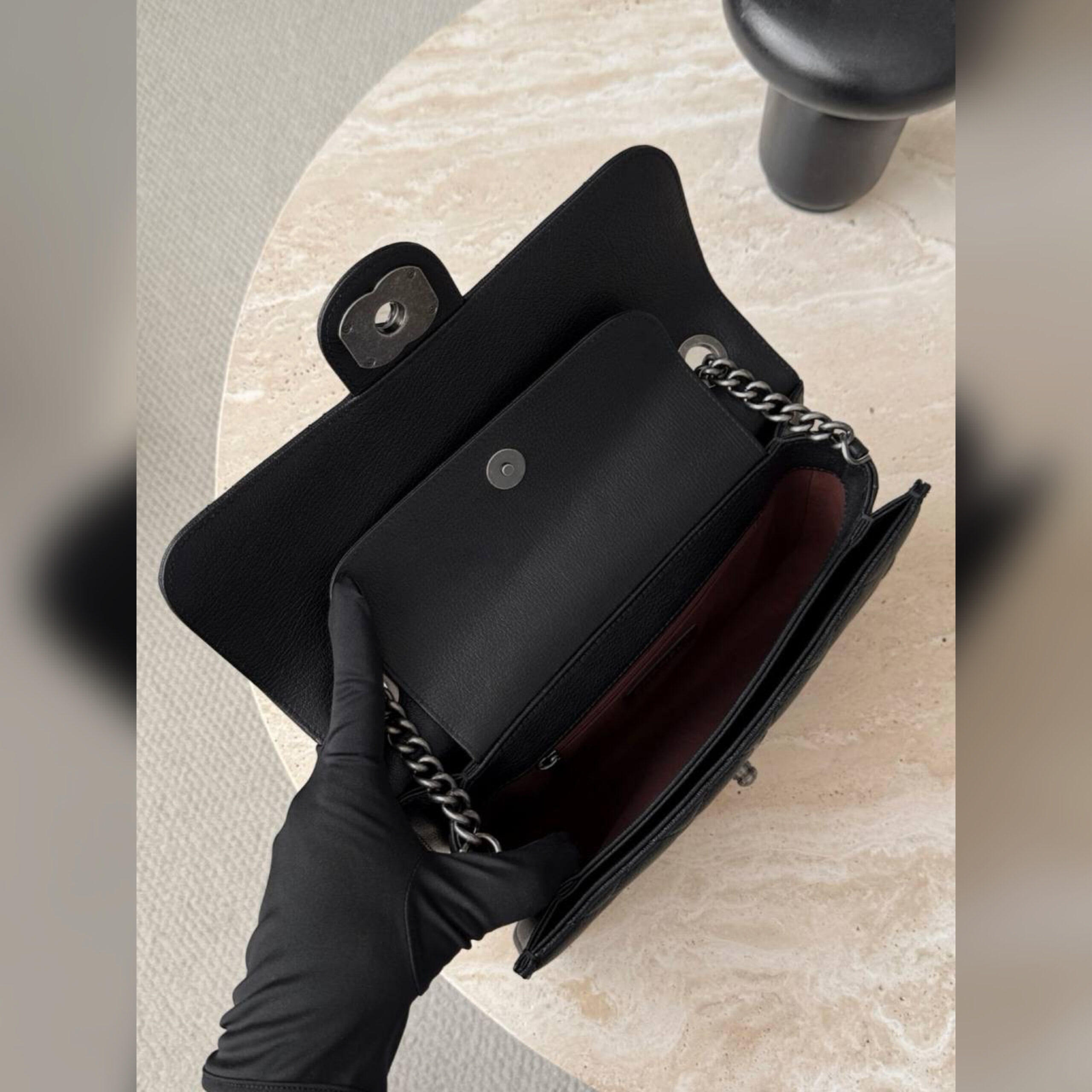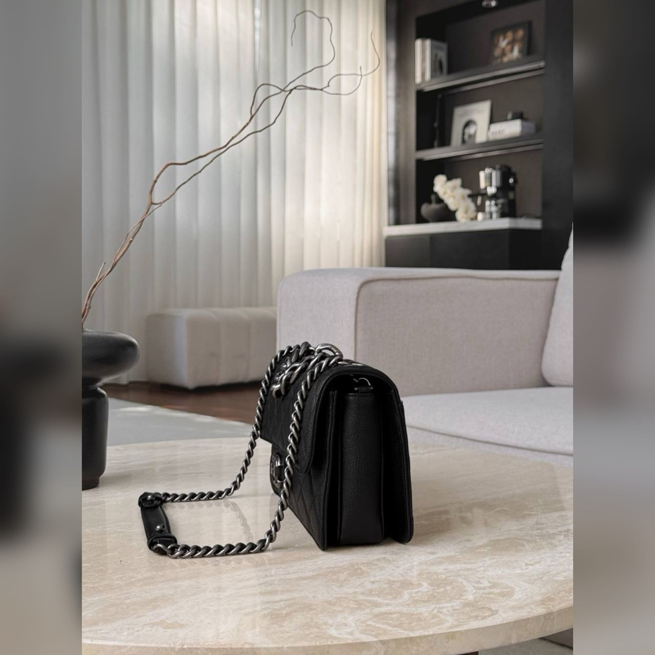 Модель дополнили ремнем- цепочкой с кожаной вставкой и массивной ручкой, позволяющим носить сумку в различных вариациях и освободить руки.