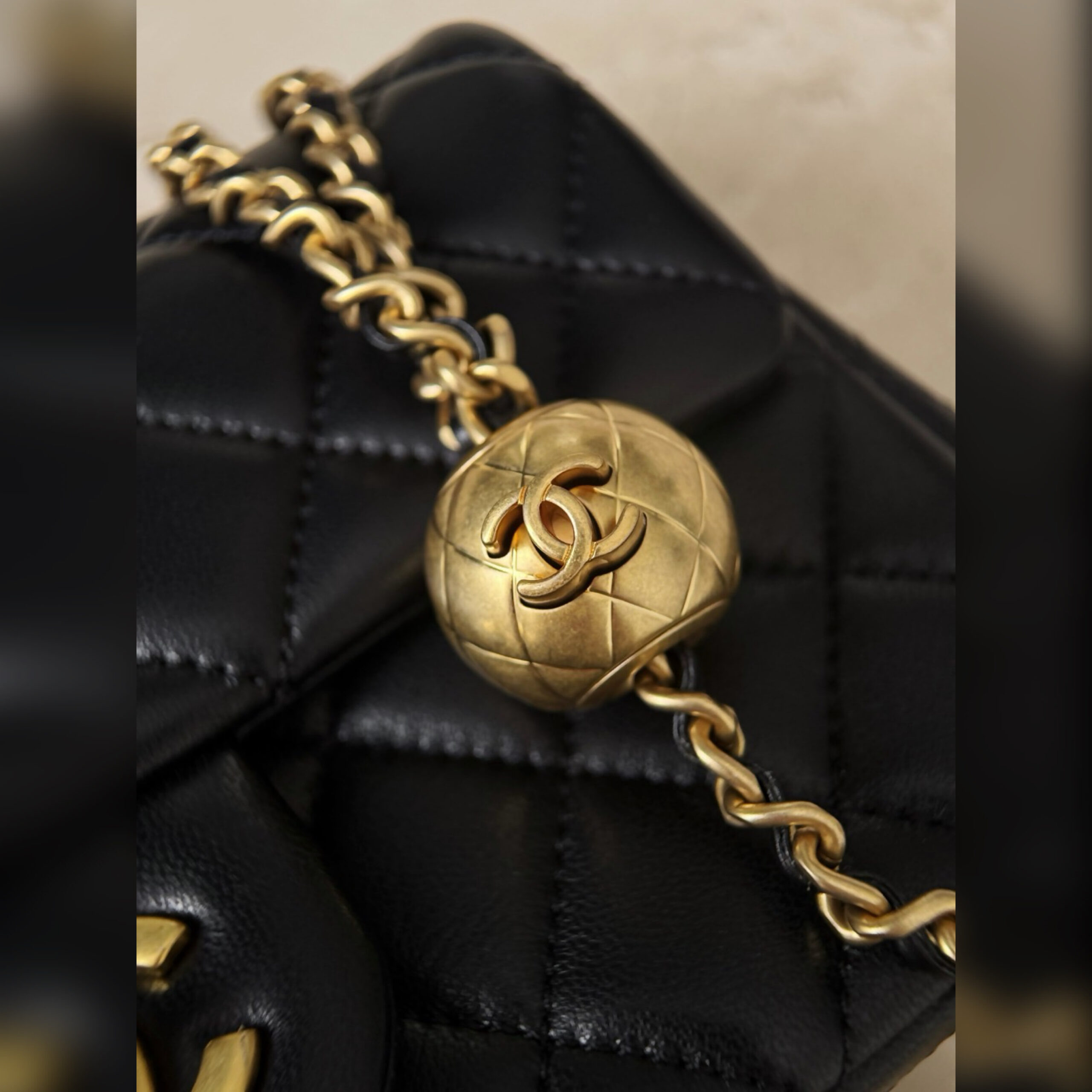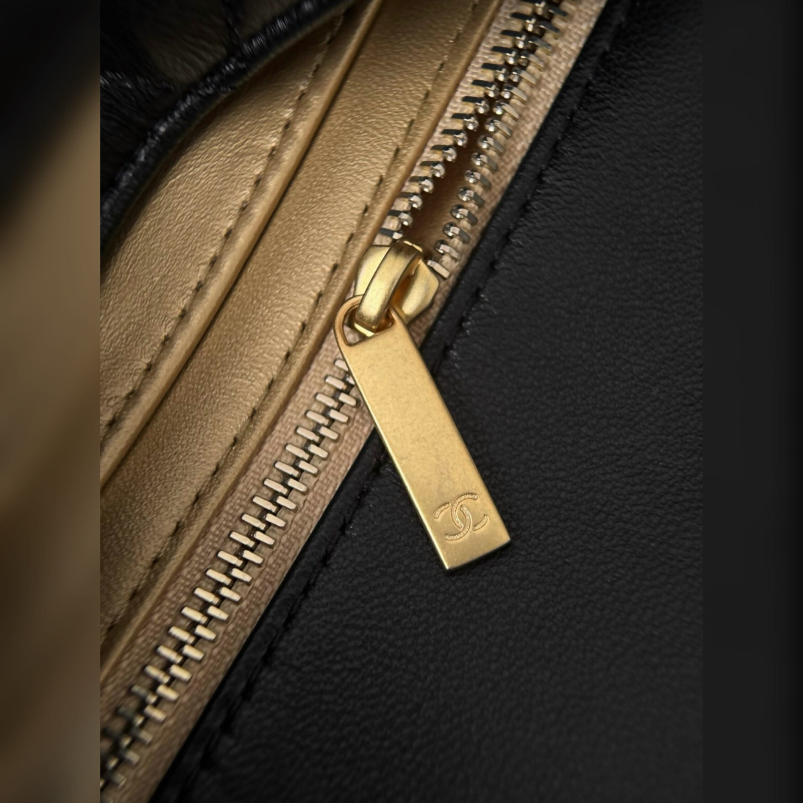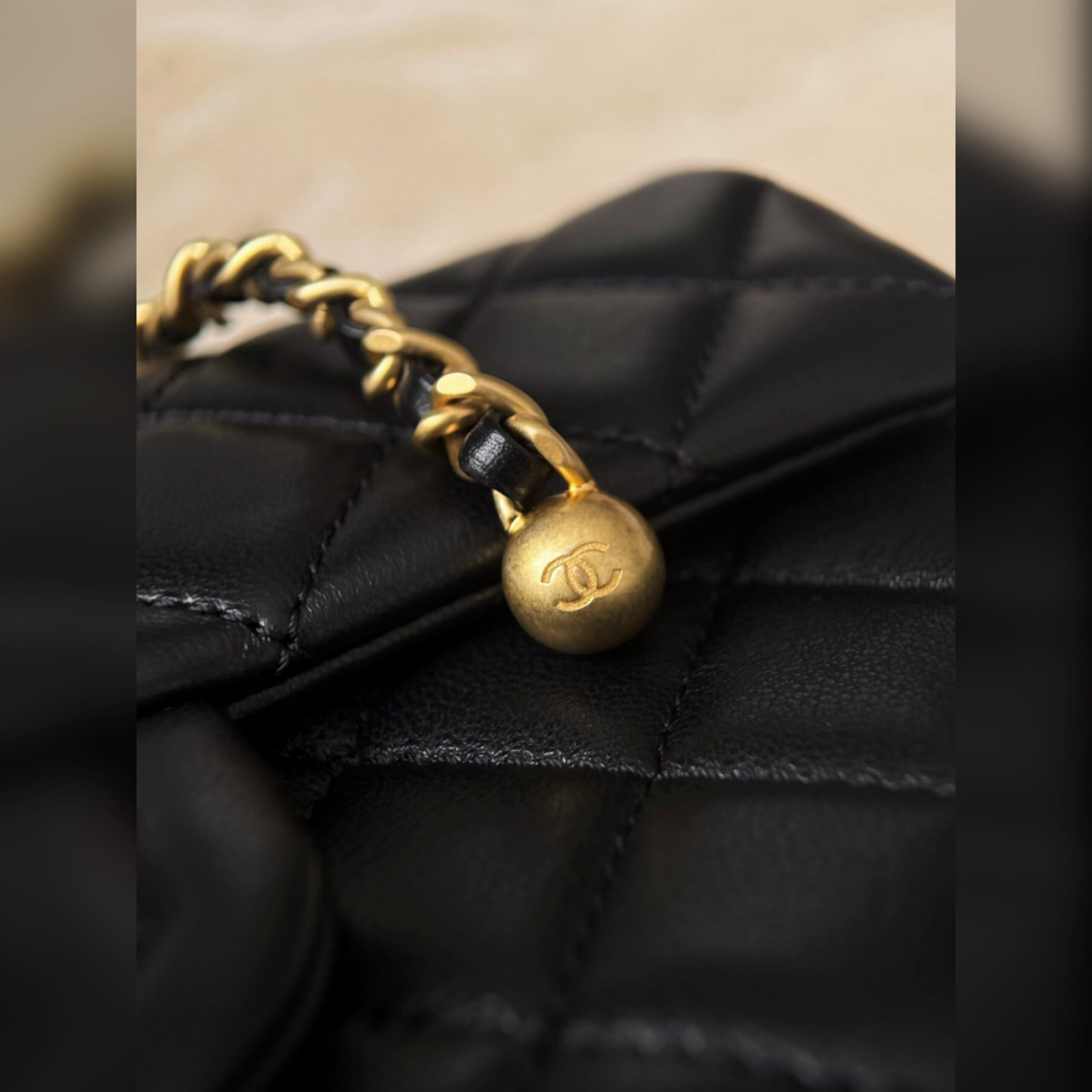 На эффектном фоне деликатные акценты расставляет золотистая фурнитура и знаковый поворотный замок в виде двойной буквы С.