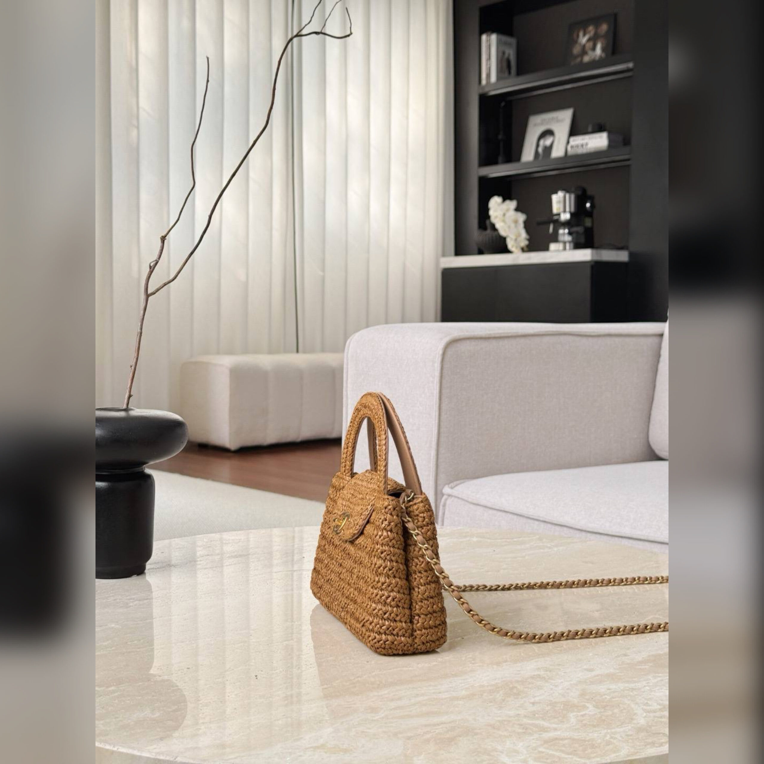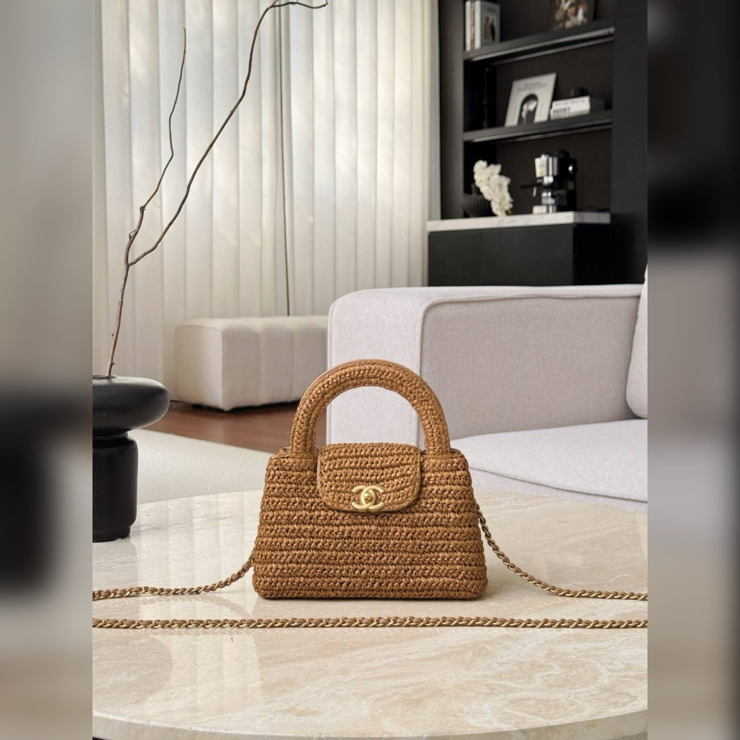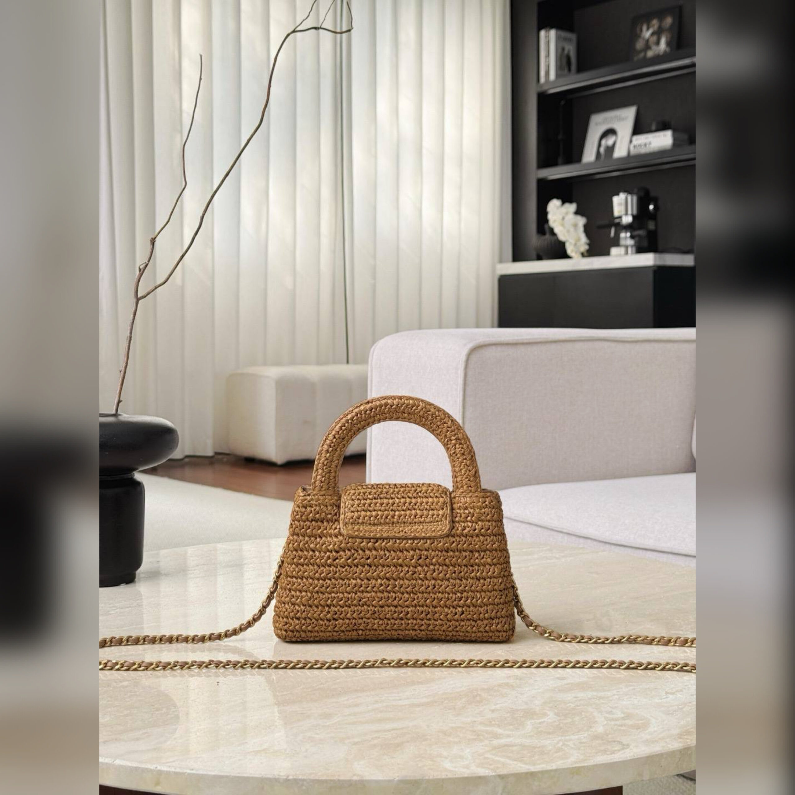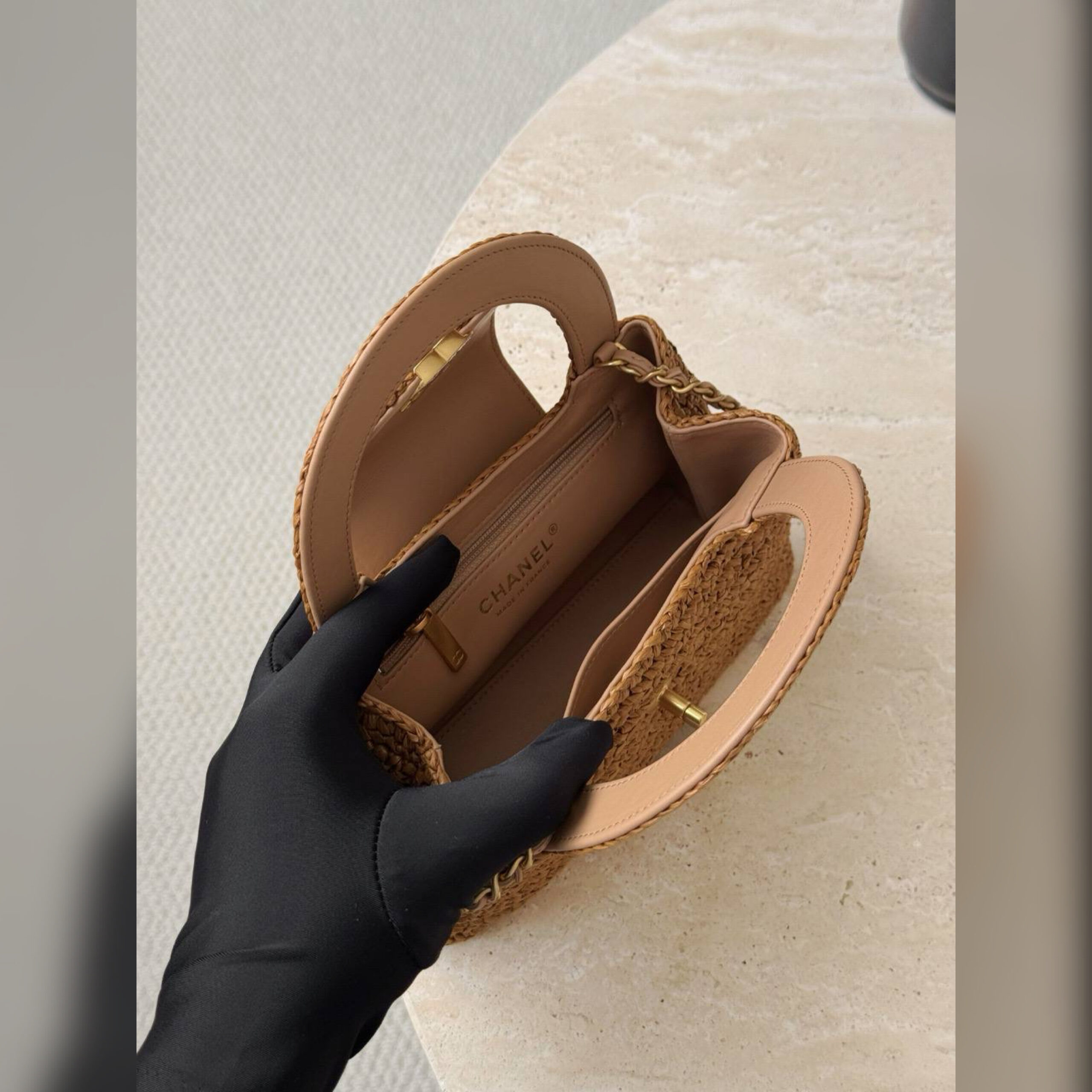 Миниатюрную сумку с культовым плечевым ремнем-цепочкой сплели из рафии, а внутреннюю отделку выполнили из натуральной кожи. Аксессуар с жесткой ручкой закрывается клапаном с поворотным замком, украшенным монограммой СС.