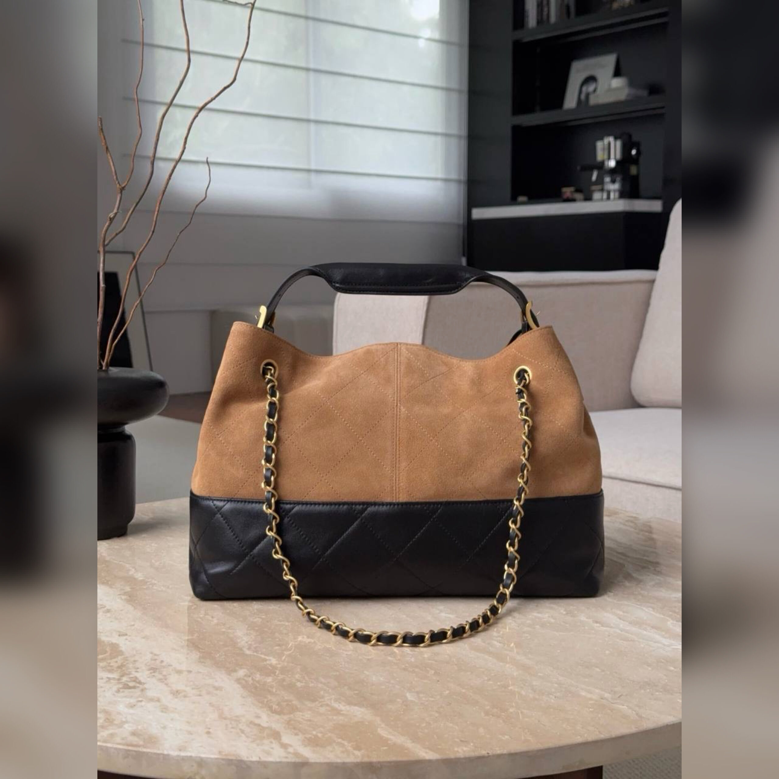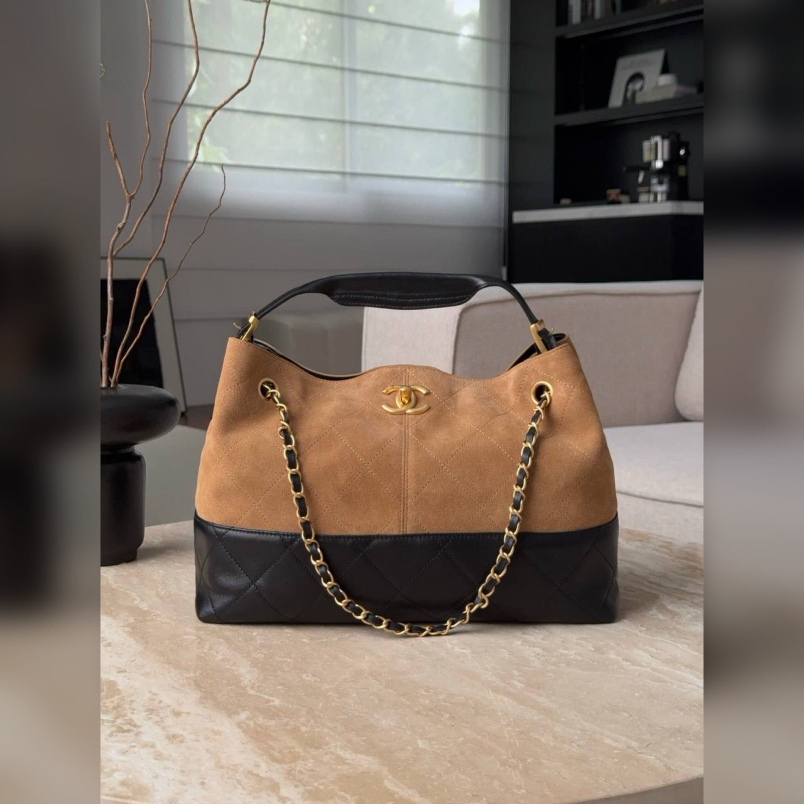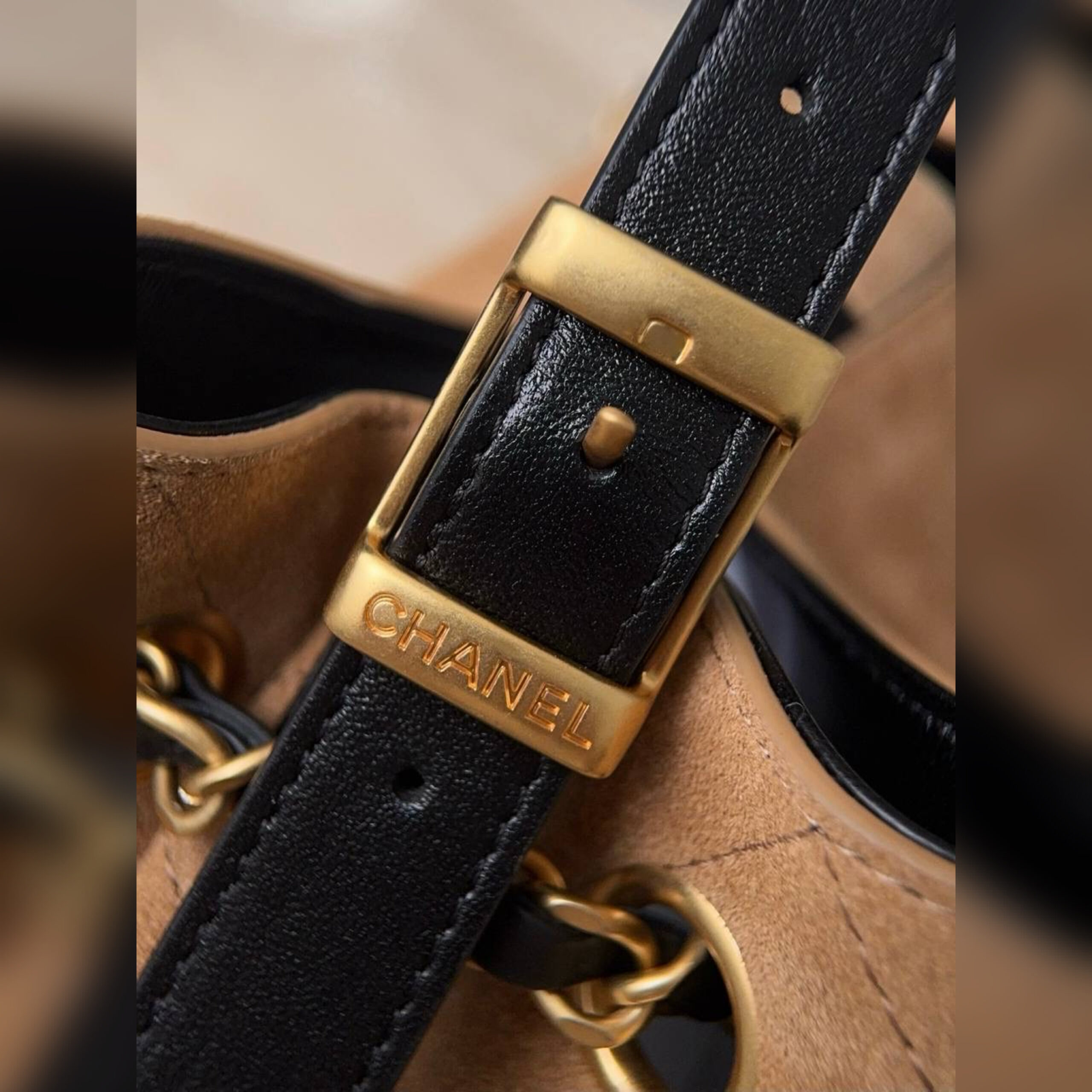 Модель воплощает все традиционные коды Chanel: стеганый рисунок, металлические цепи и знаковый поворотный замок, вписанный в логотип СС. Функциональное и удобное изделие выполнено из плотной телячьей кожи и бархатистой замши.