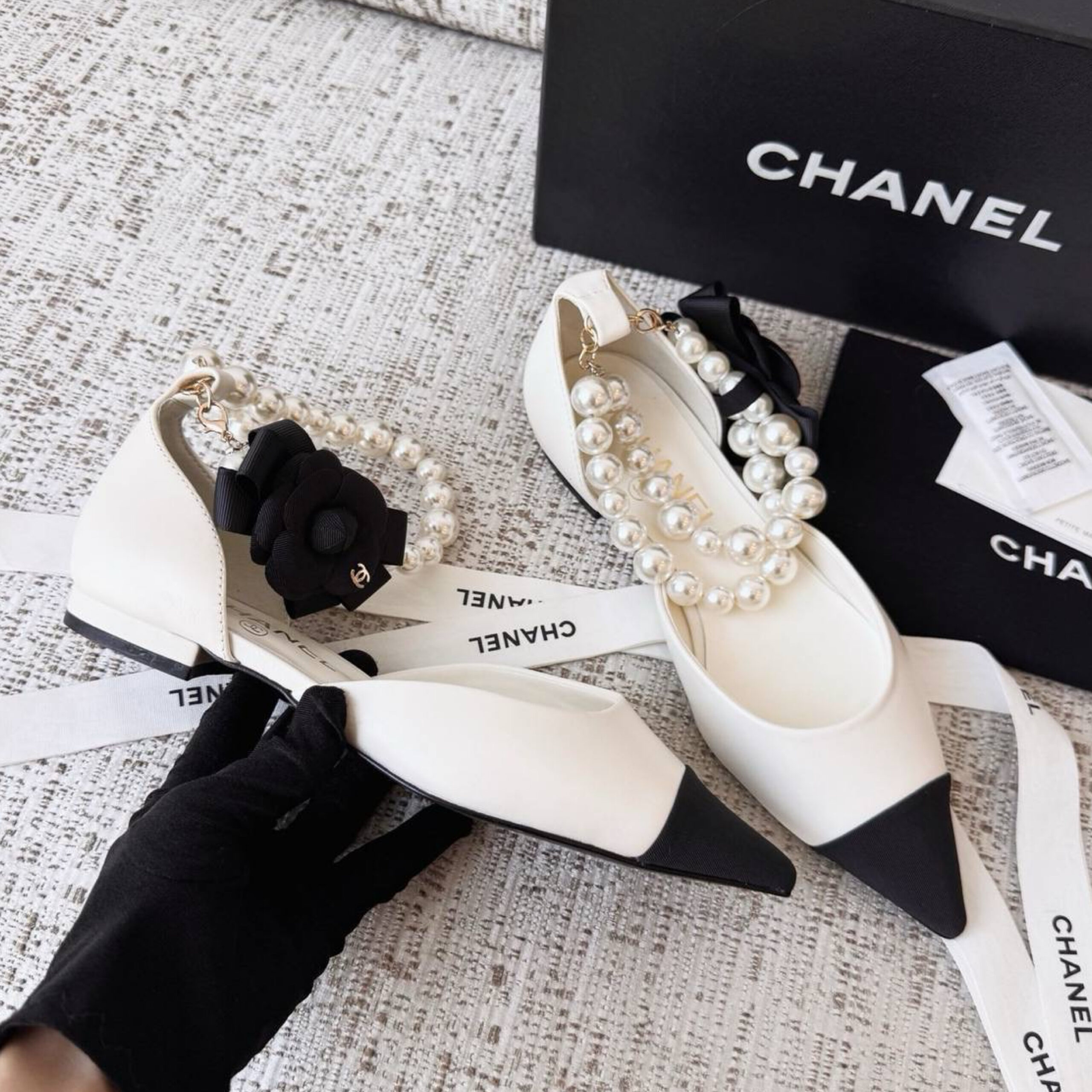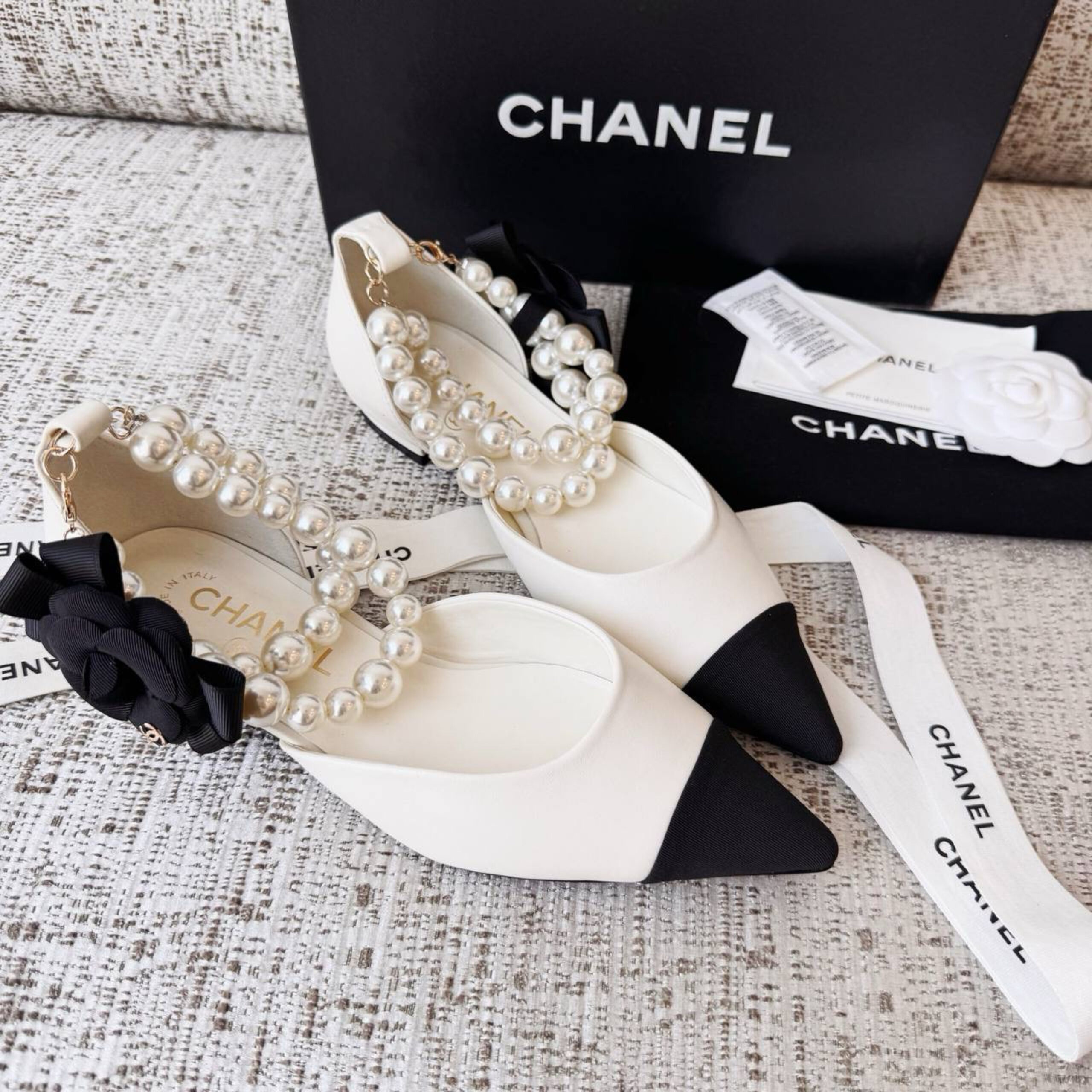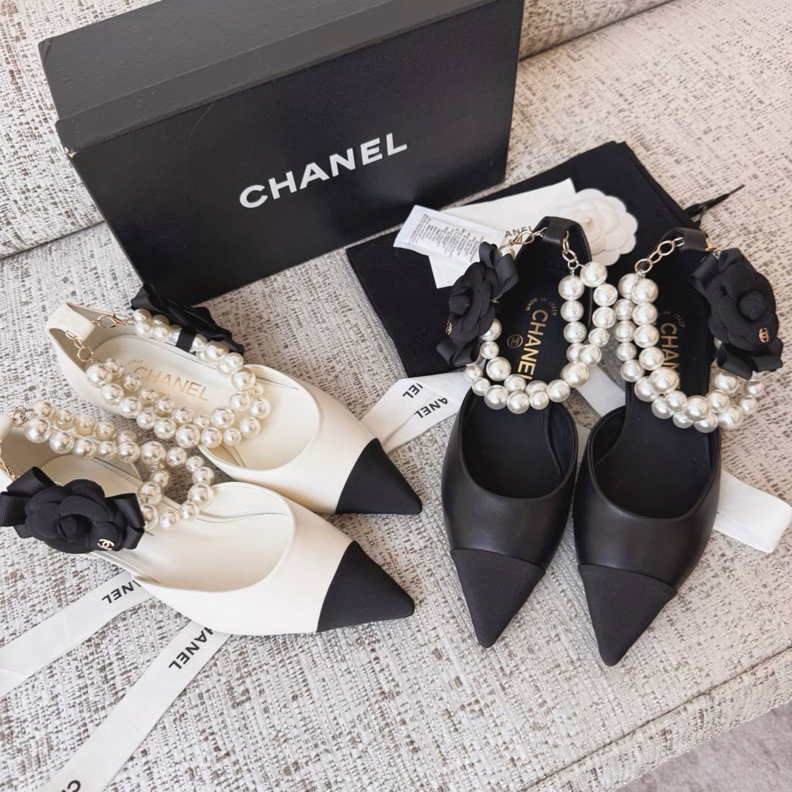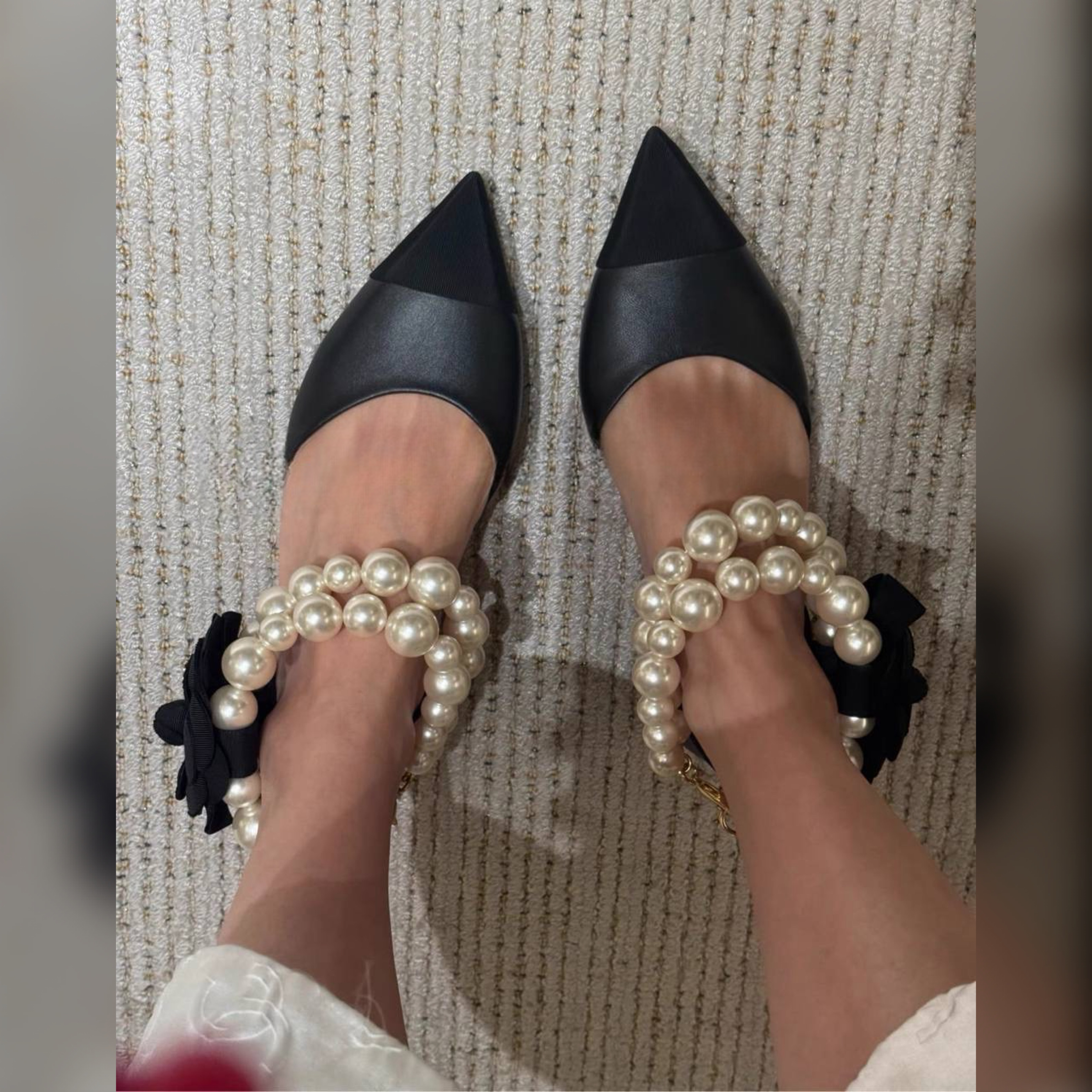 Нити из крупных перламутровых бусин, обвивающих щиколотку, и крупная брошь в виде бутона камелии завершают актуальный дизайн и подчёркивают женственность силуэта.