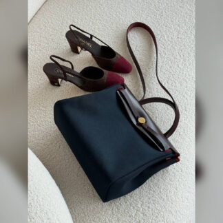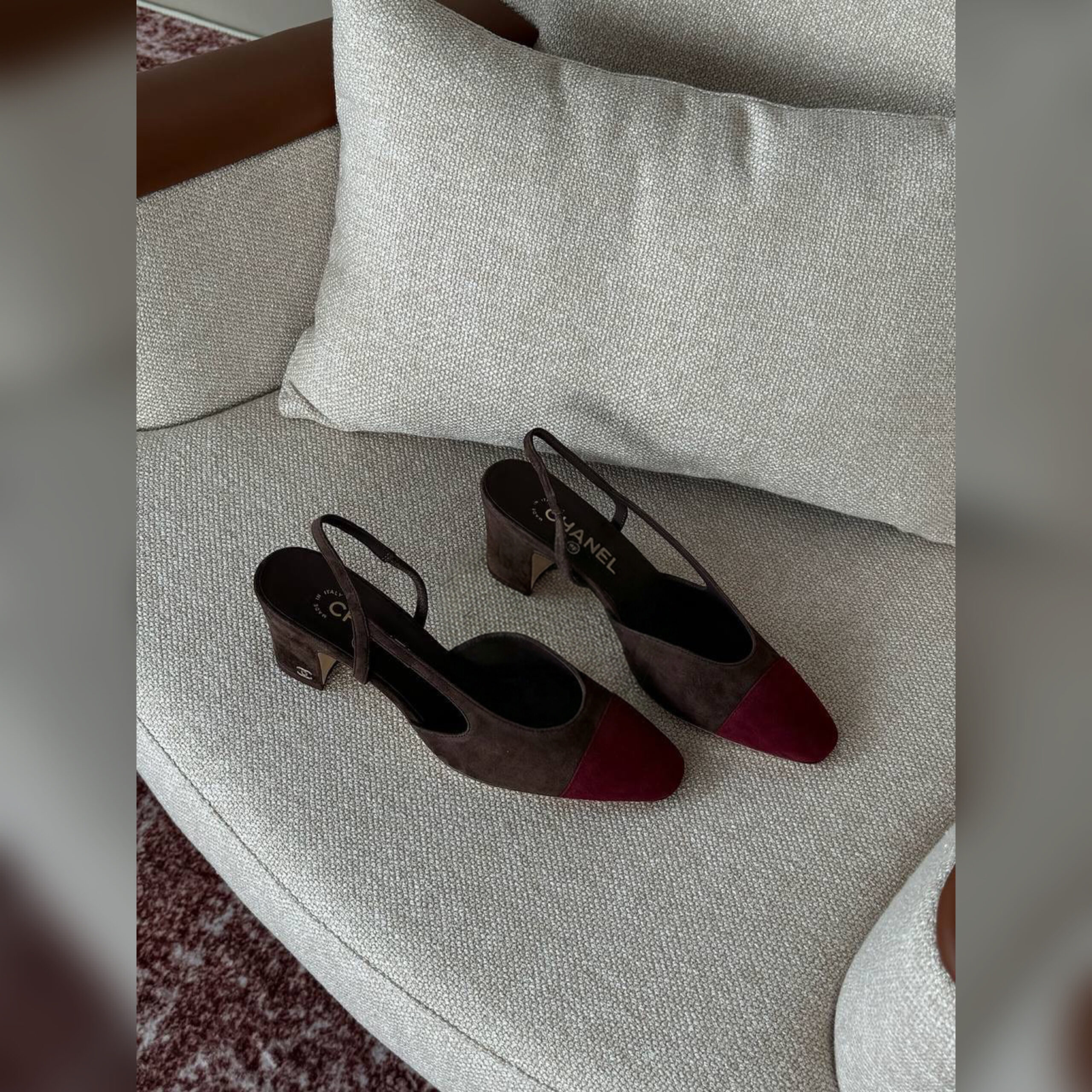 Мыс модели дополнили контрастной накладкой, а каблук украсили миниатюрной монограммой.