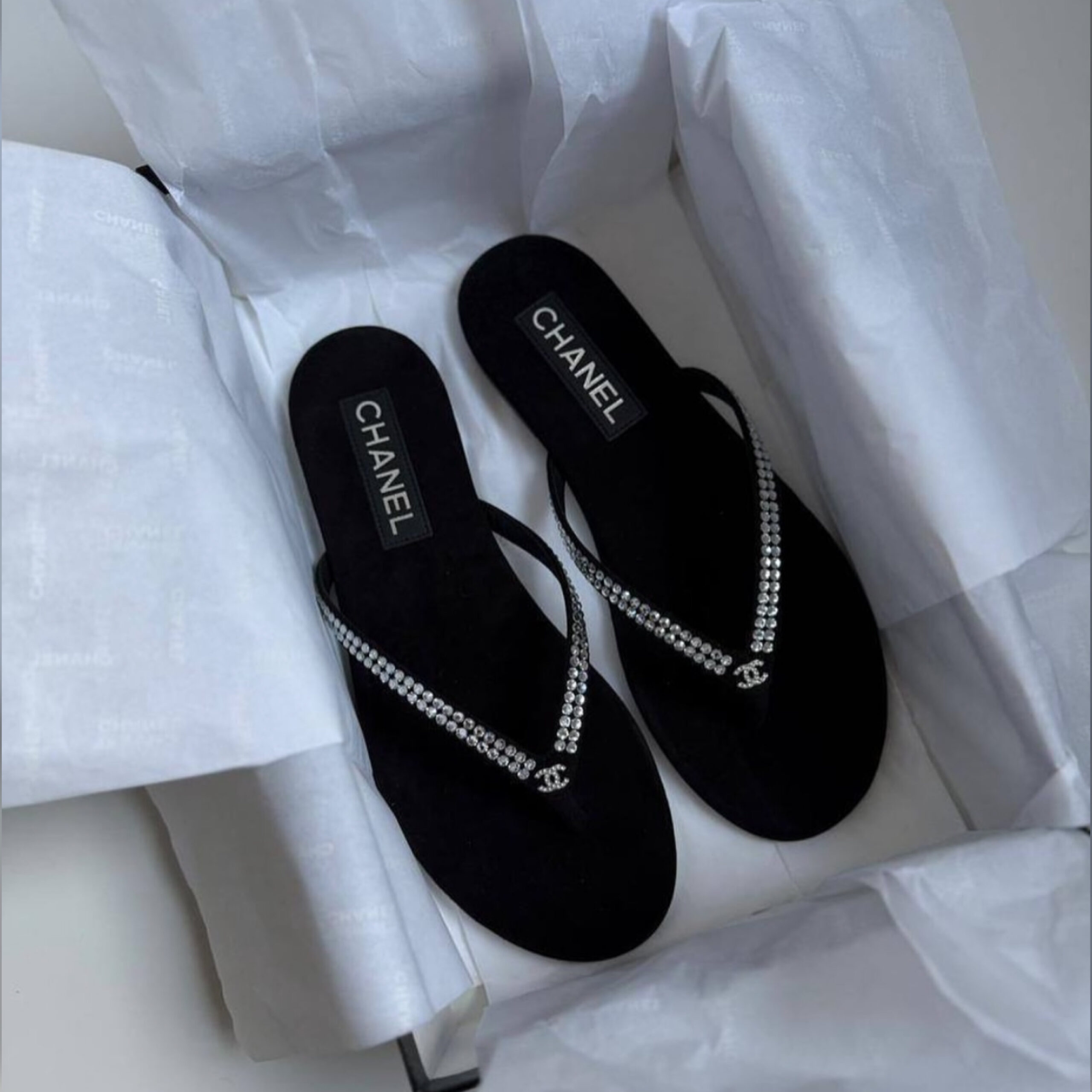 Узкий Y-образный ремешок украсили миниатюрной монограммой СС, деликатно намекающей на принадлежность бренду и рядами сверкающих кристаллов.