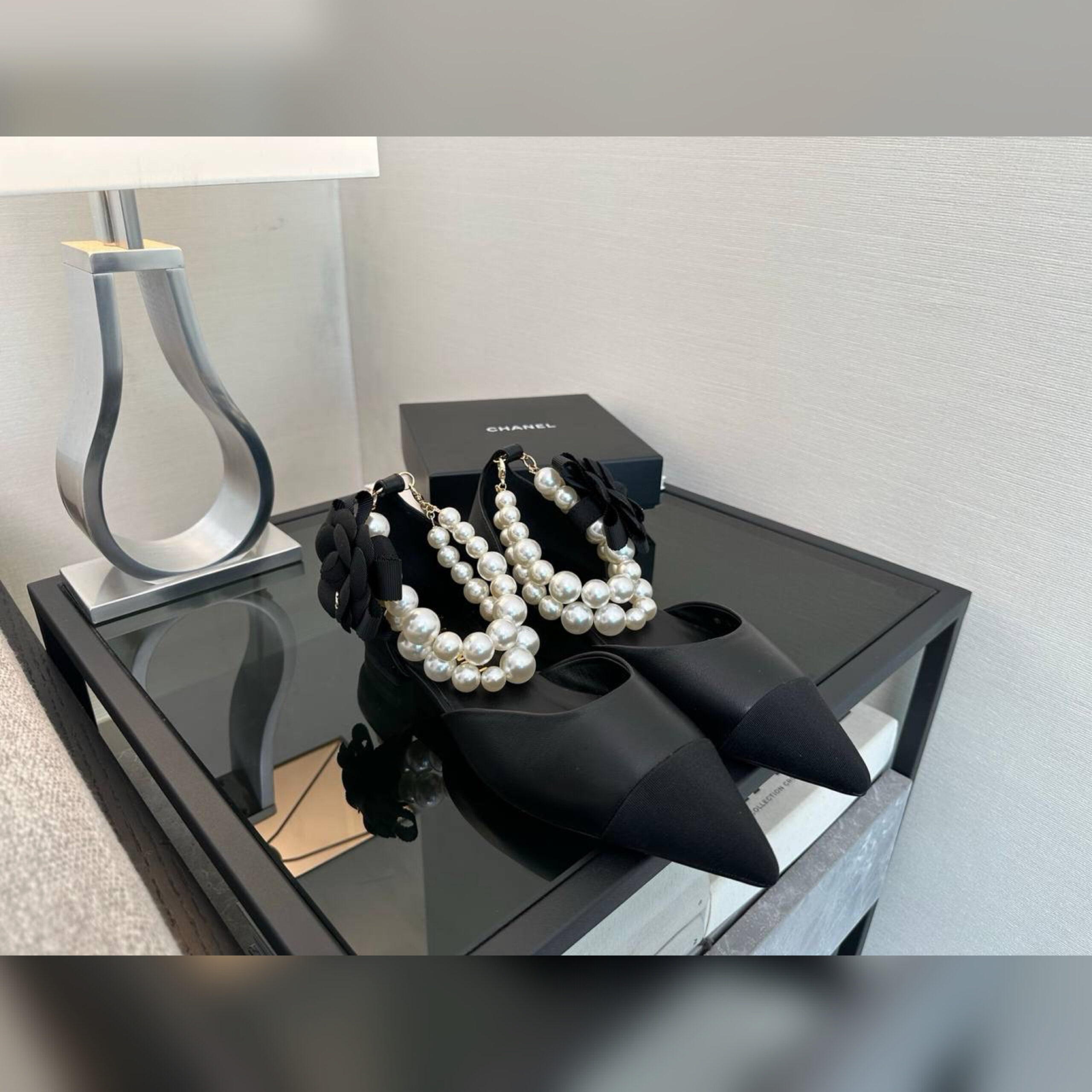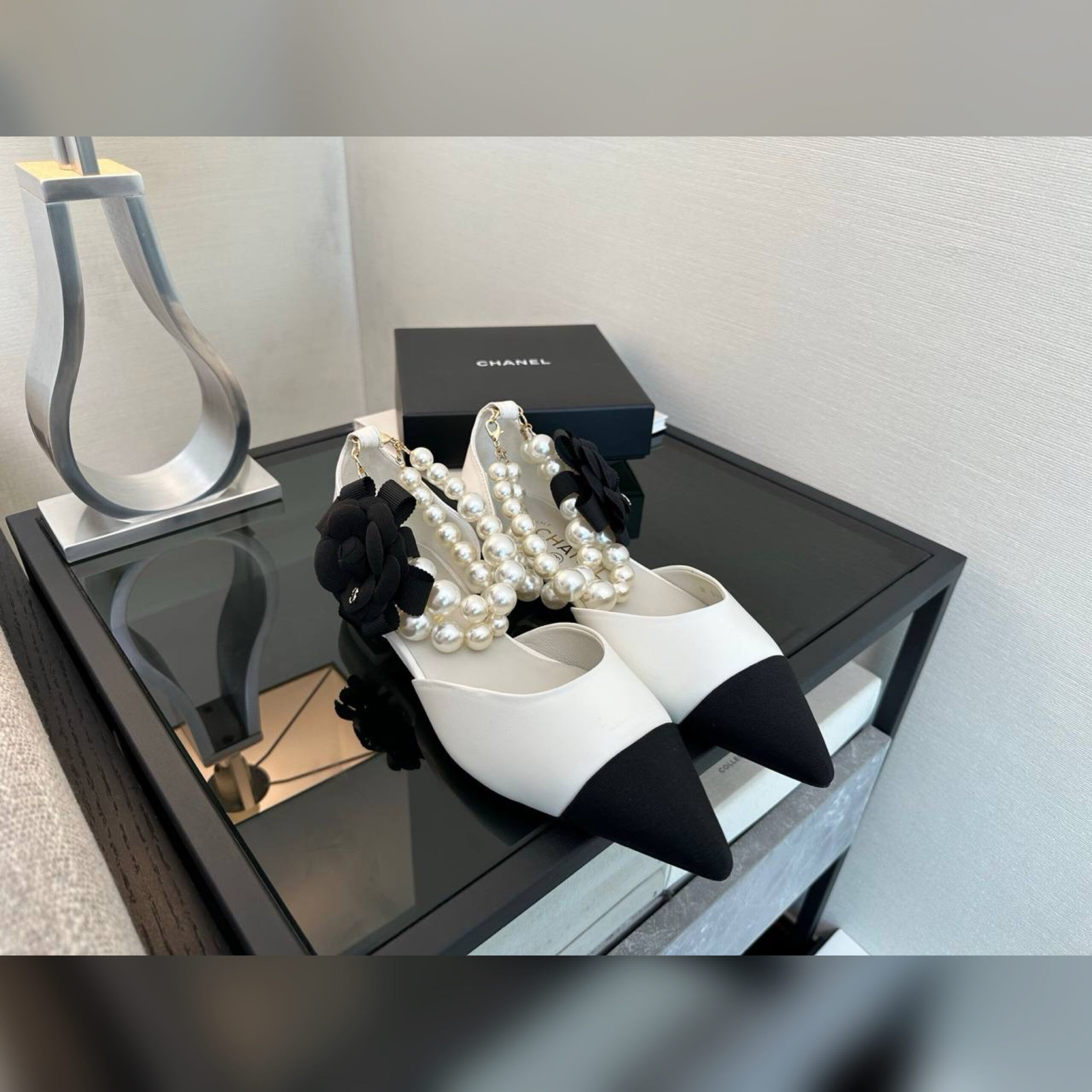 Нити из крупных перламутровых бусин, обвивающих щиколотку, и крупная брошь в виде бутона камелии завершают актуальный дизайн и подчёркивают женственность силуэта.