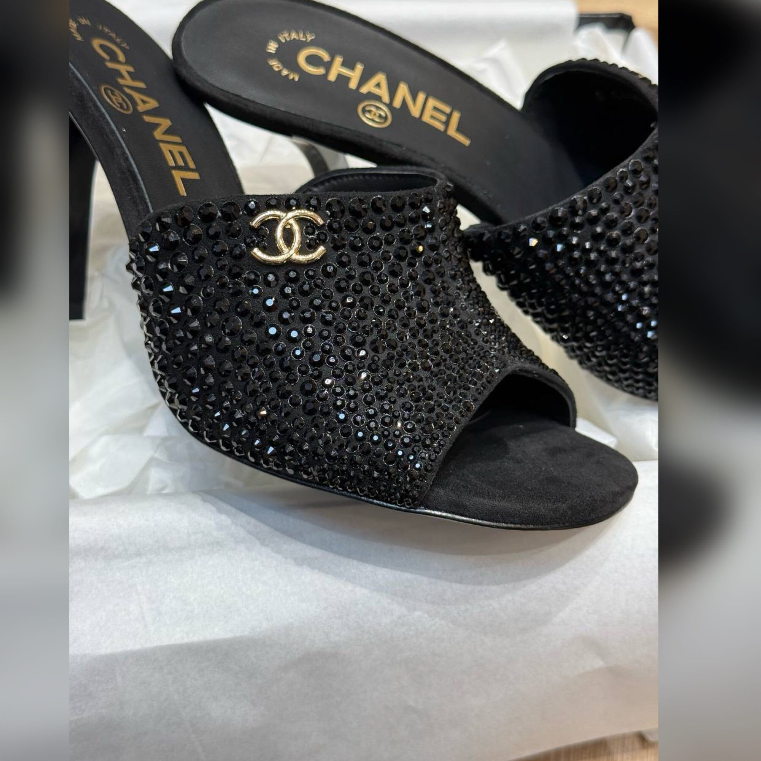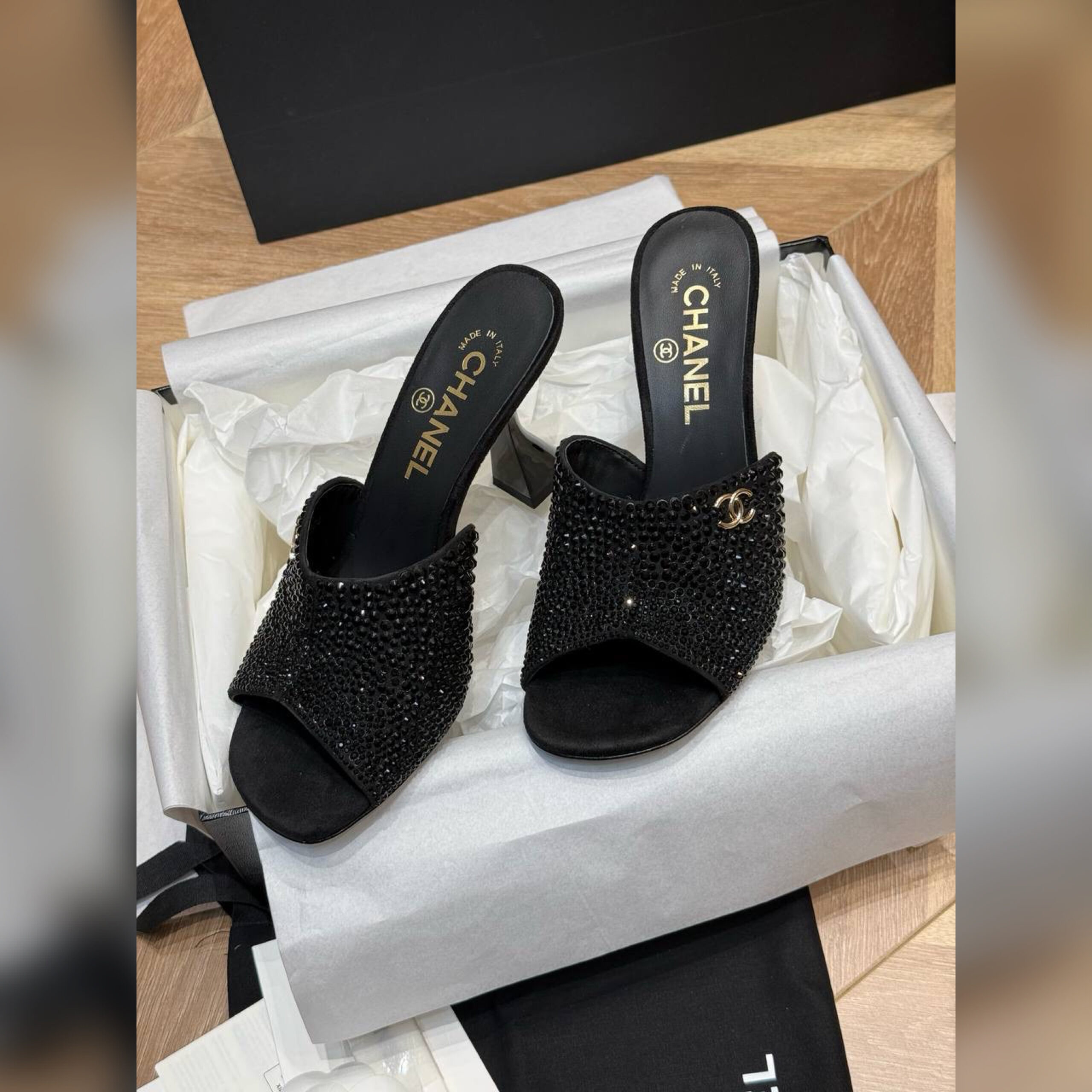 Союзку мюлей полностью покрыли миниатюрными кристаллами в тон. Пару с внутренней отделкой из мелкозернистой кожи установили на фигурный высокий каблук.