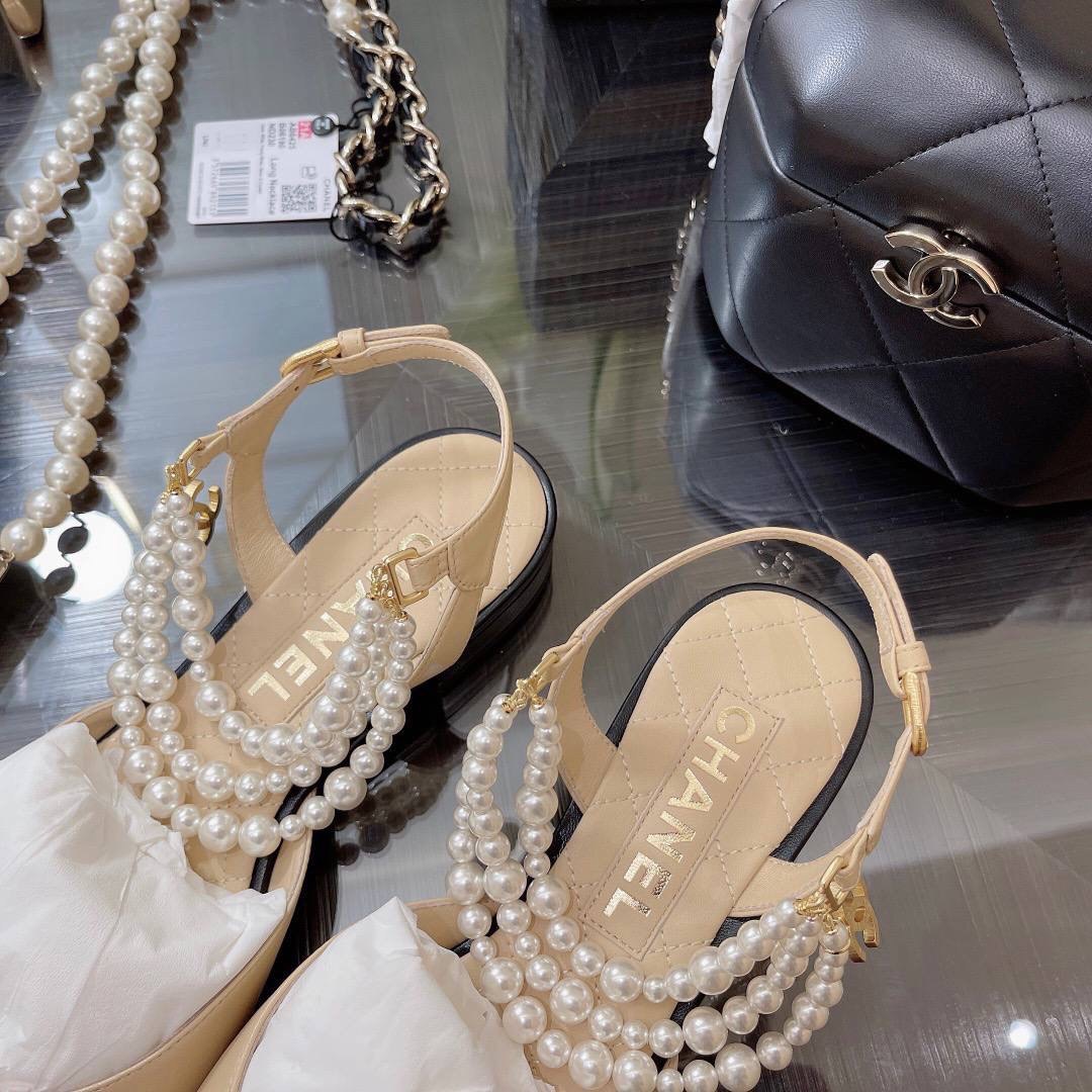 Дополнены изящными цепочками, усыпанными фантазийным жемчугом, эффектно переливающимися в лучах света и узким ремешком со знаковой миниатюрной пряжкой.