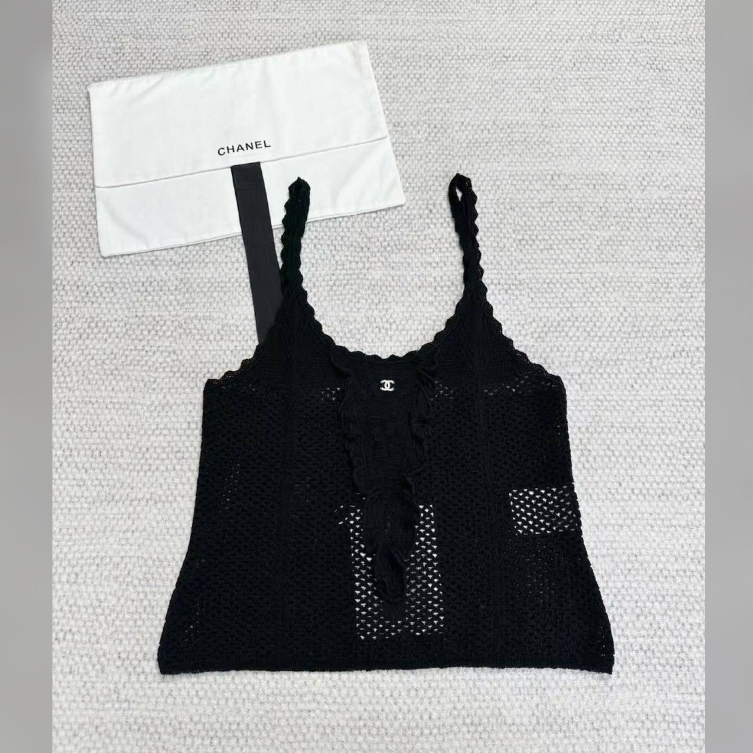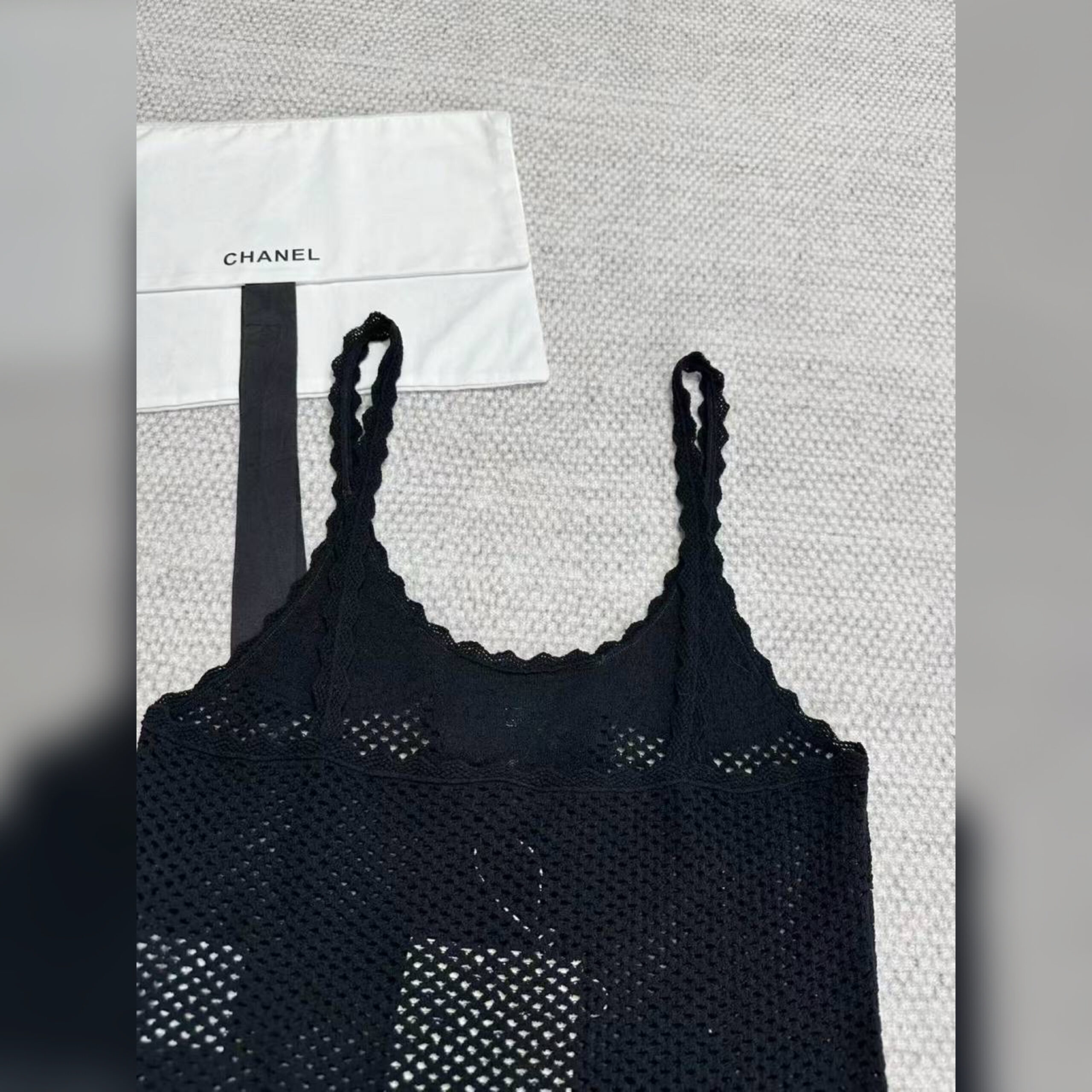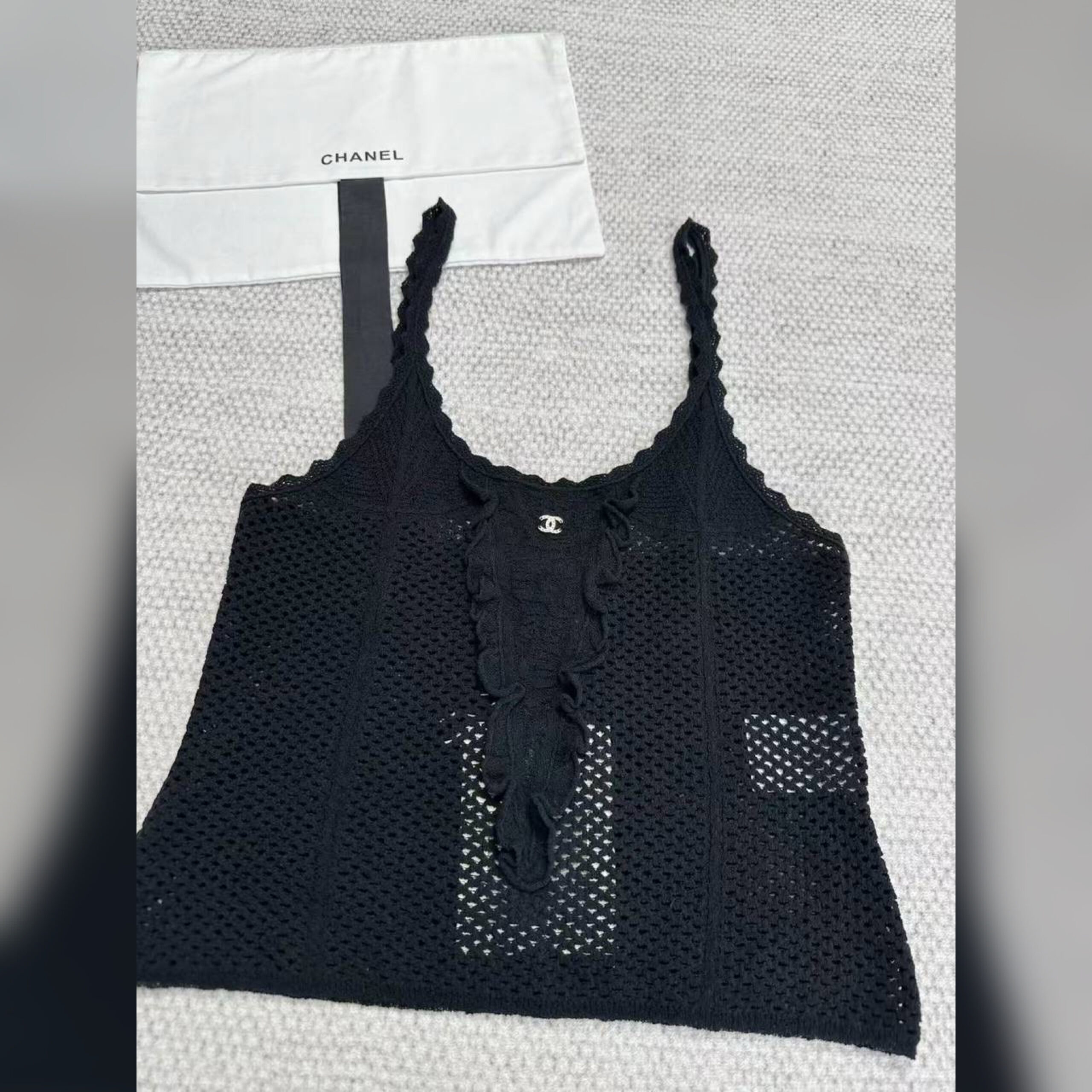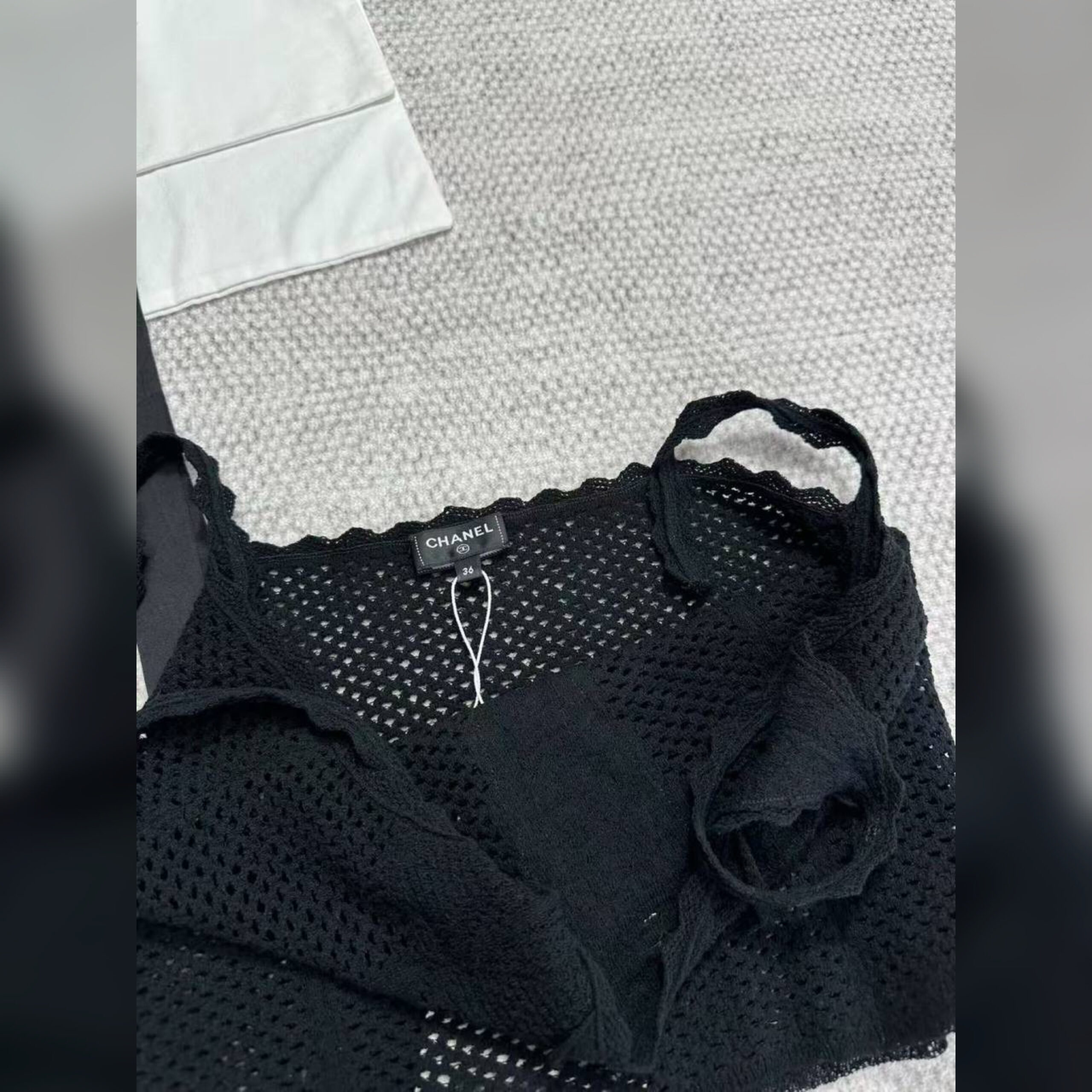 Топ с узкими кружевными бретелями, связанный ажурным узором, подчеркнули изящными оборками и украсили миниатюрной монограммой.