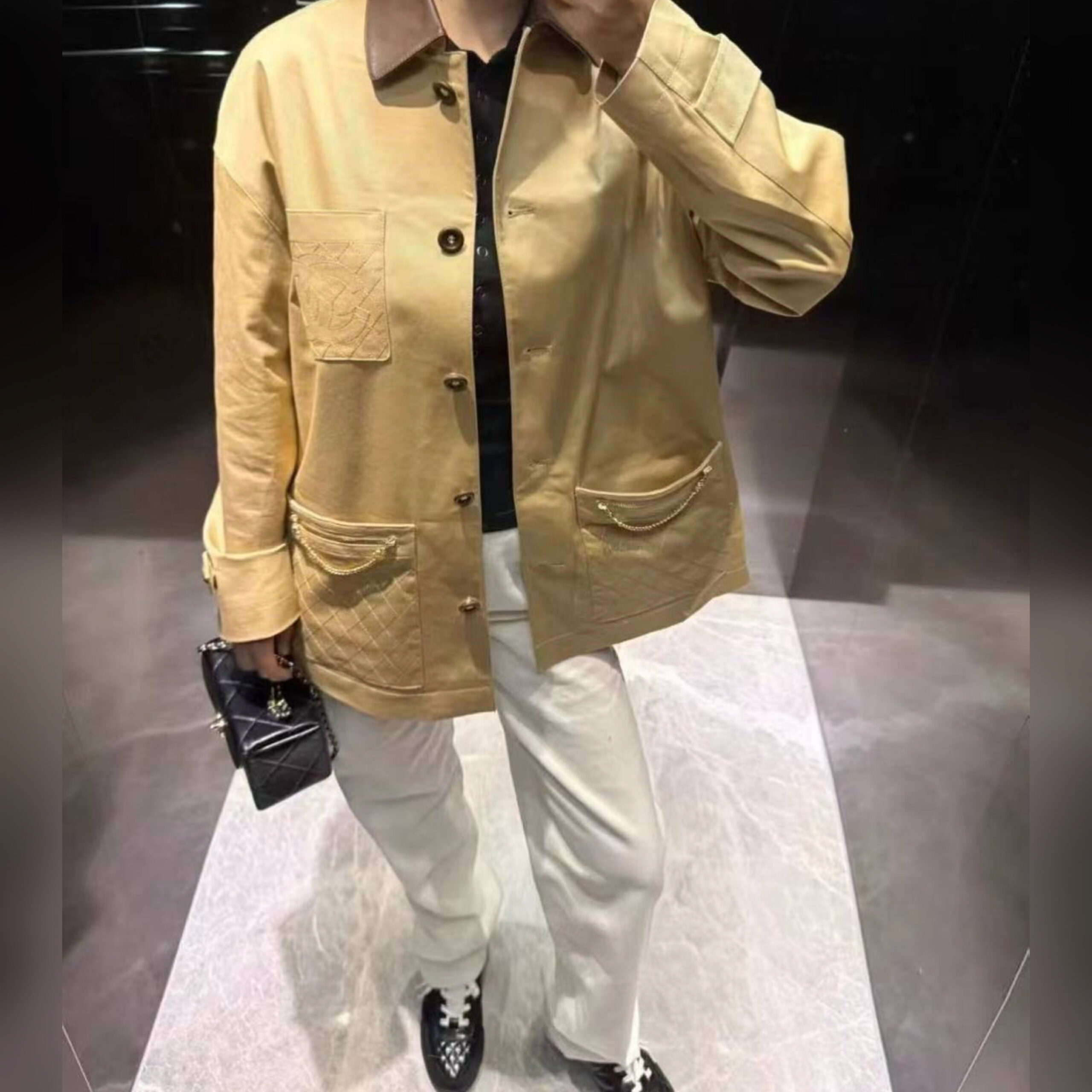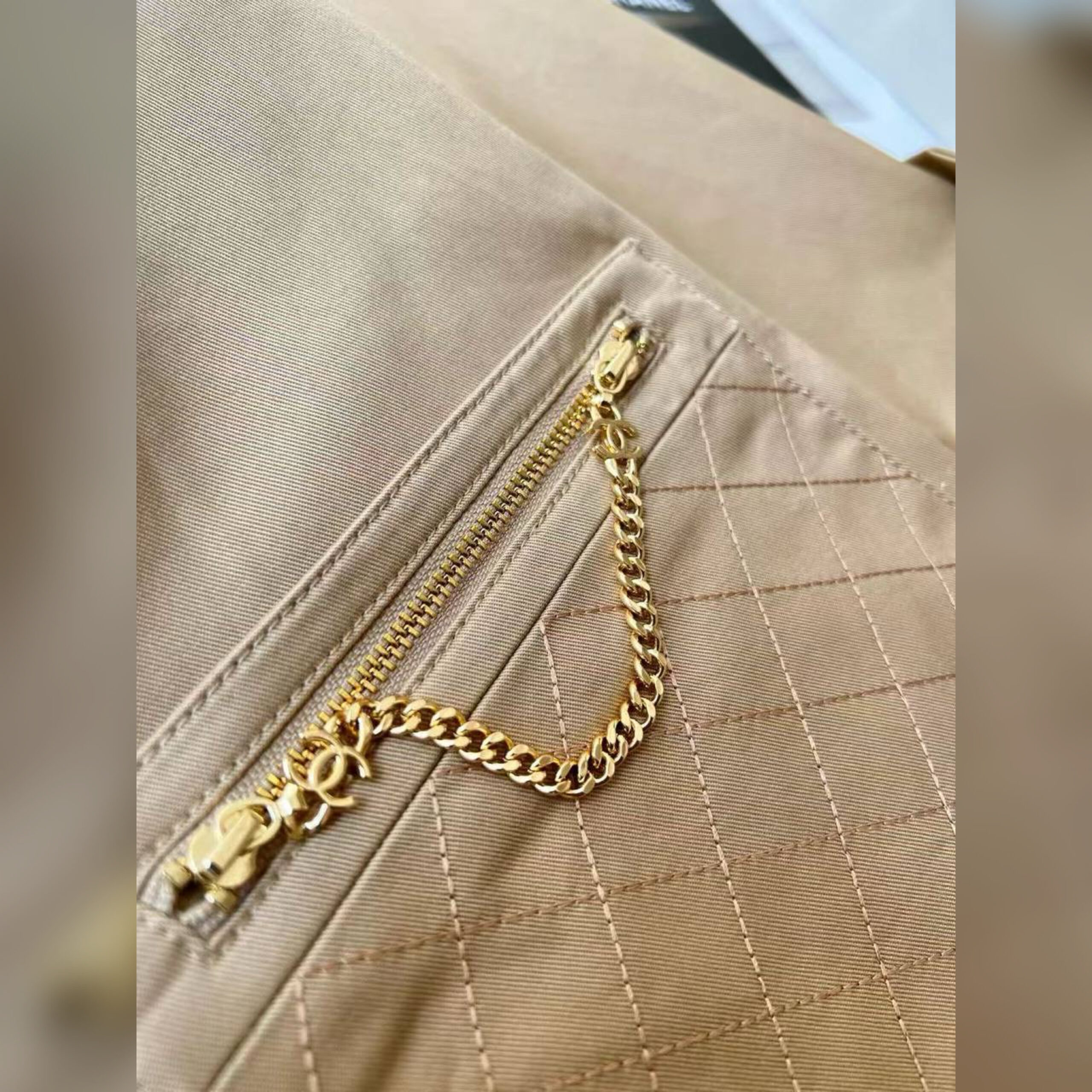 Карманы изделия украсили стеганым ромбовидным узором и золотистыми цепочками.