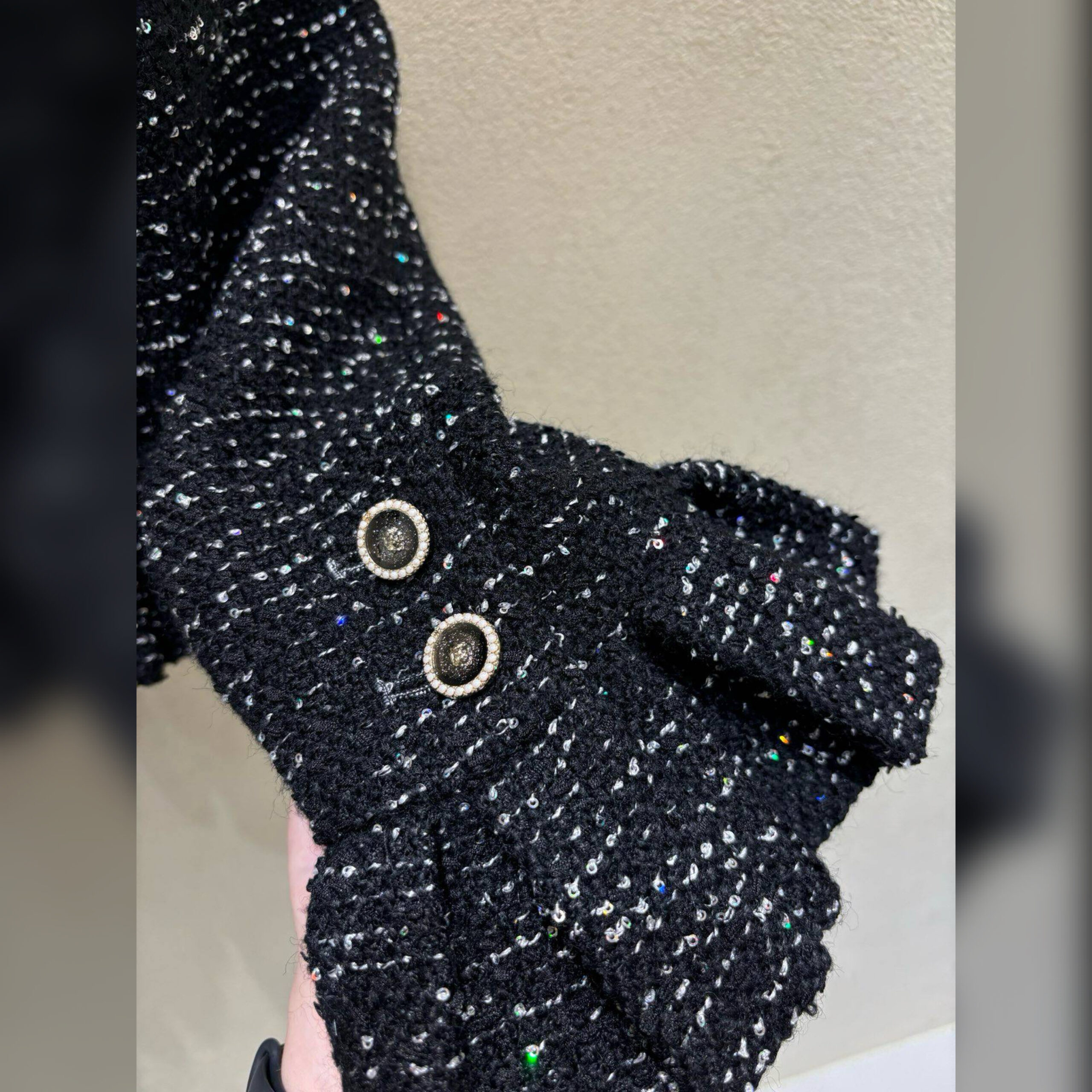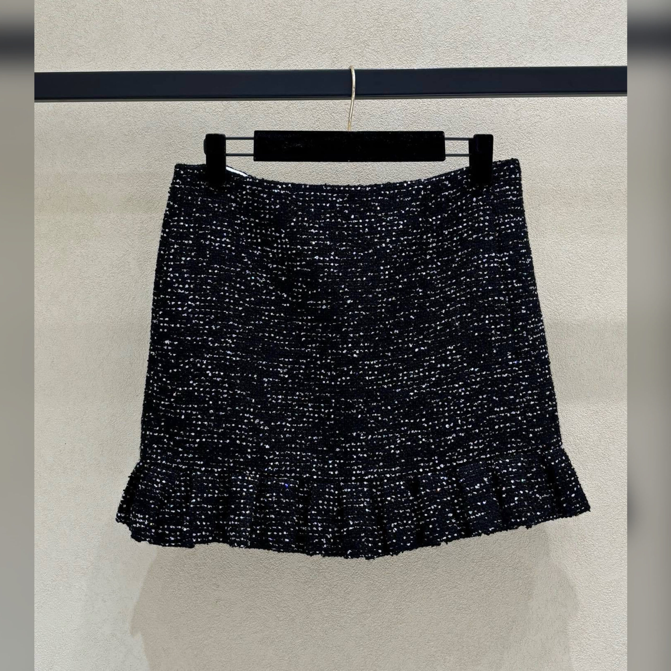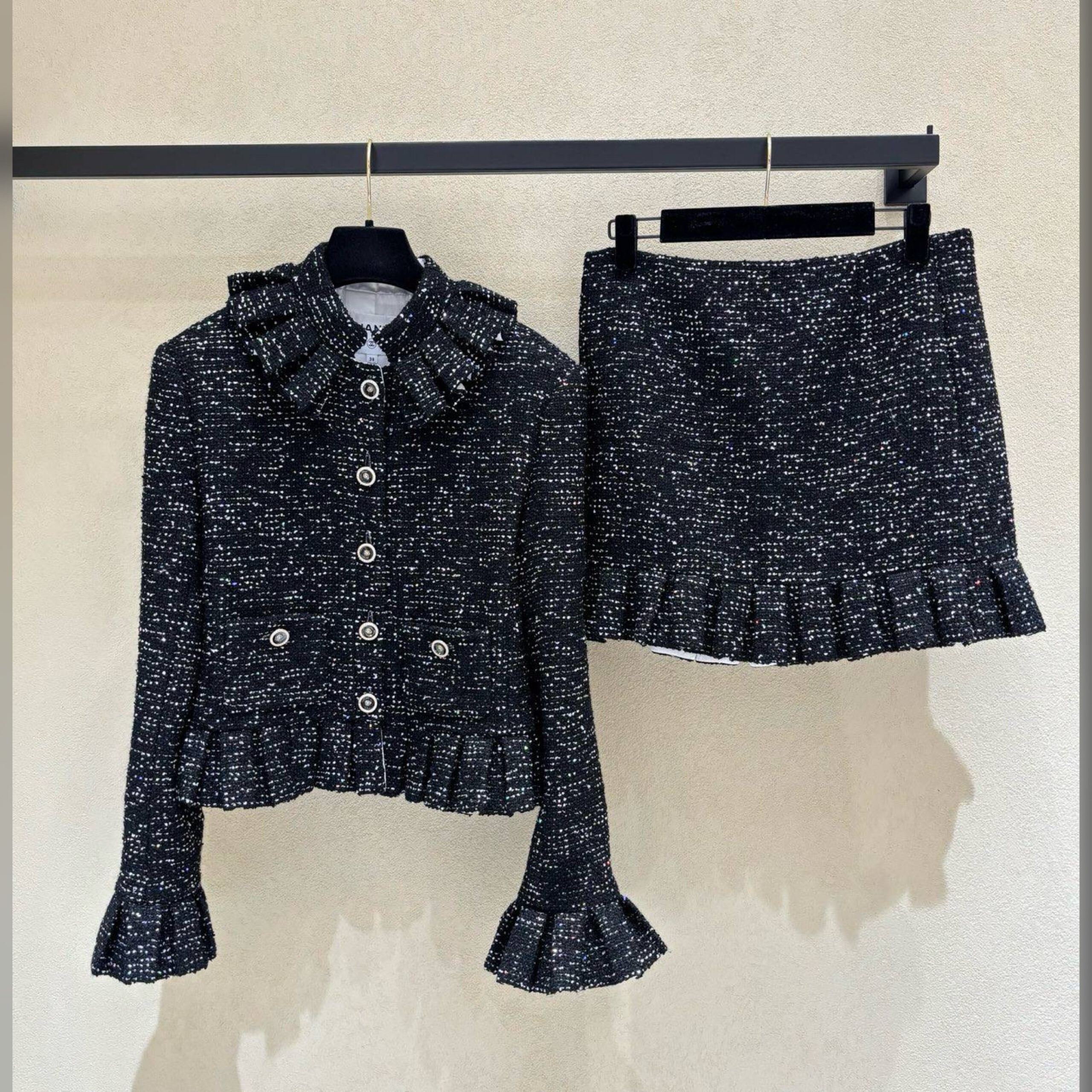 На это работает сочетание кроя моделей и материала. Юбку и жакет прямого кроя выполнили из фирменного твида. Изделия дополнили плиссированными деталями, накладными карманами и фирменными пуговицами.