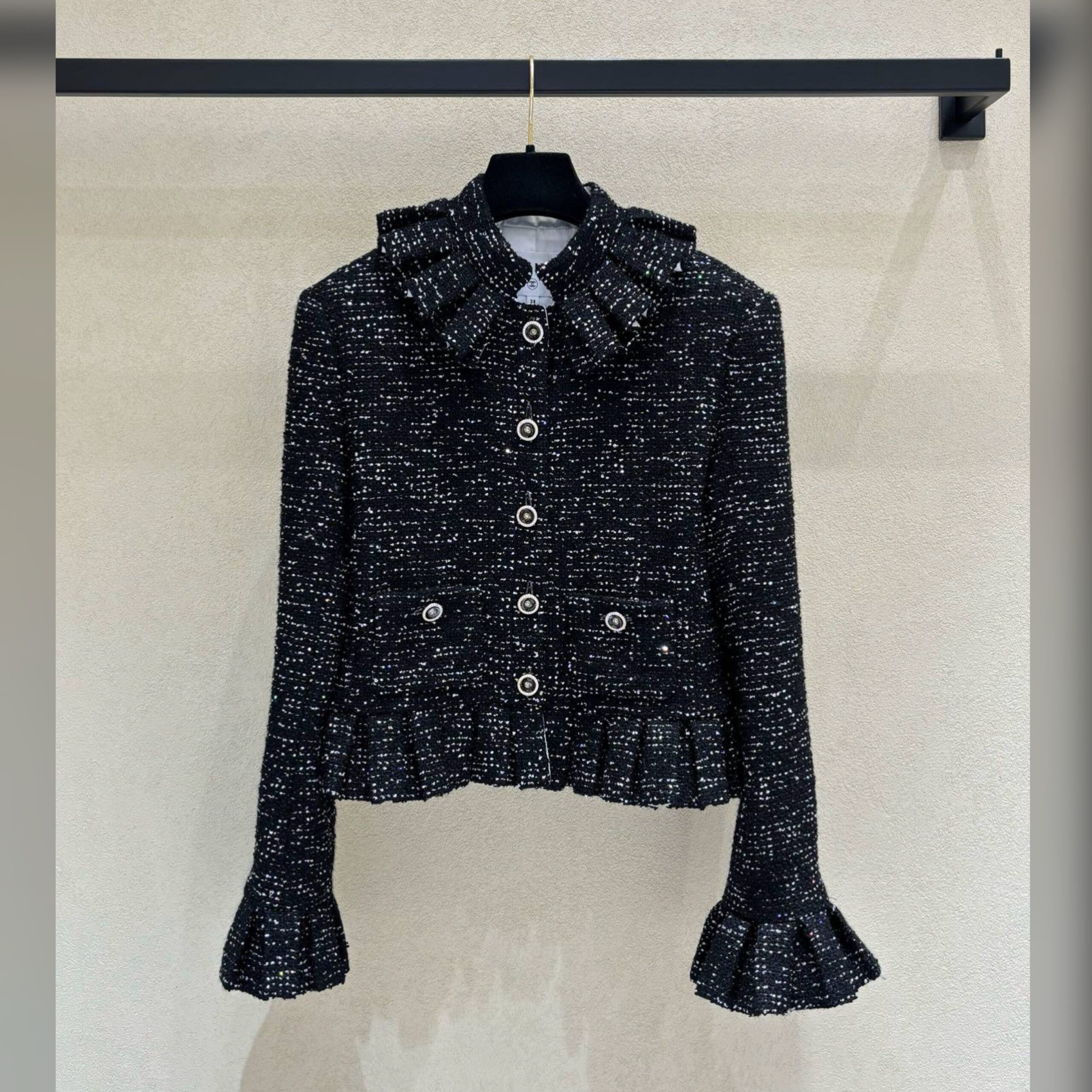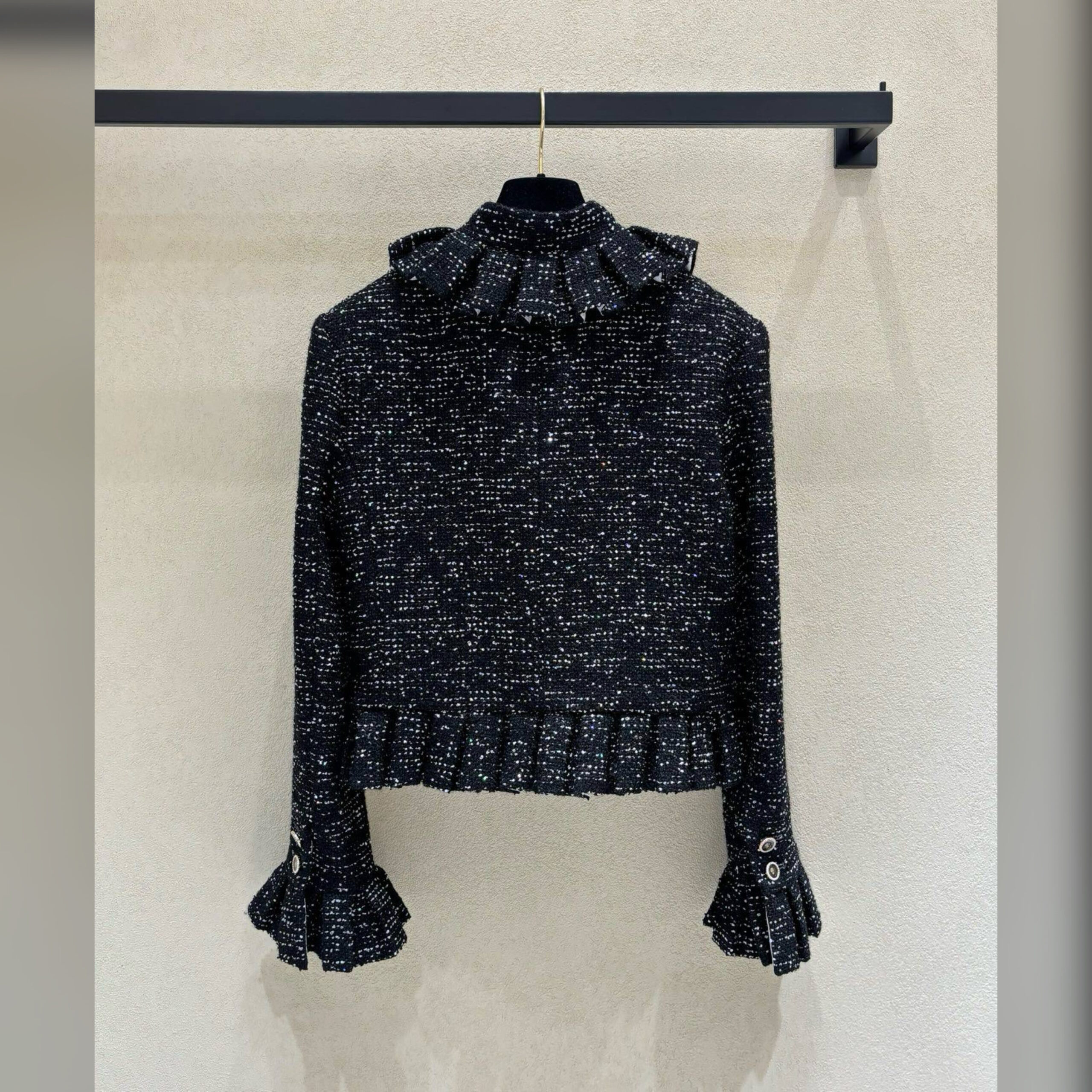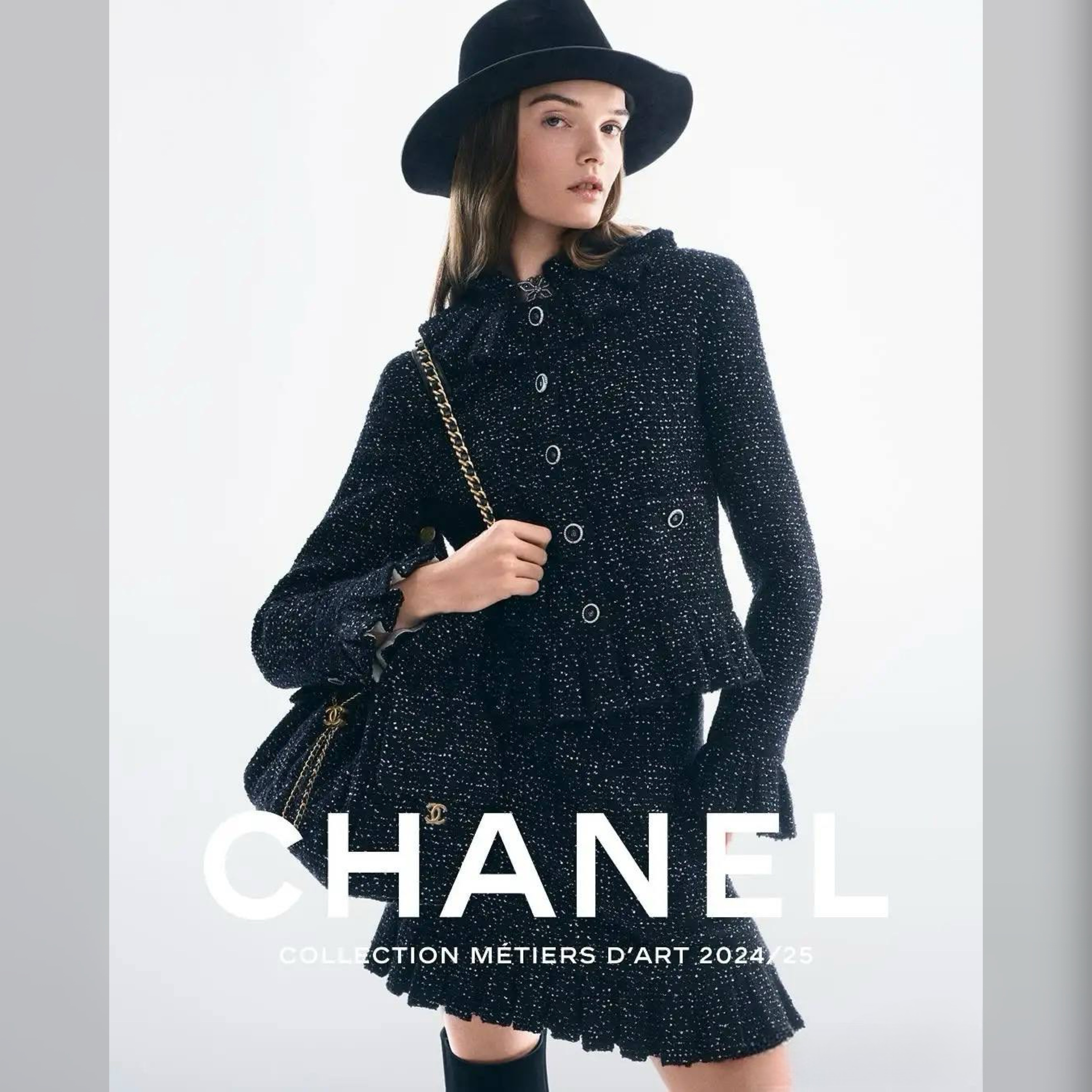 На это работает сочетание кроя моделей и материала. Юбку и жакет прямого кроя выполнили из фирменного твида. Изделия дополнили плиссированными деталями, накладными карманами и фирменными пуговицами.
