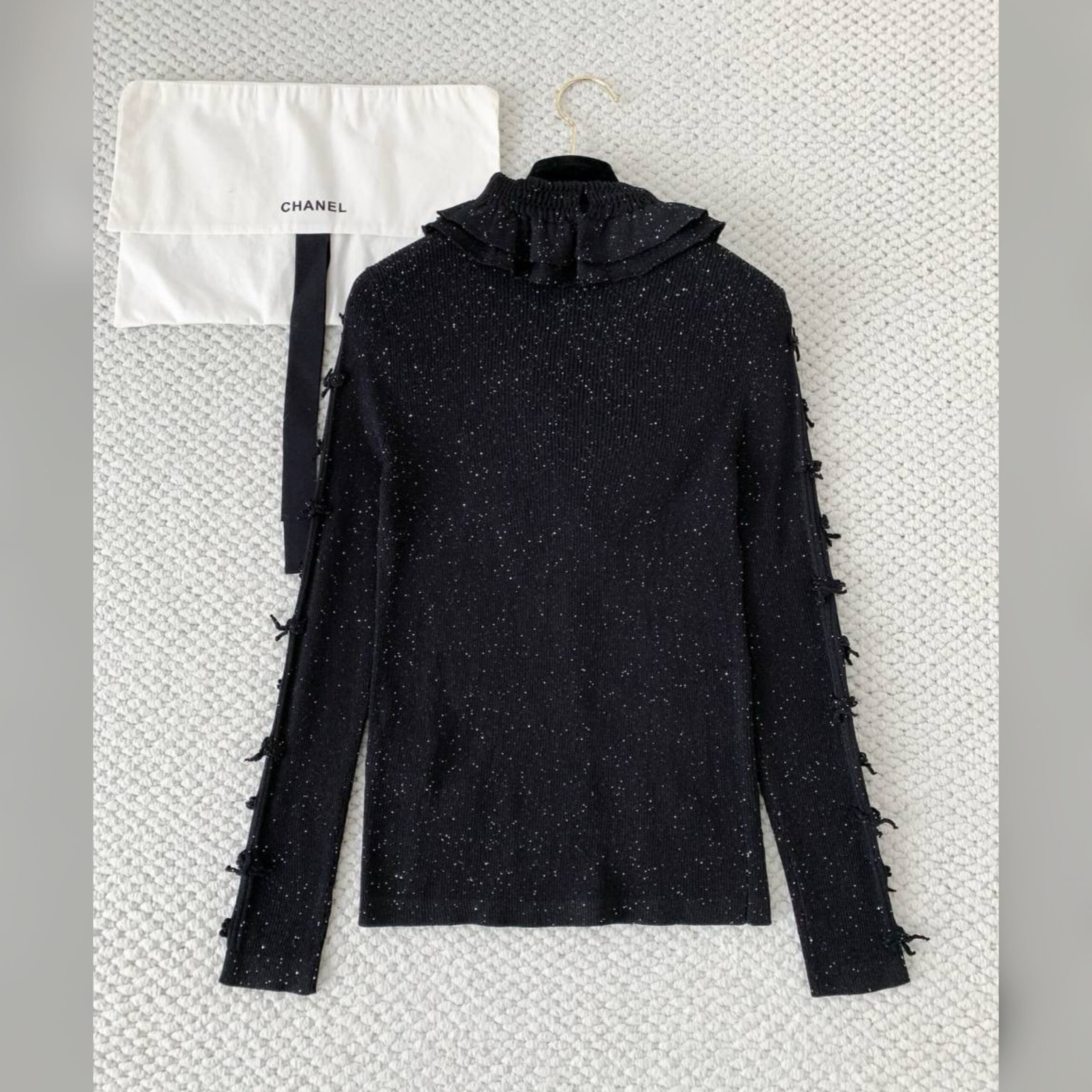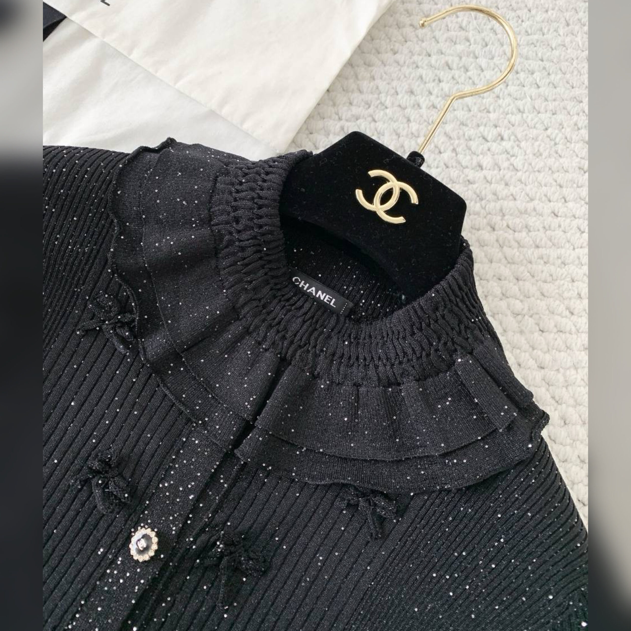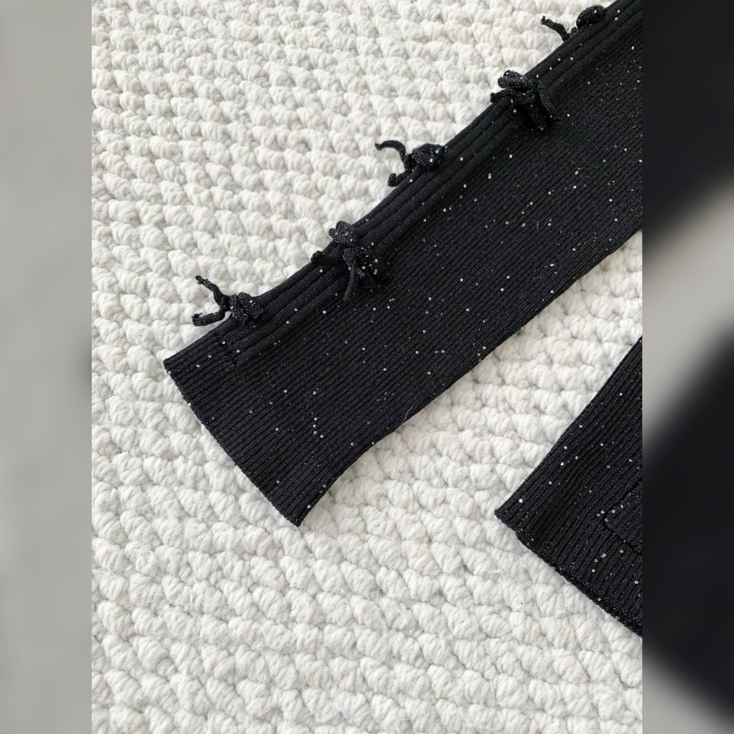 Благодаря декору и материалу кардиган справится с ролью блузы в образе с джинсами или брюками. Для изготовления модели использовали меланж с вплетенными в него блестящими нитями. Горловину подчеркнули рюшами, а рукава и переднюю панель украсили миниатюрными бантами.