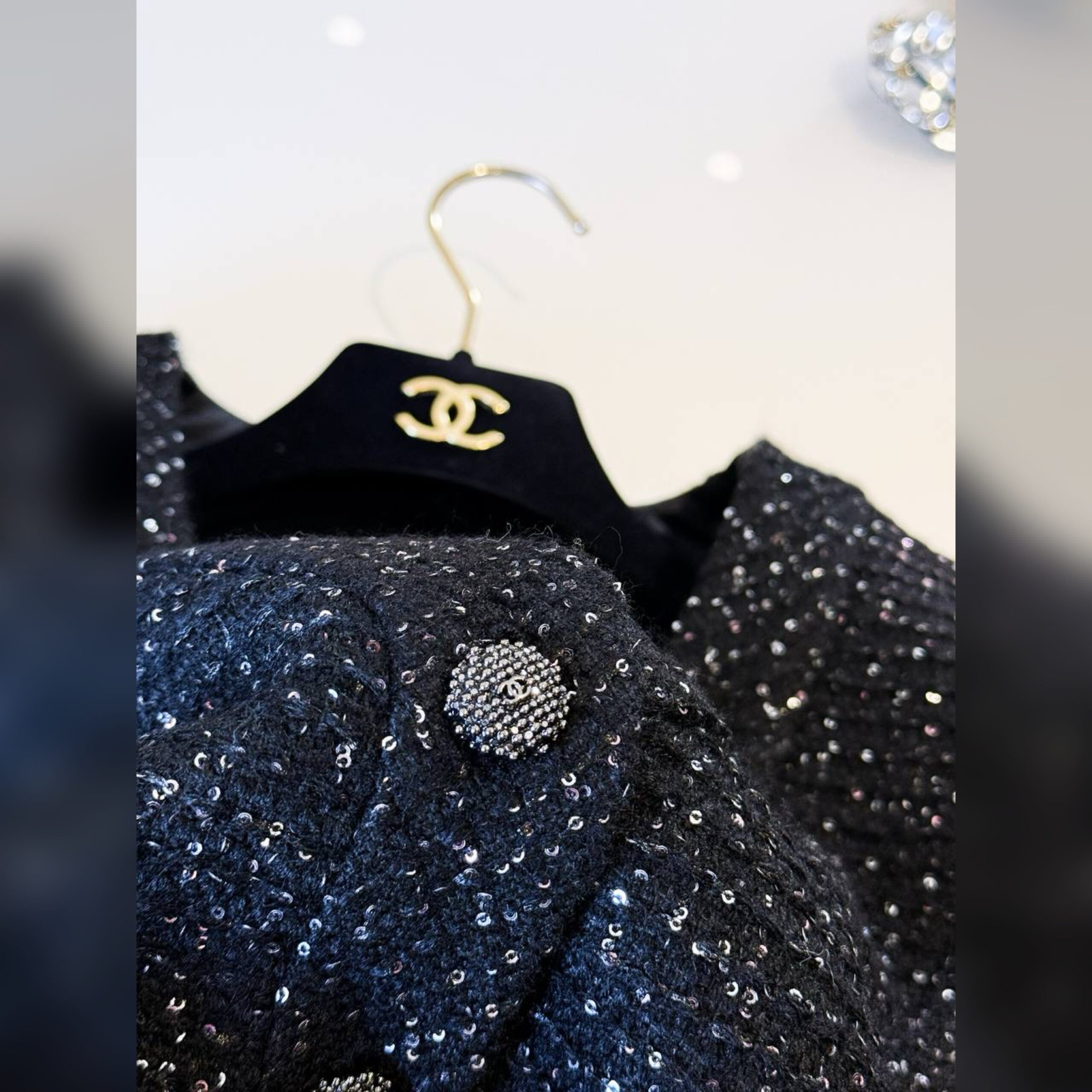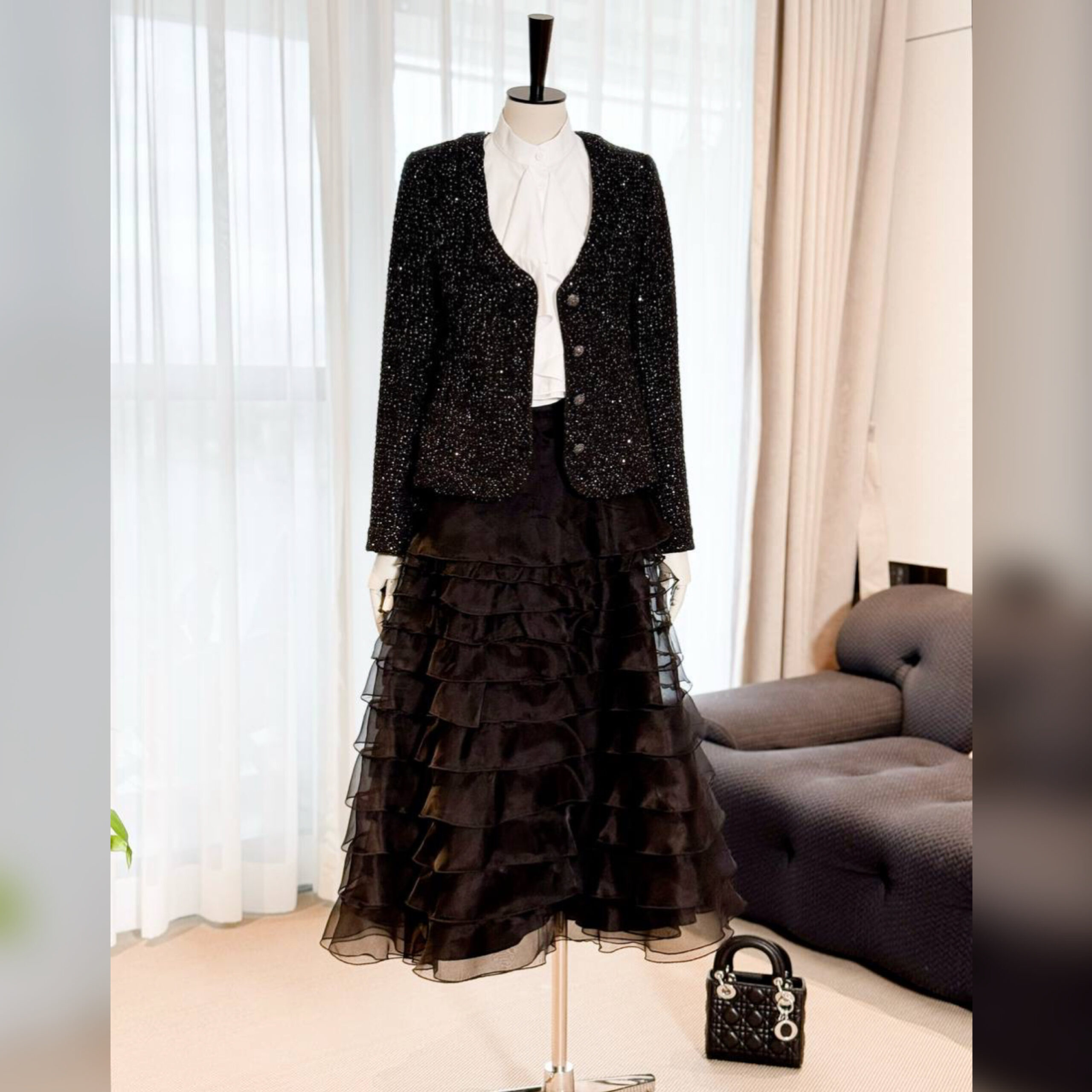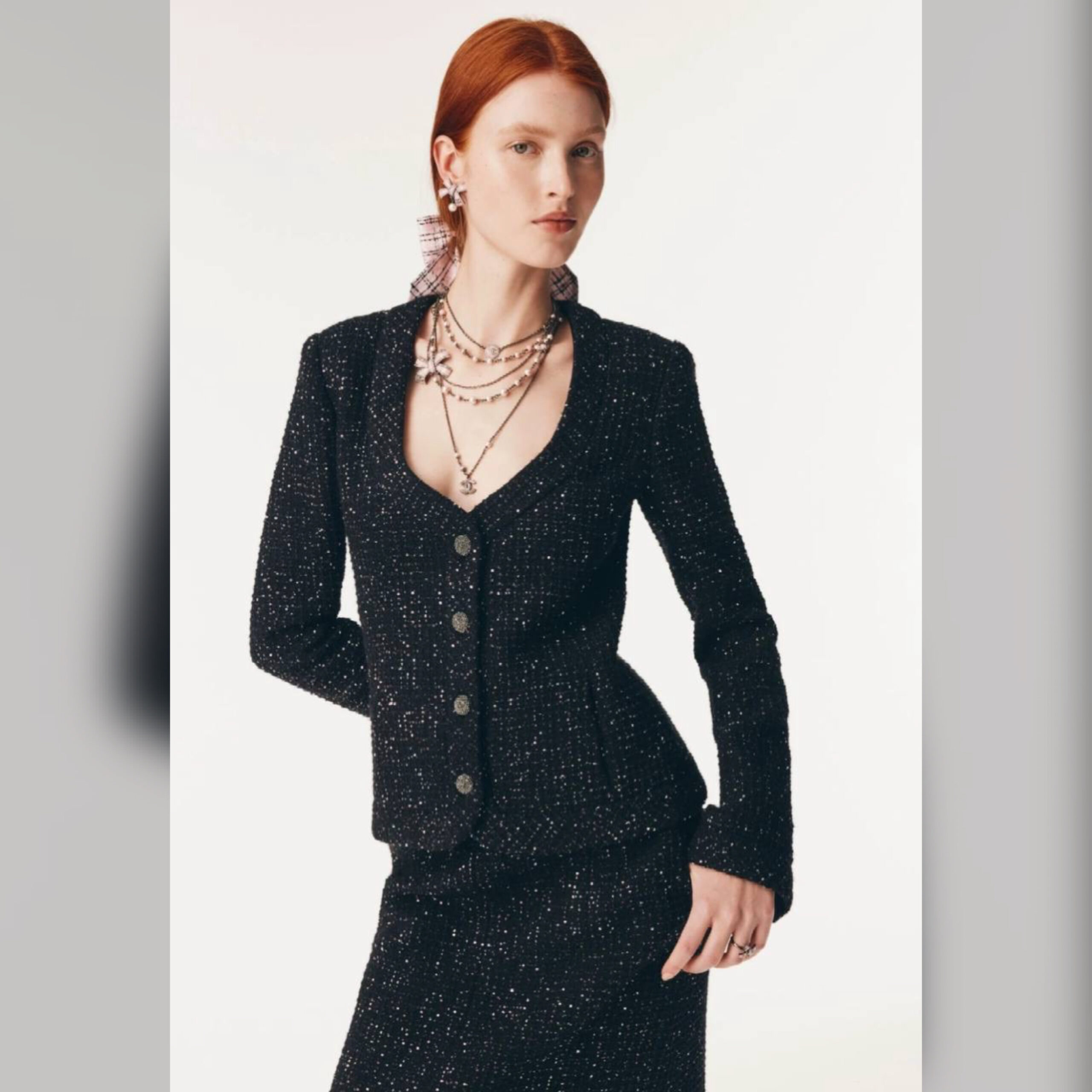 Лаконичный цвет жакета дизайнер компенсировал декором—глянцевым блеском миниатюрных пайеток, которыми расшили поверхность изделия.