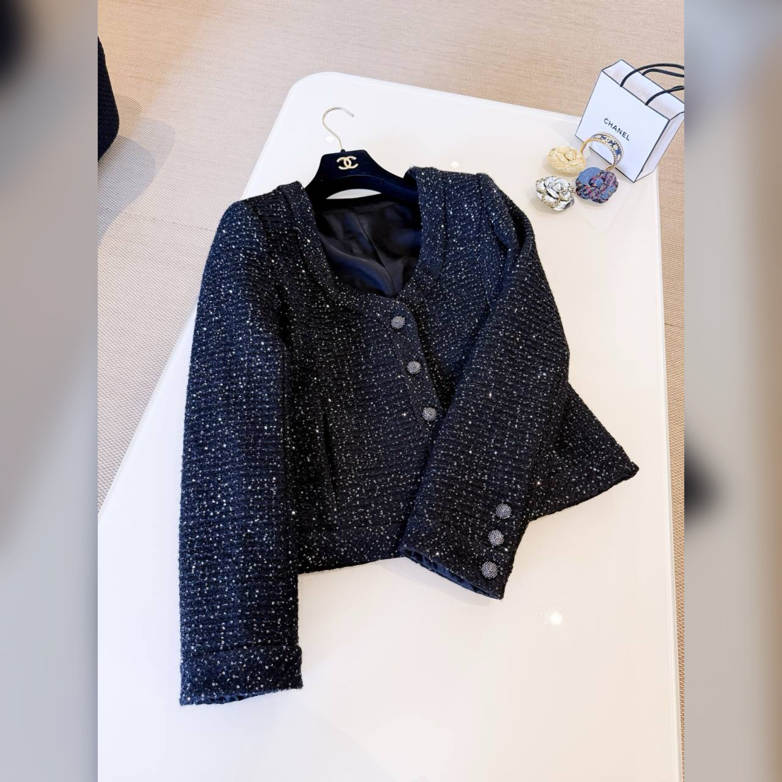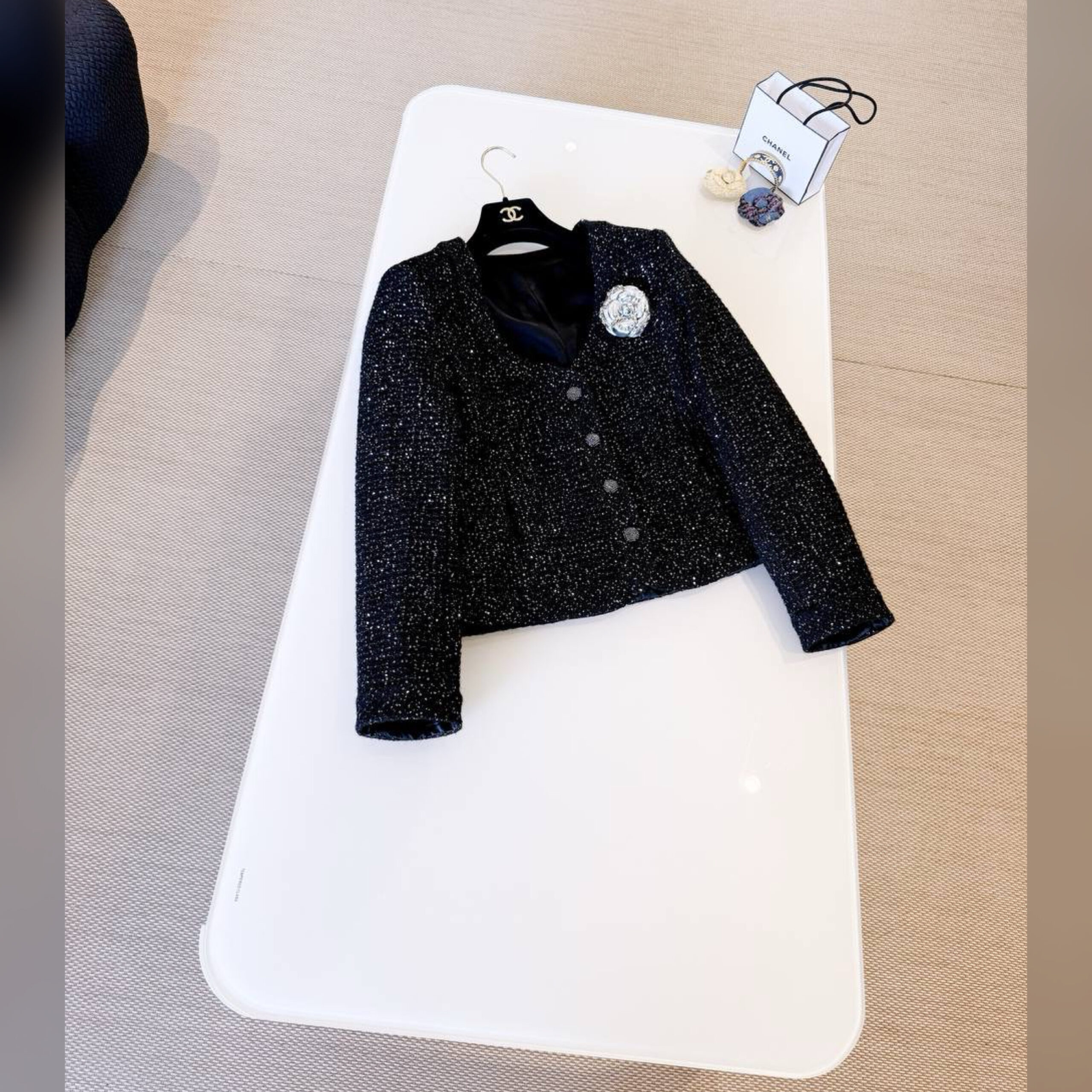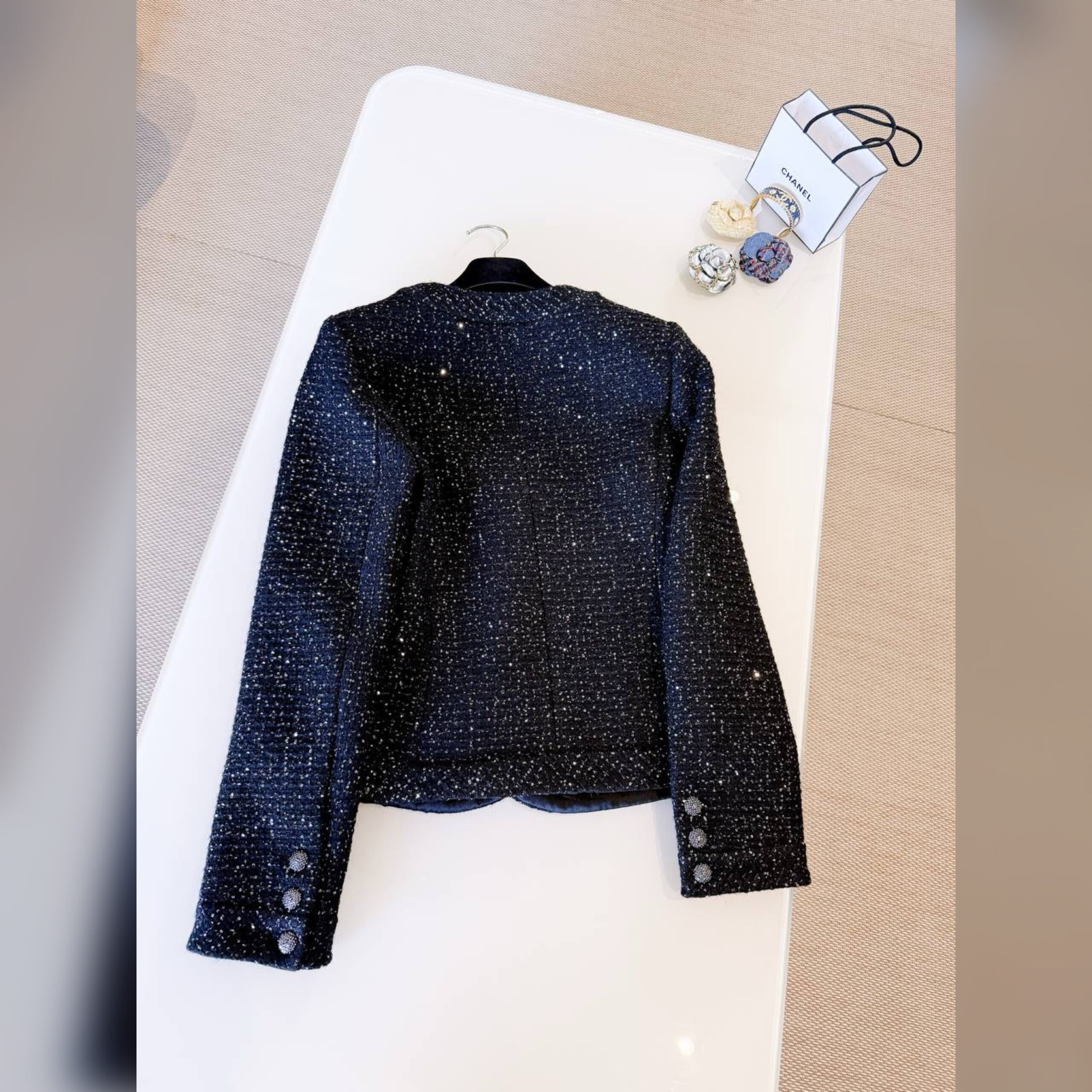 Лаконичный цвет жакета дизайнер компенсировал декором—глянцевым блеском миниатюрных пайеток, которыми расшили поверхность изделия.