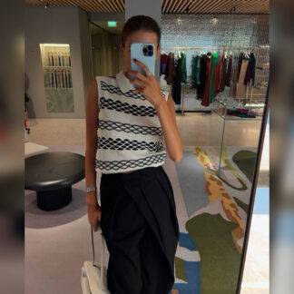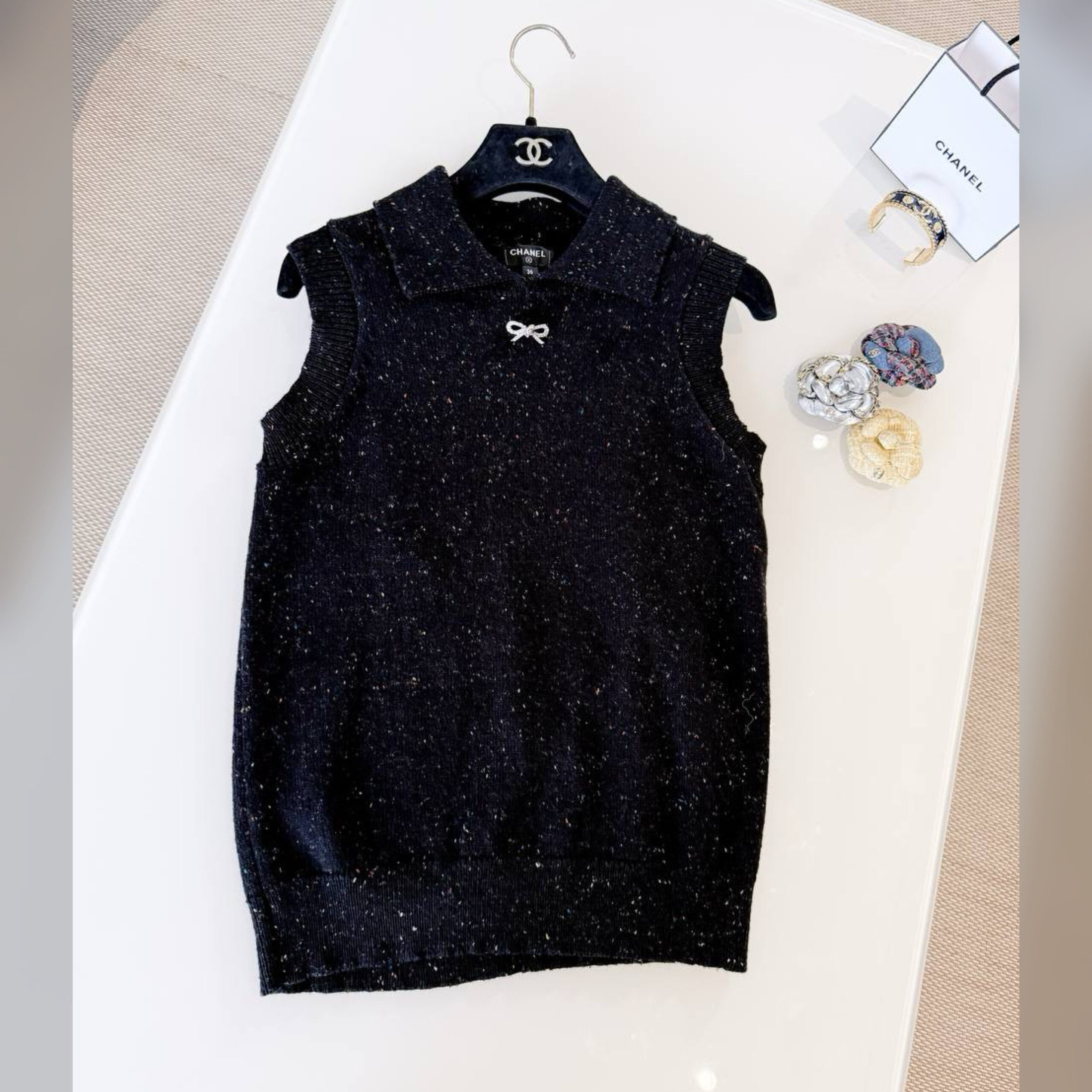Топ без рукавов с отделкой в рубчик связали из мягкой кашемировой пряжи, которая приятно ощущается на теле.
