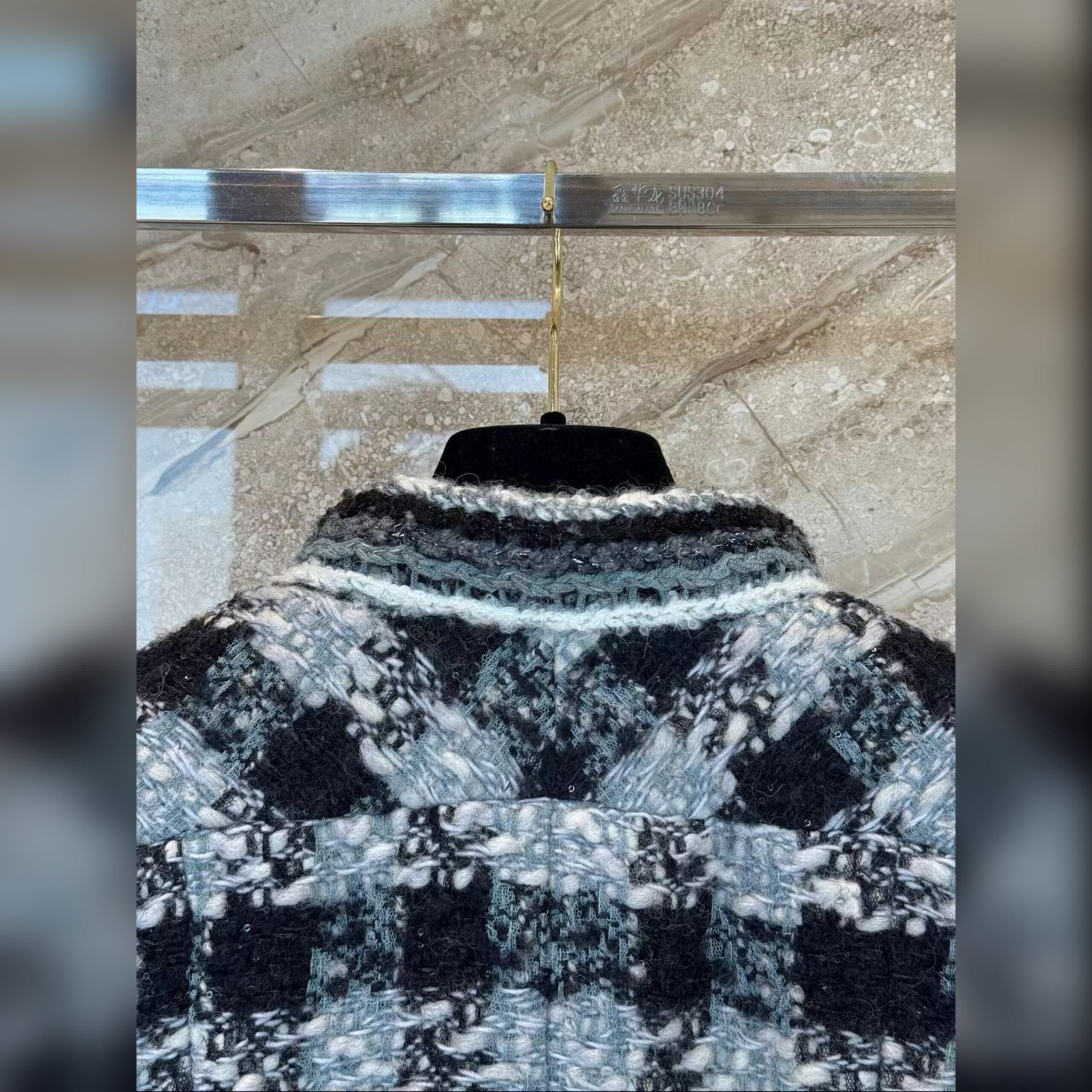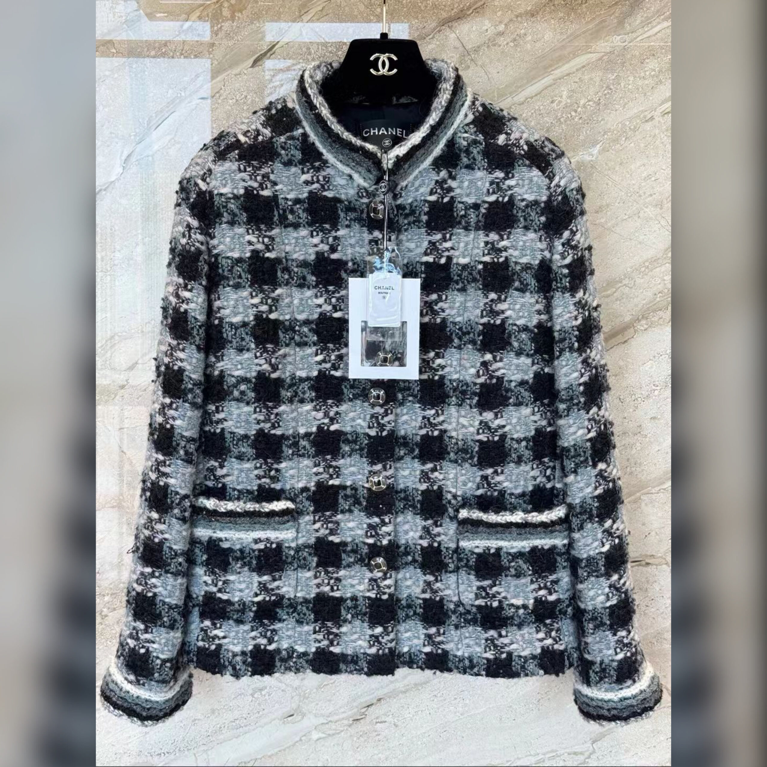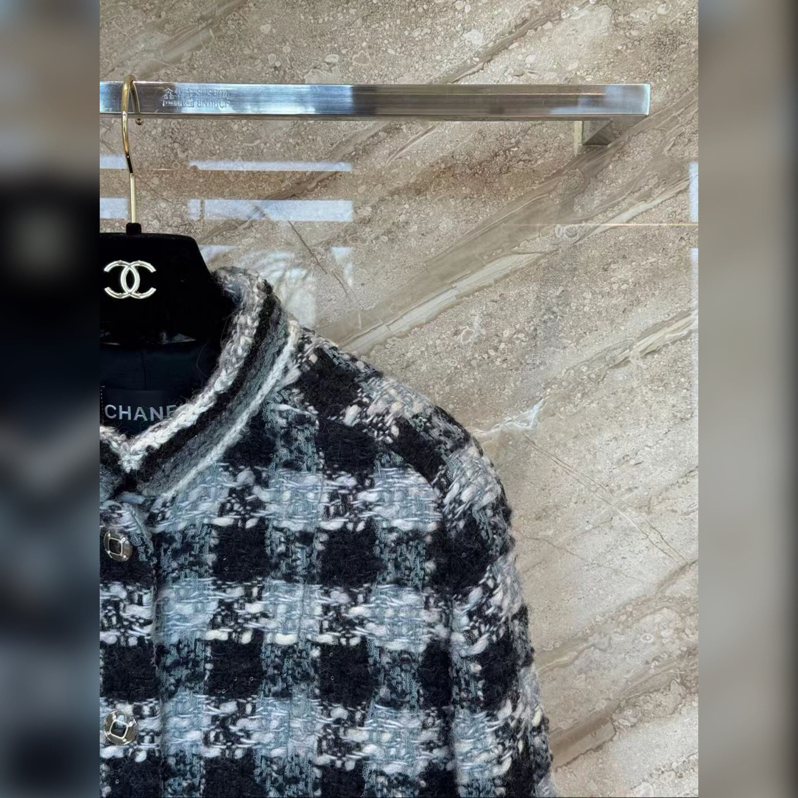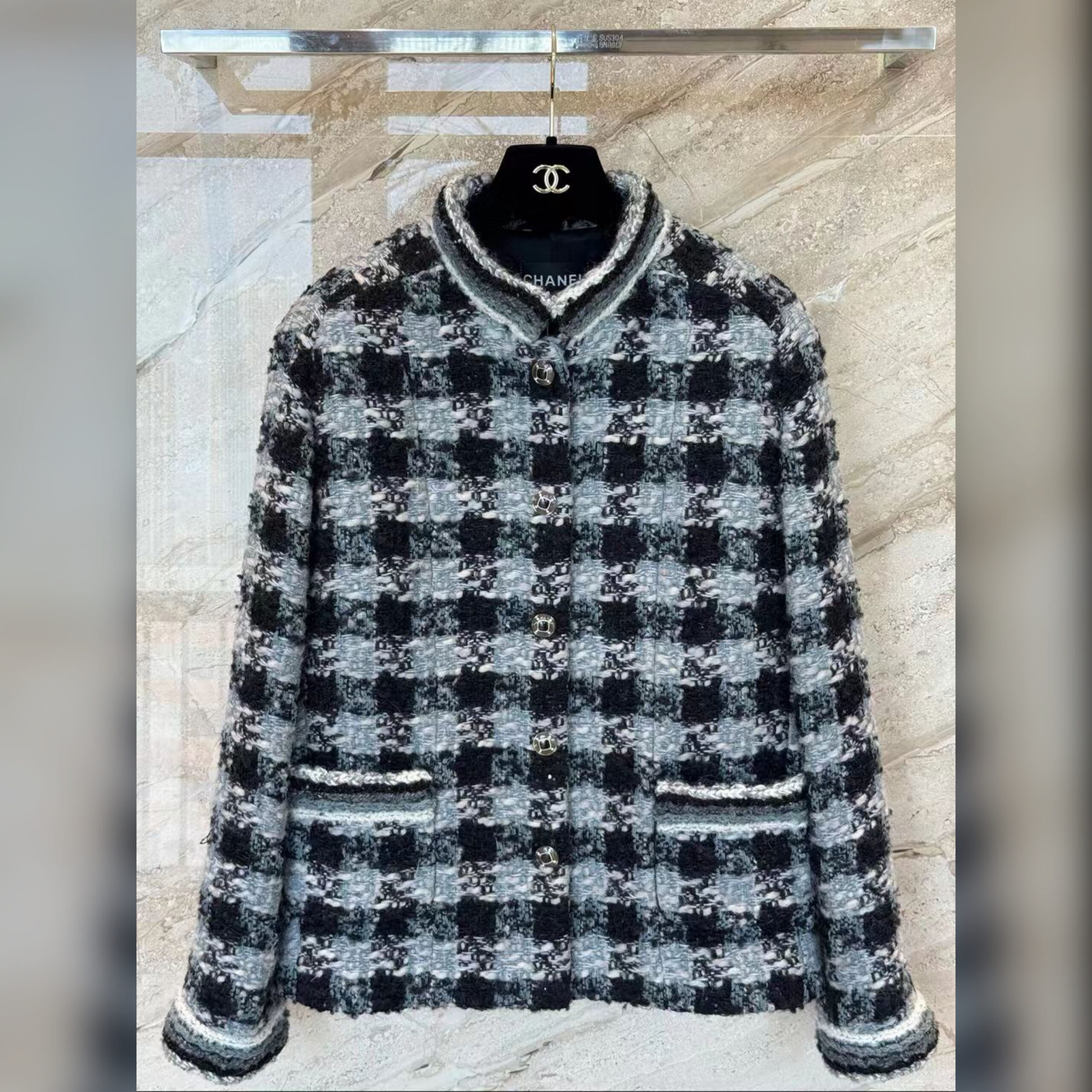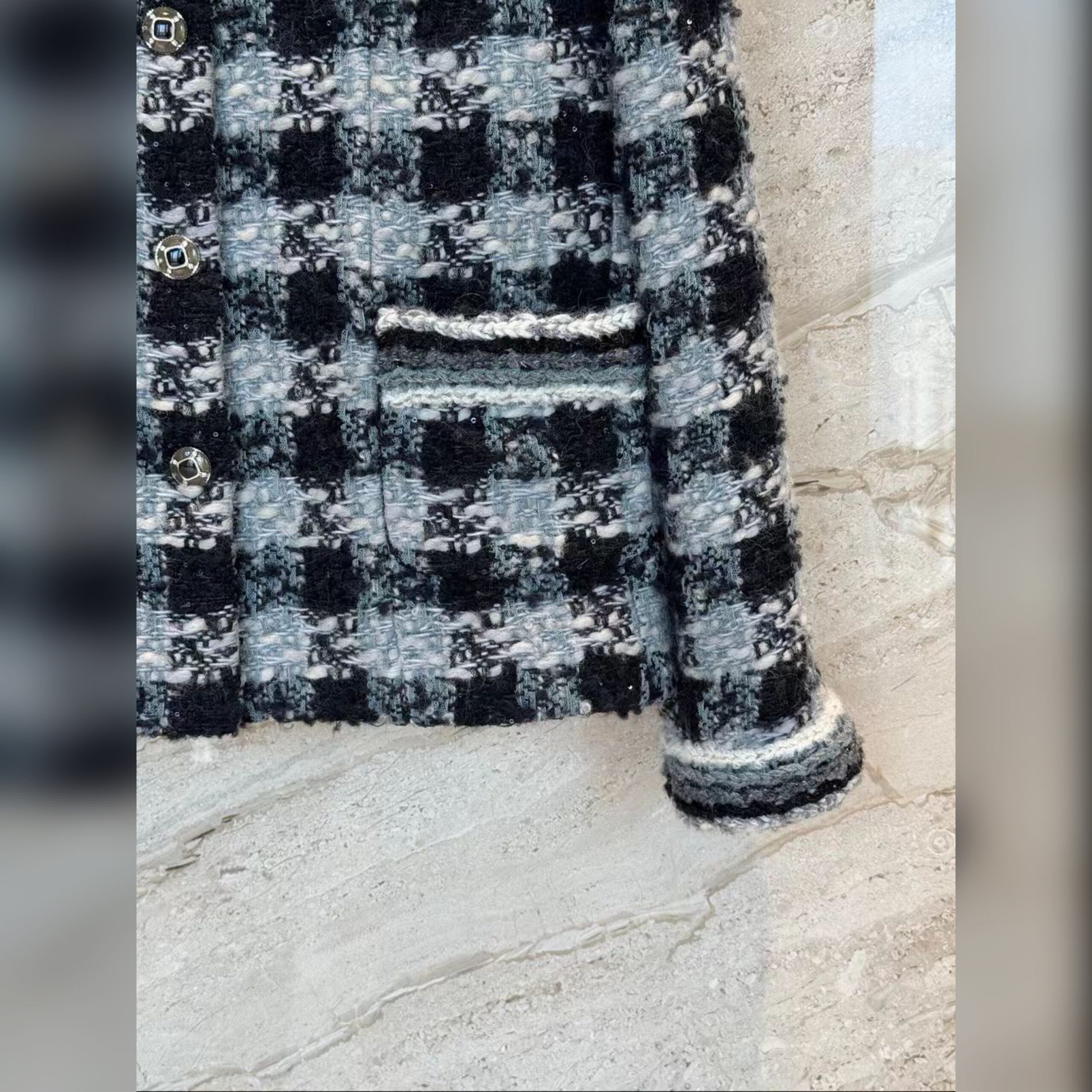 Дизайнеры марки сделали традиционный жакет прямого кроя эффектнее. Фактура модели из твида получилась выразительнее, потому что в материал вплели нити разных цветов цветов, создающие яркую клетку.