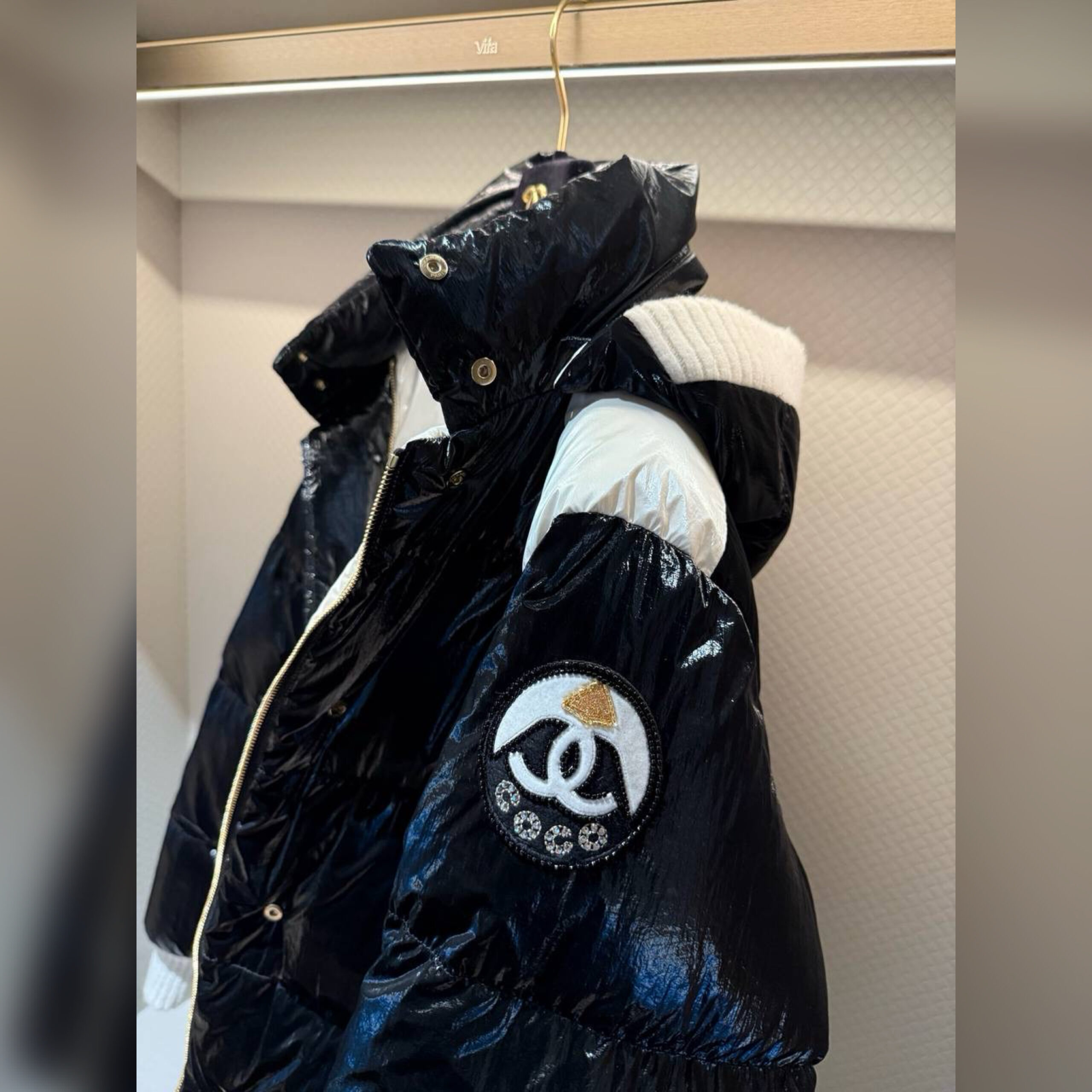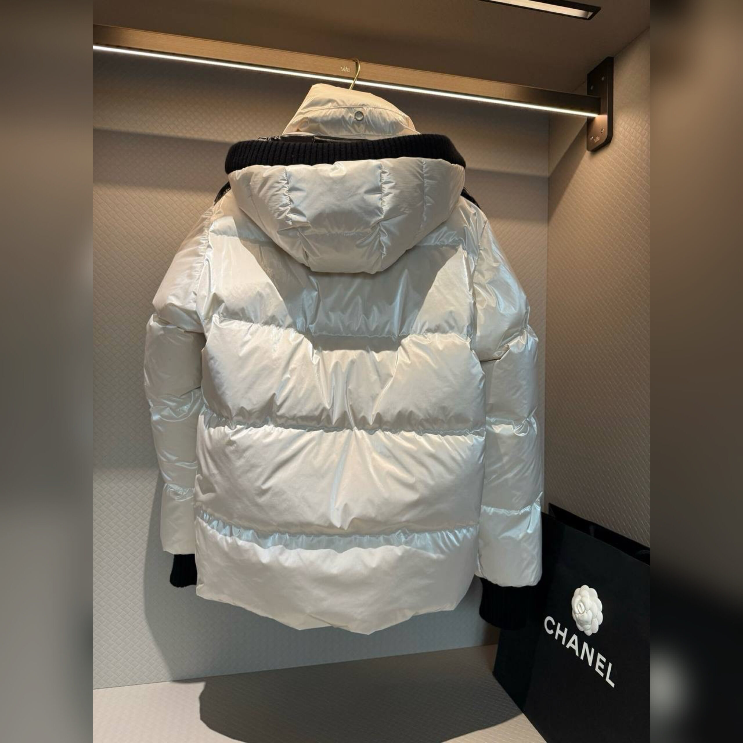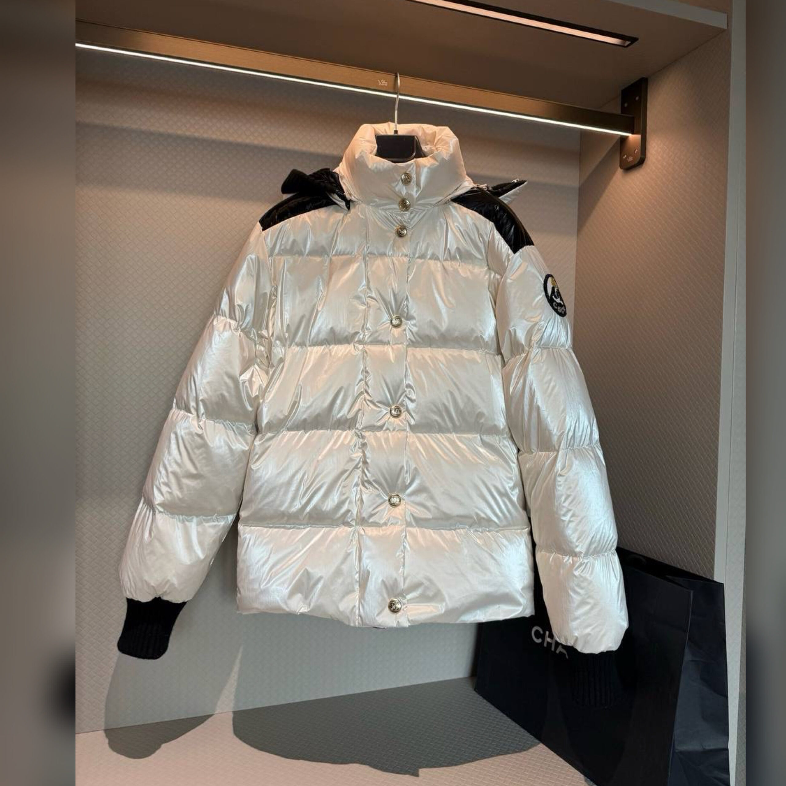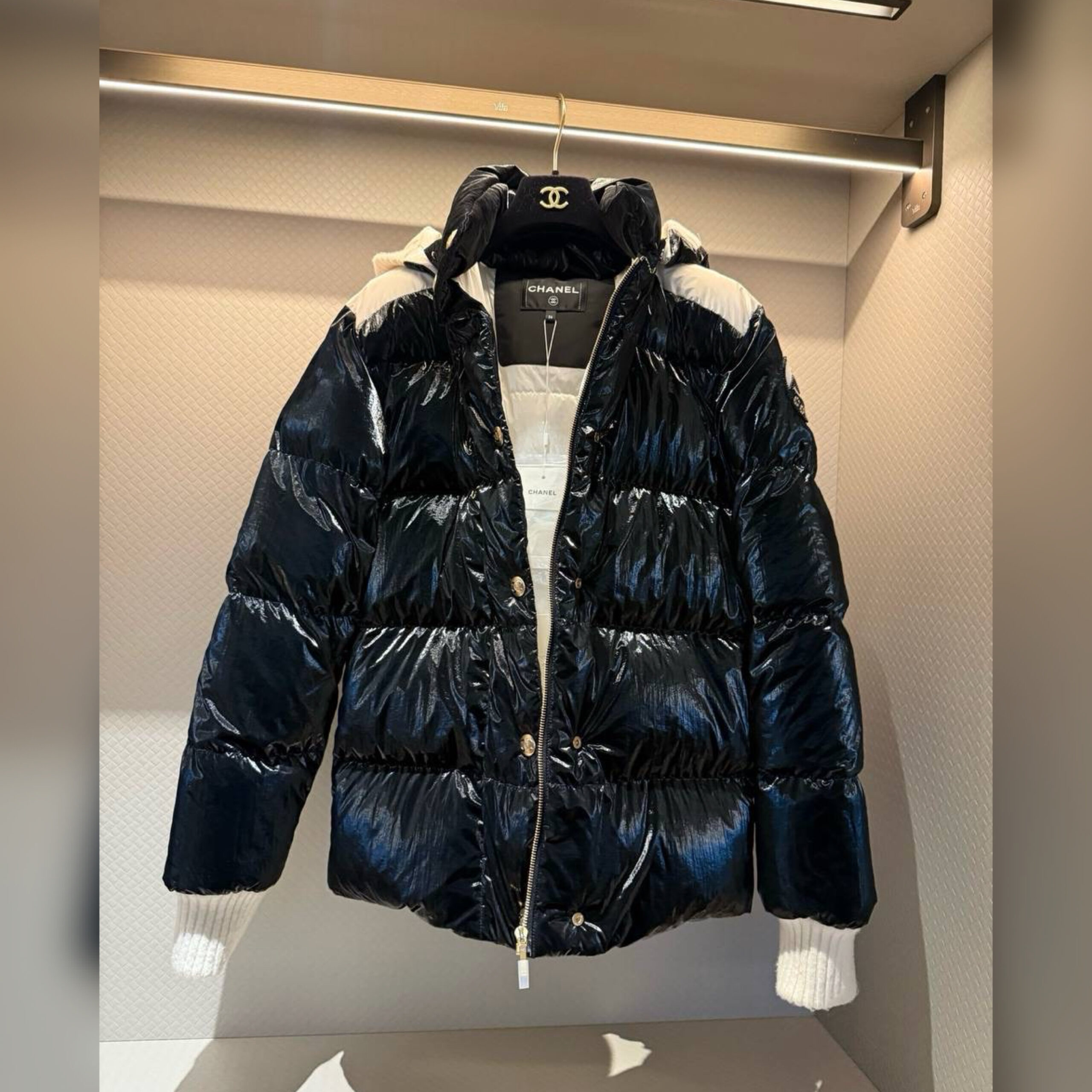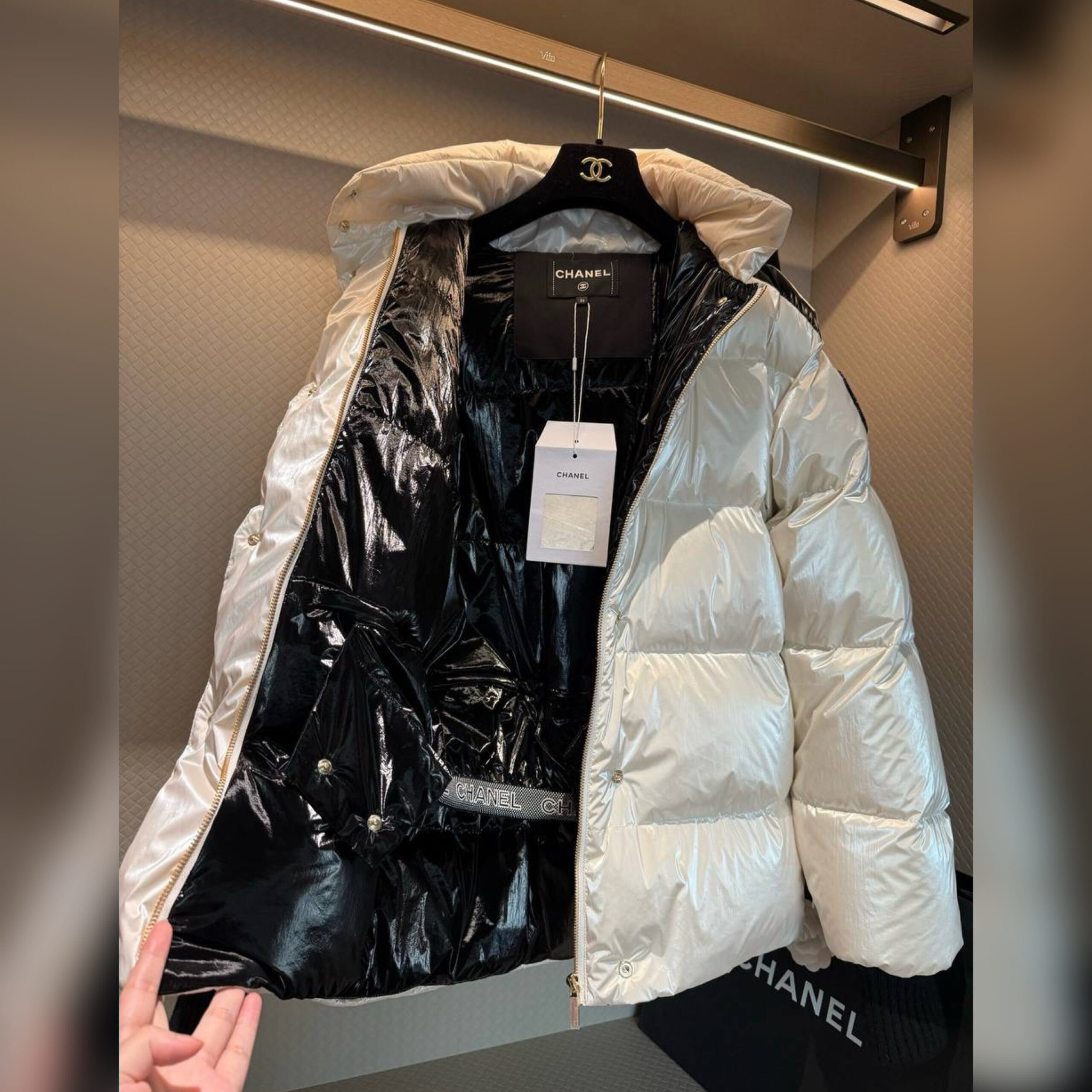 Внешний материал с эффектным блеском защищает от ветра, дождя и снега, а набивка изделия из легкого и теплого пуха сохраняет тепло, не утяжеляя.