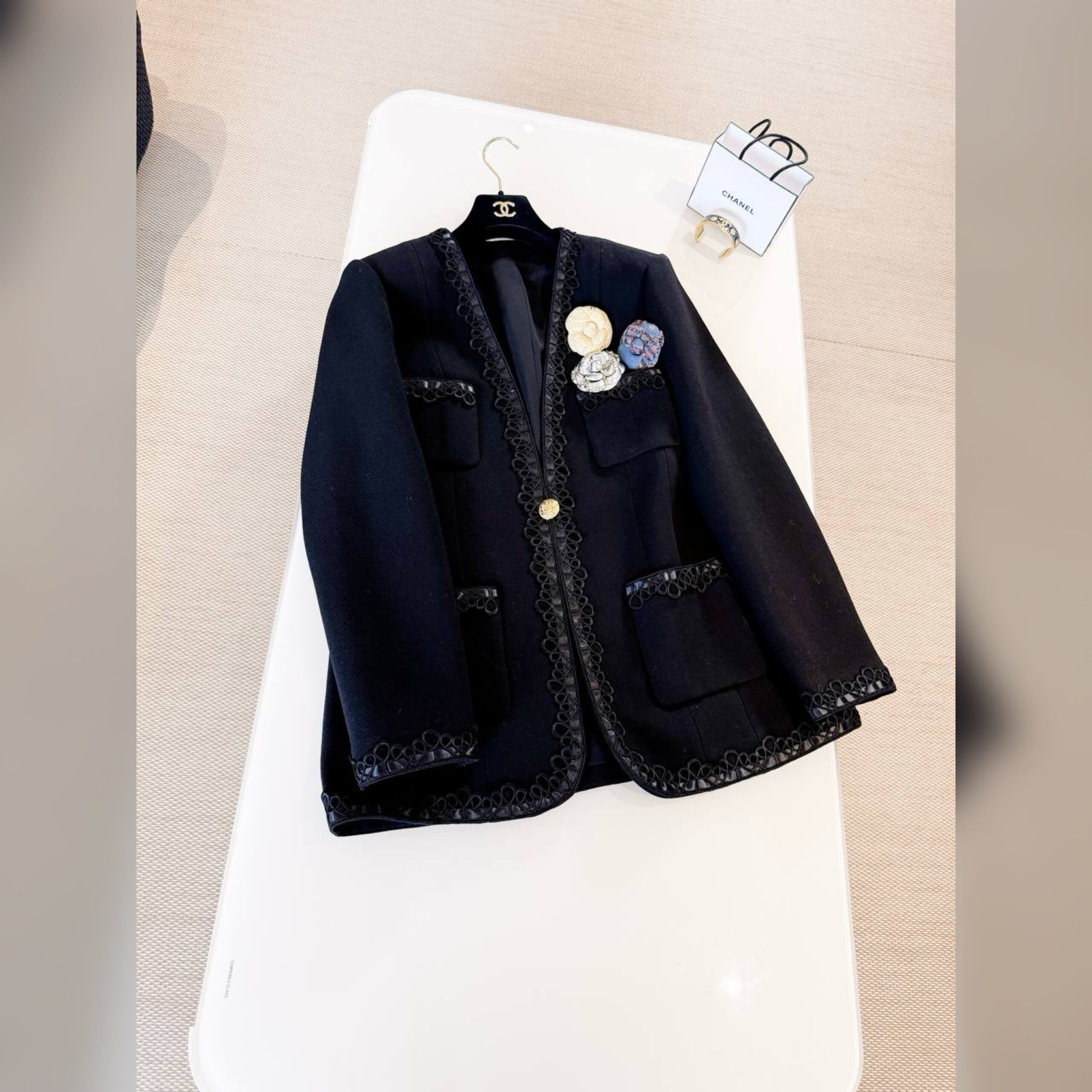 Свободный однобортный пиджак, словно позаимствованный в мужском гардеробе, сшили из мягкого твида.