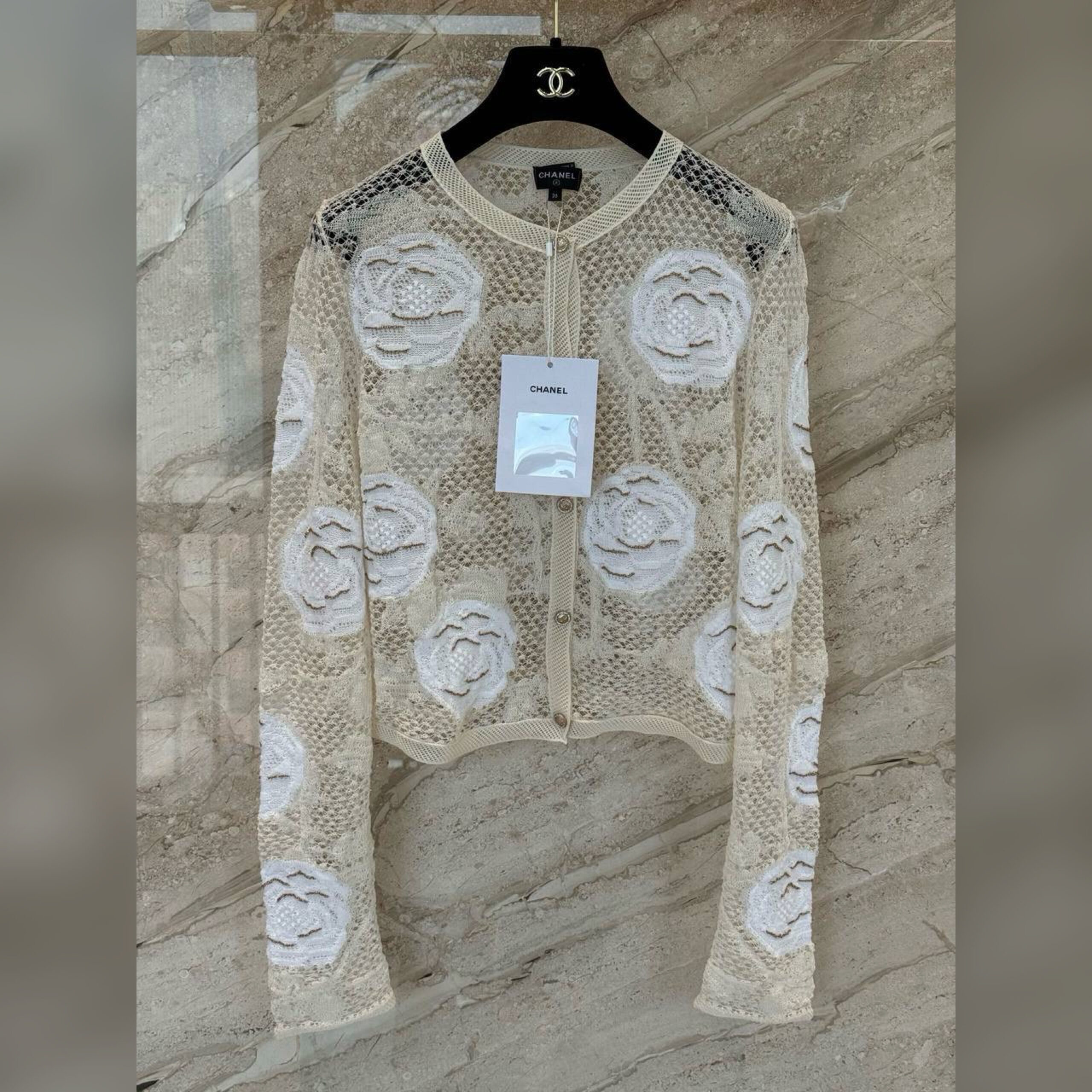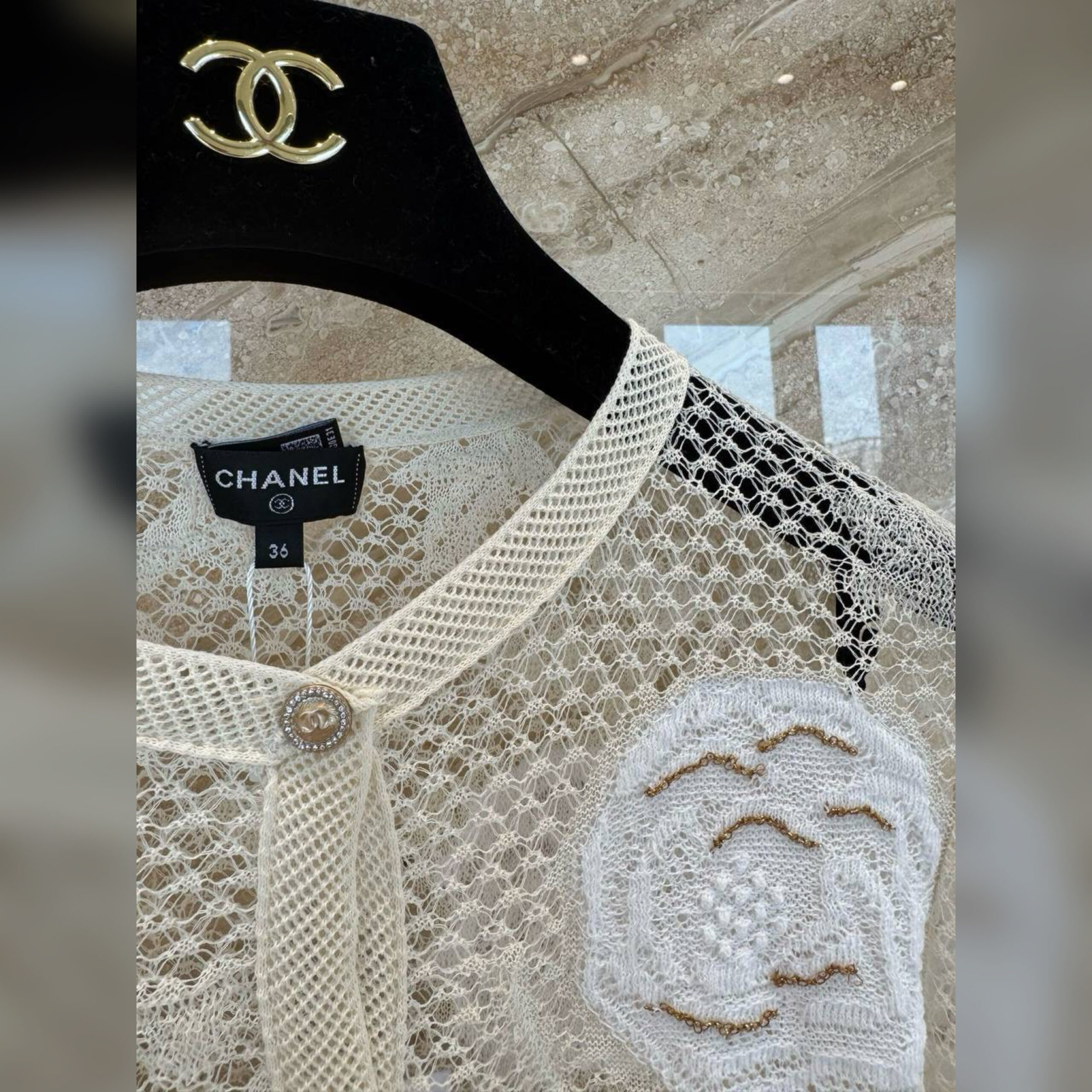 Ажурную модель украсили по всей поверхности крупными цветами камелии—одним из ключевых символов модного Дома.