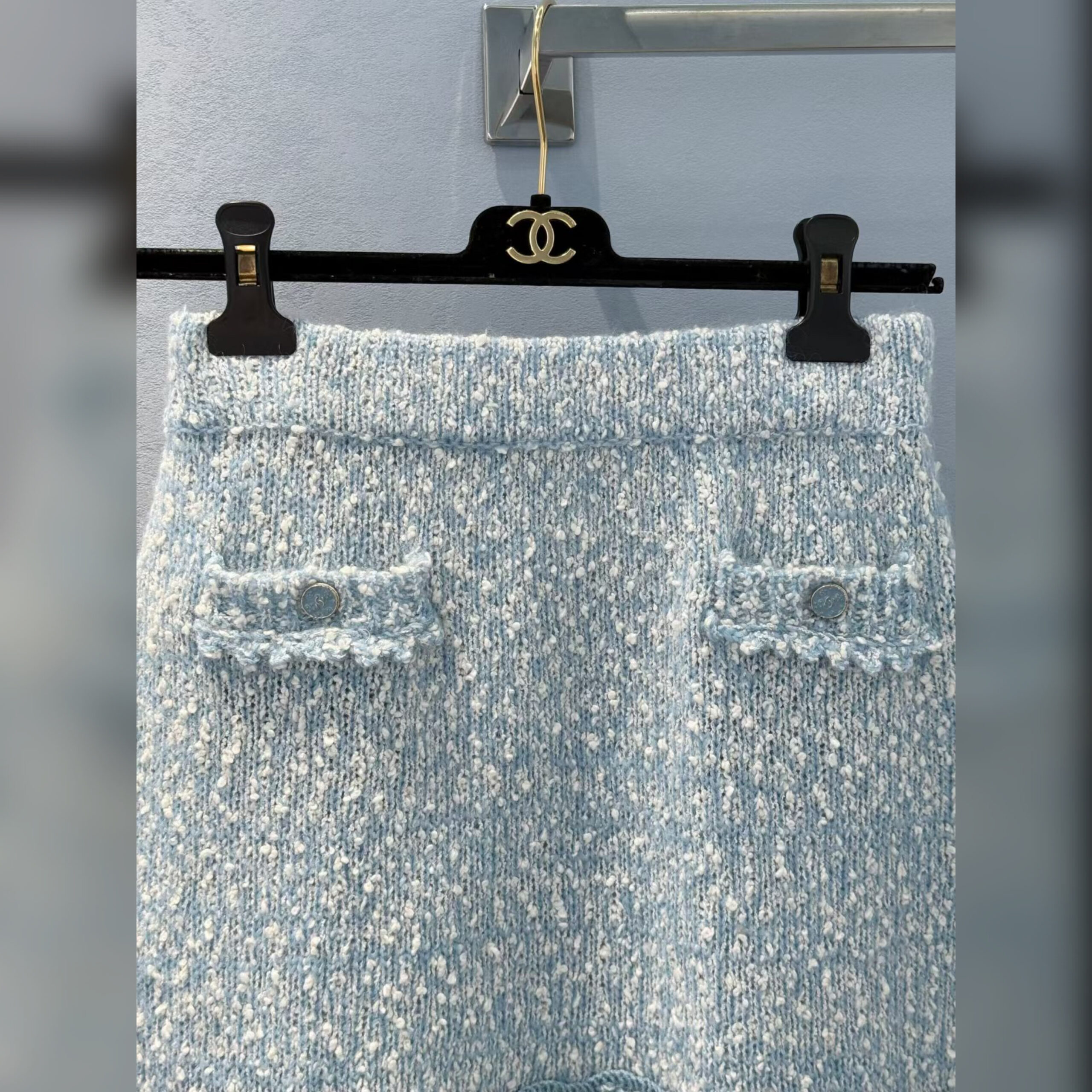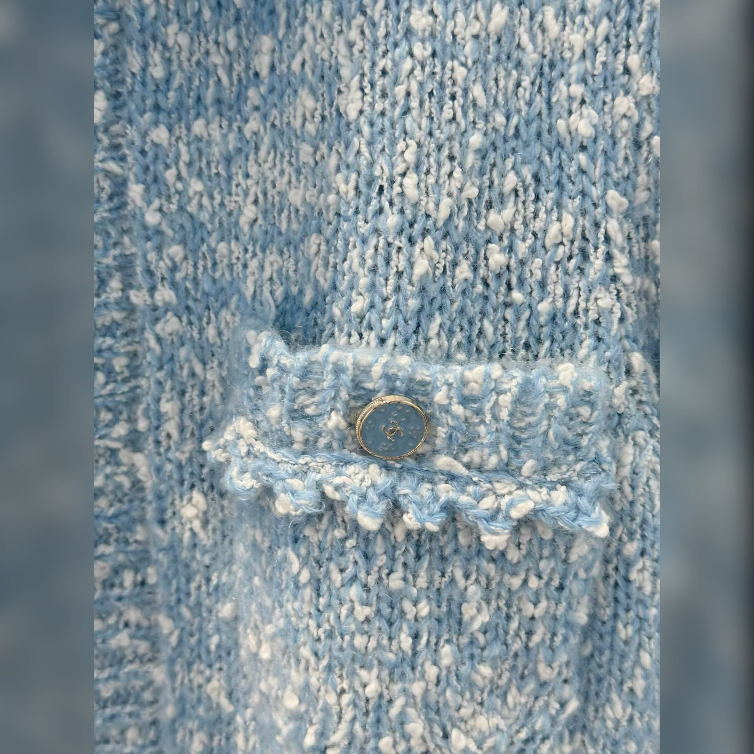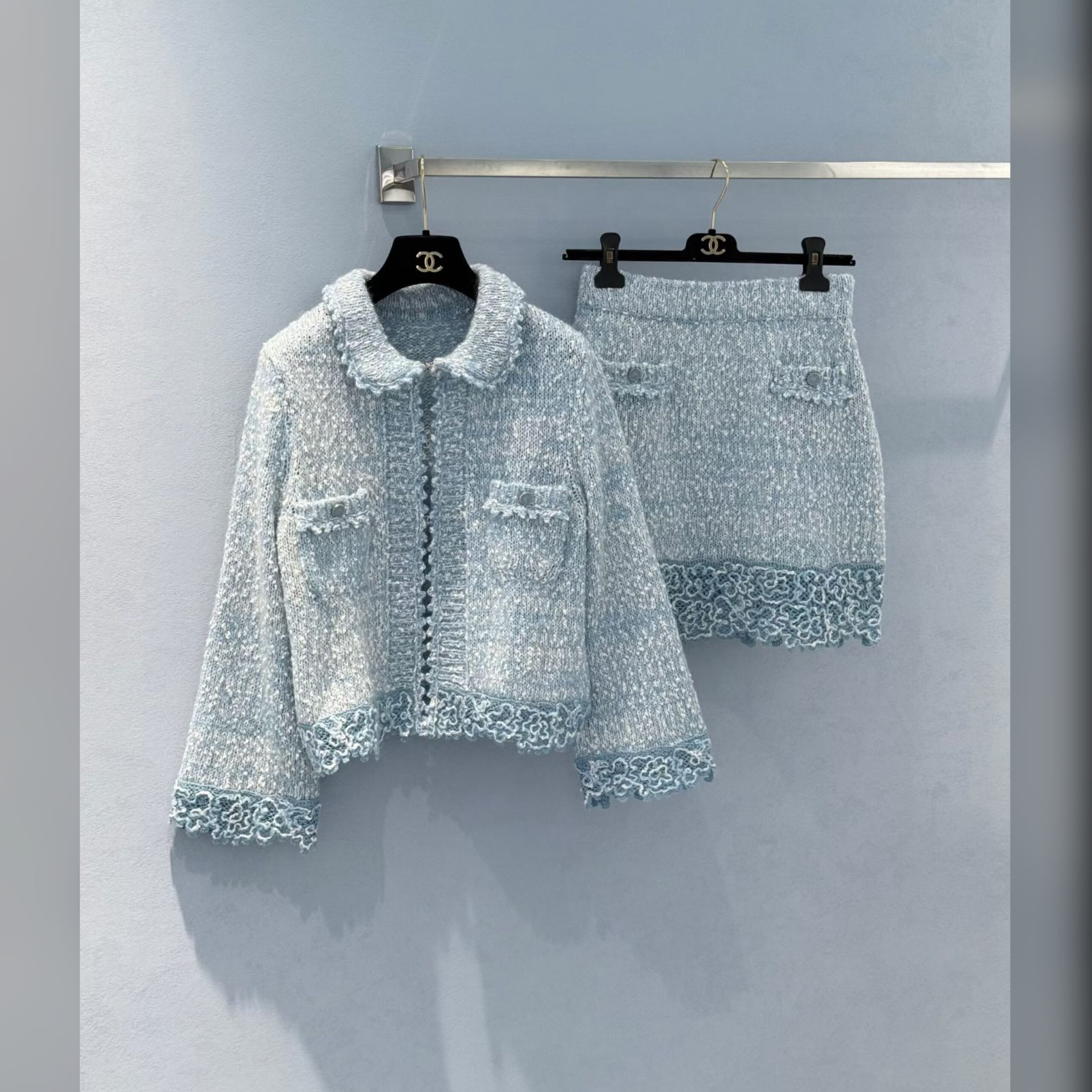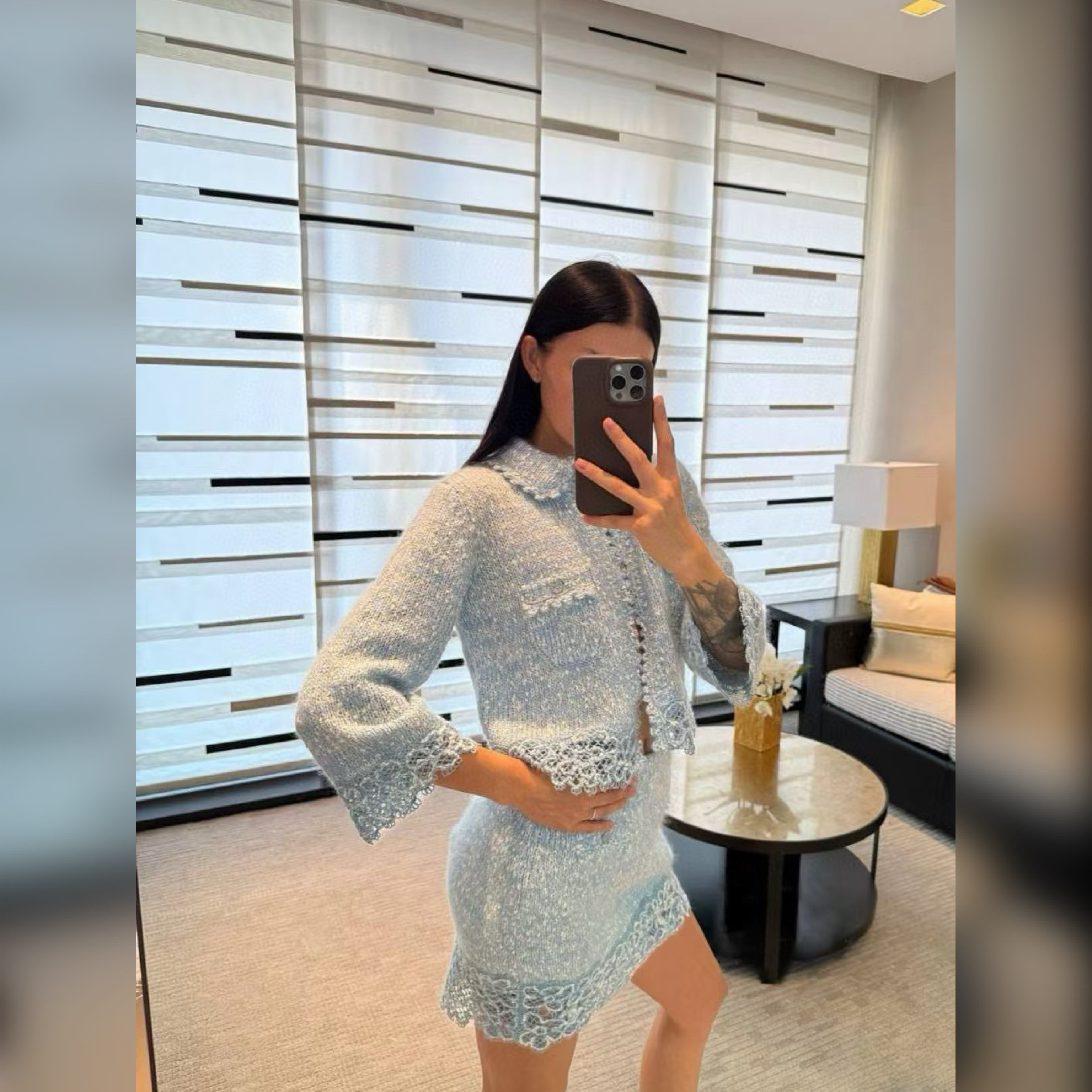 Юбка и жакет небесного оттенка выглядят эффектно. На это работает как декор, так и материал. Модели выполнили из пряжи на основе хлопка и мохера. За счет сочетания белых и голубых нитей, создается эффектный контраст.