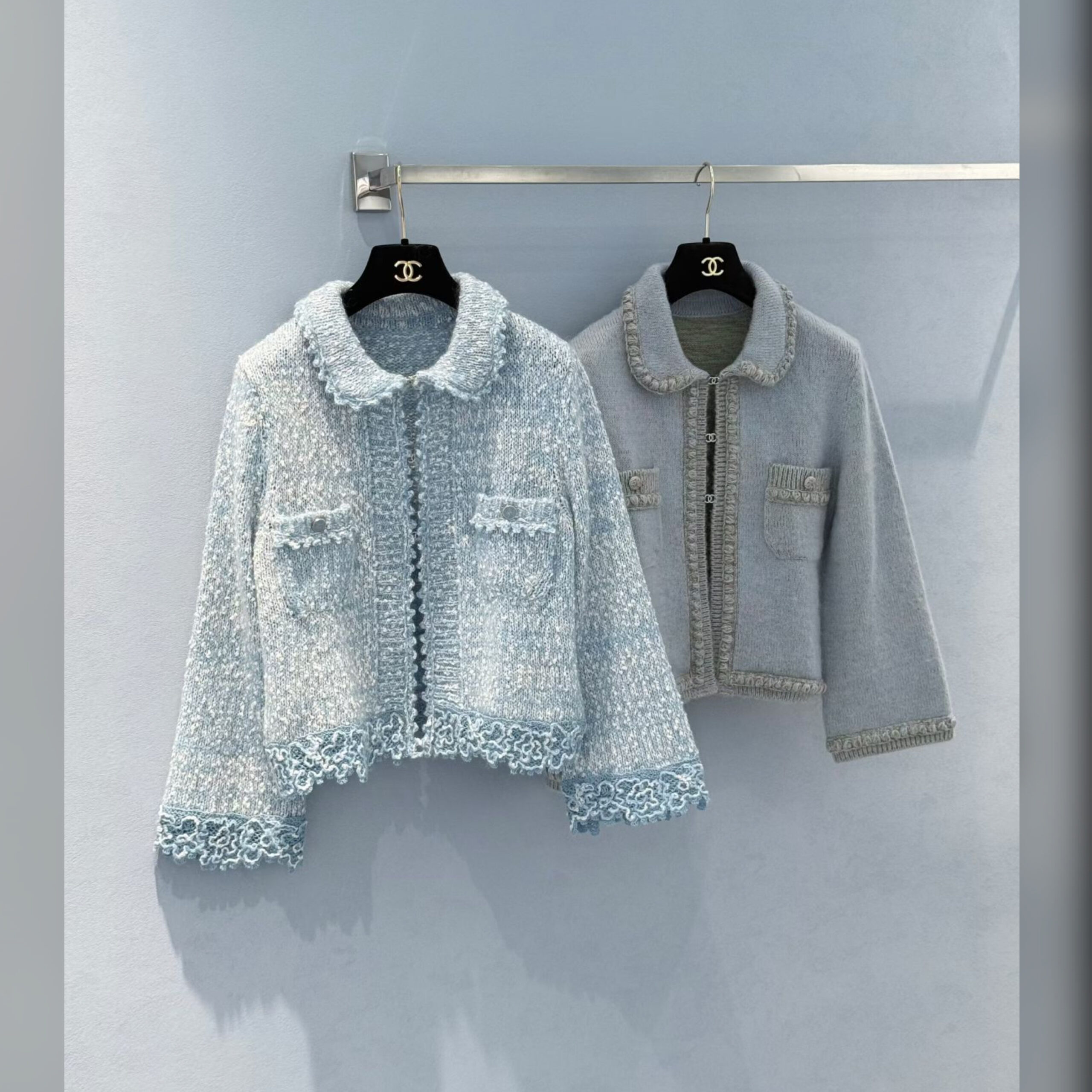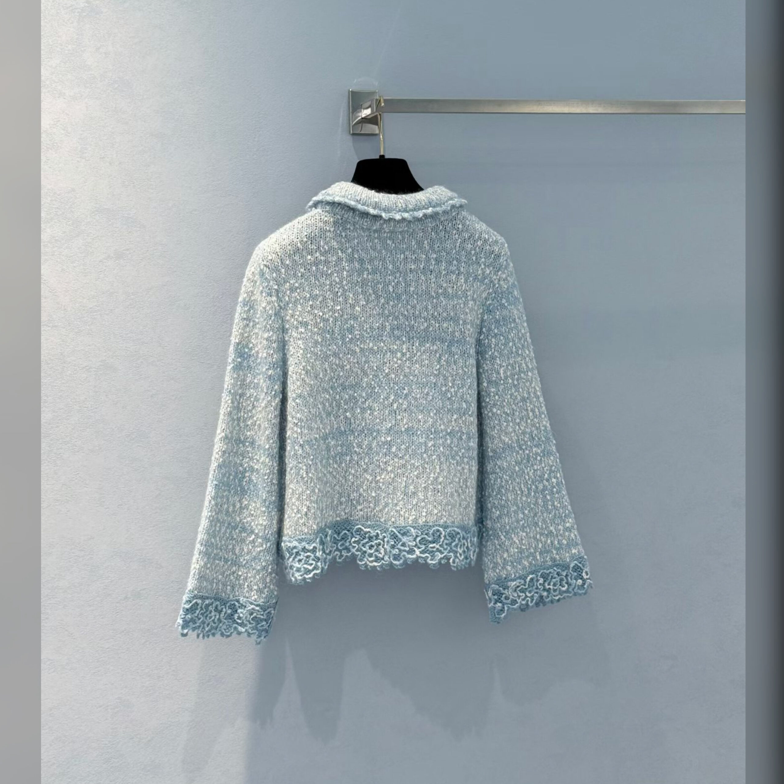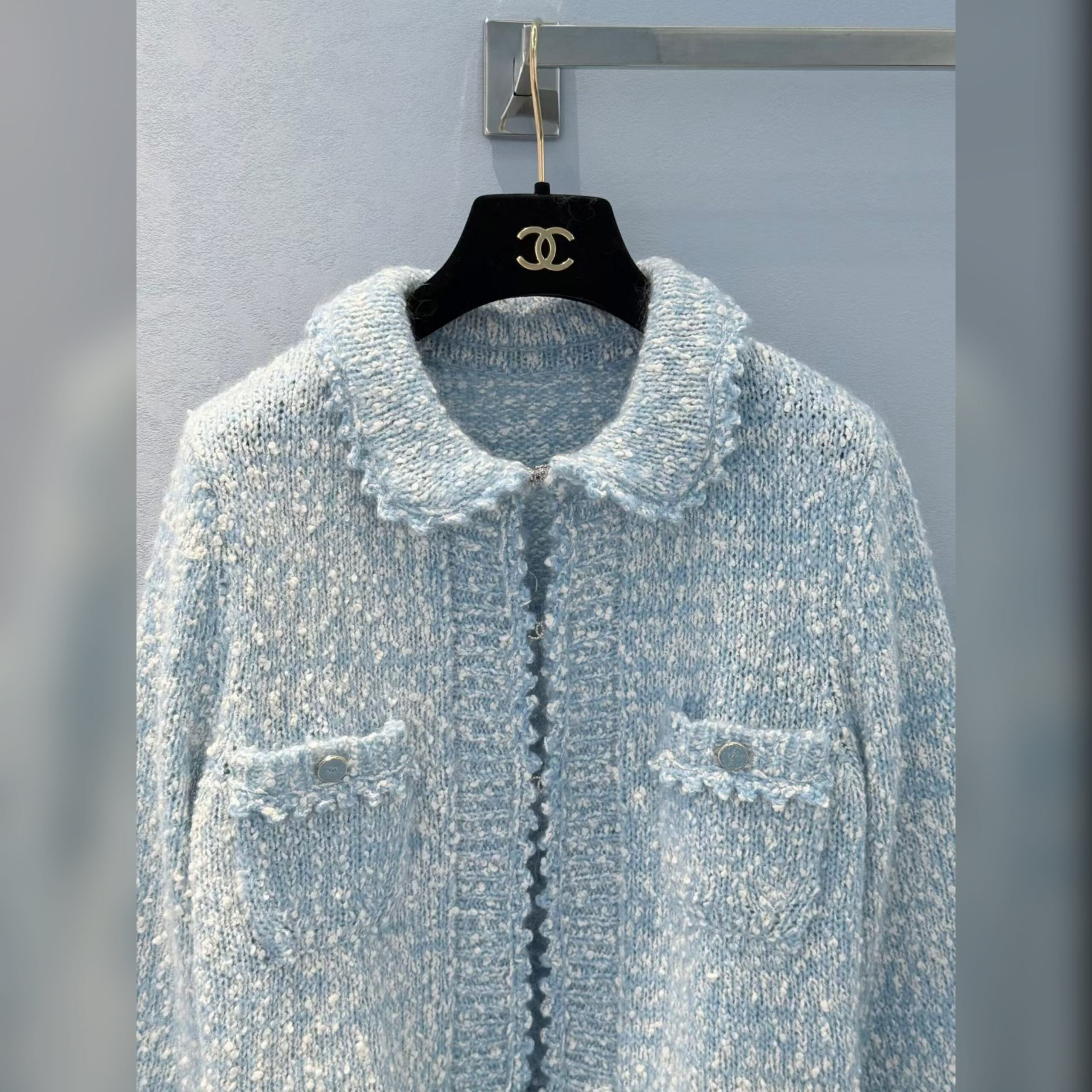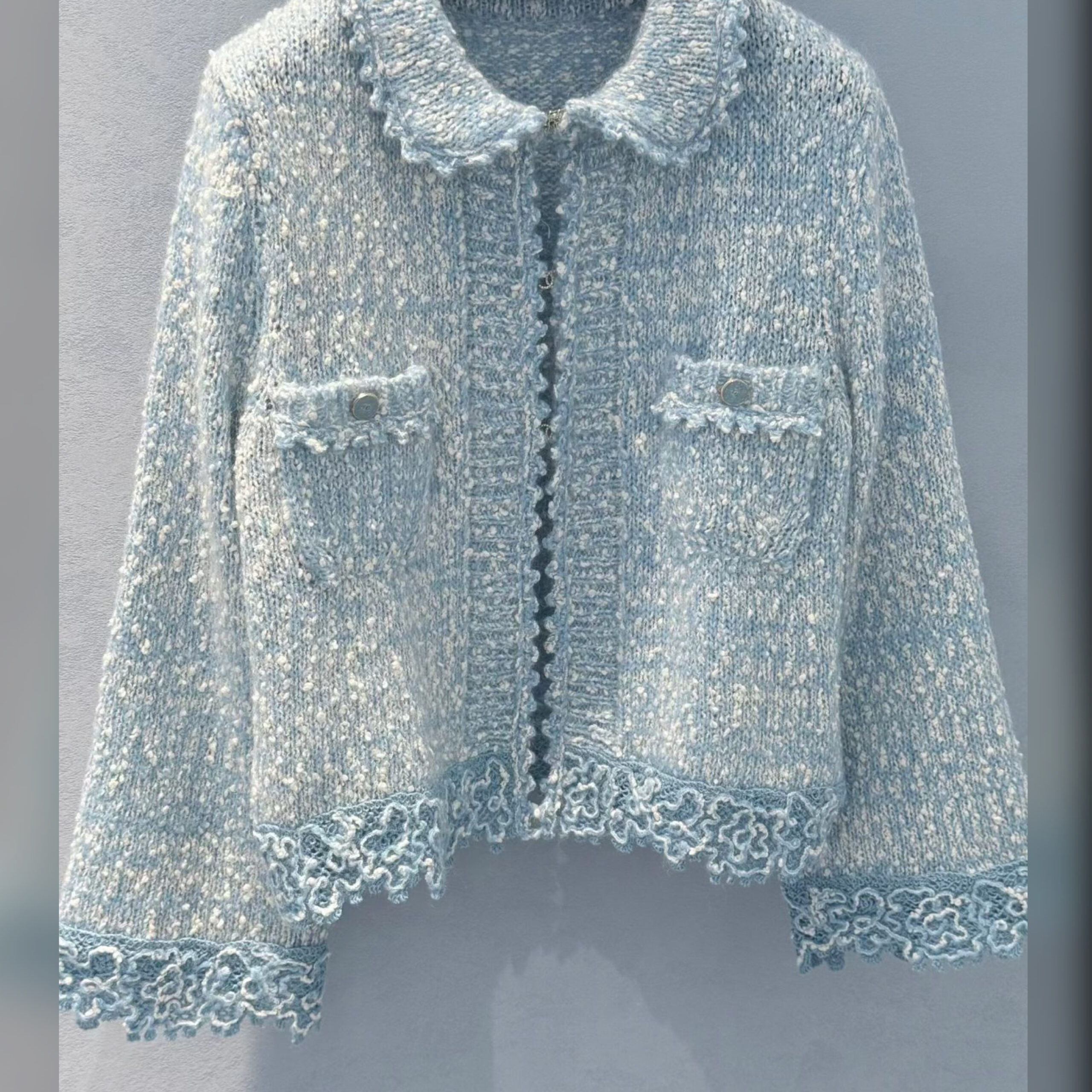 Юбка и жакет небесного оттенка выглядят эффектно. На это работает как декор, так и материал. Модели выполнили из пряжи на основе хлопка и мохера. За счет сочетания белых и голубых нитей, создается эффектный контраст.