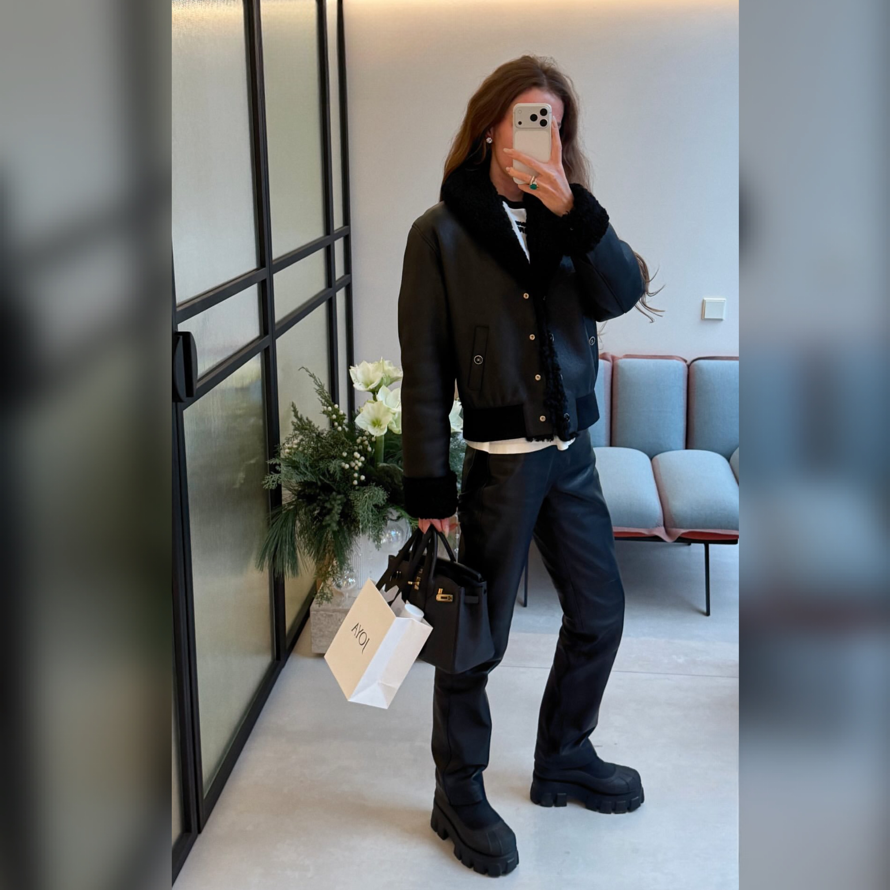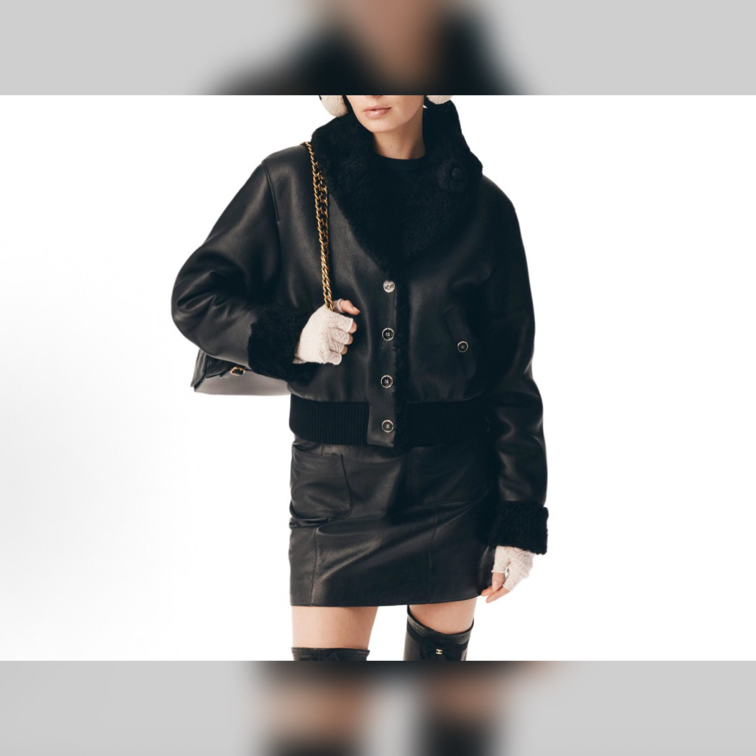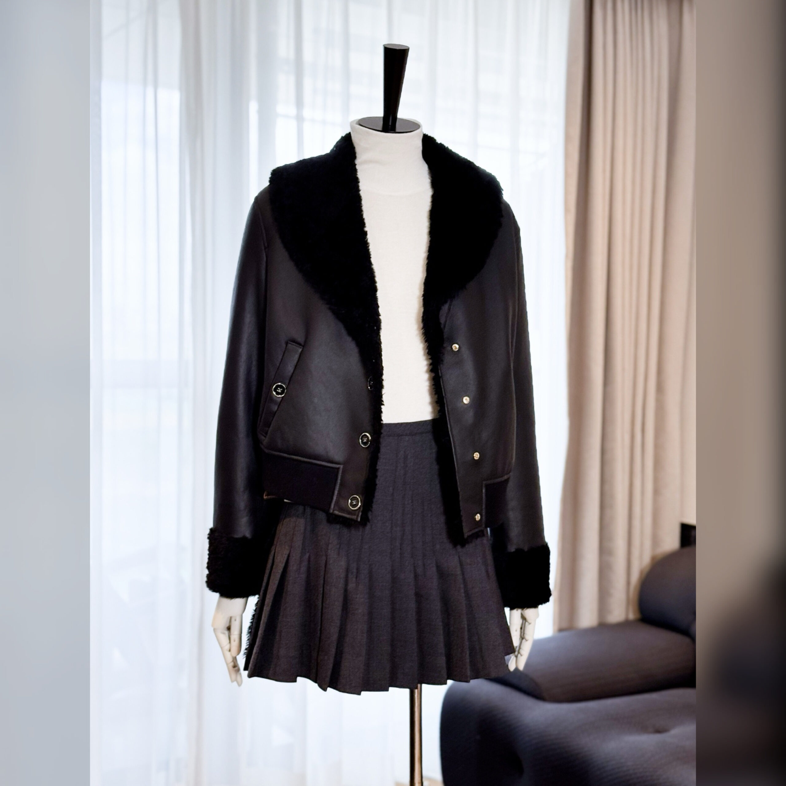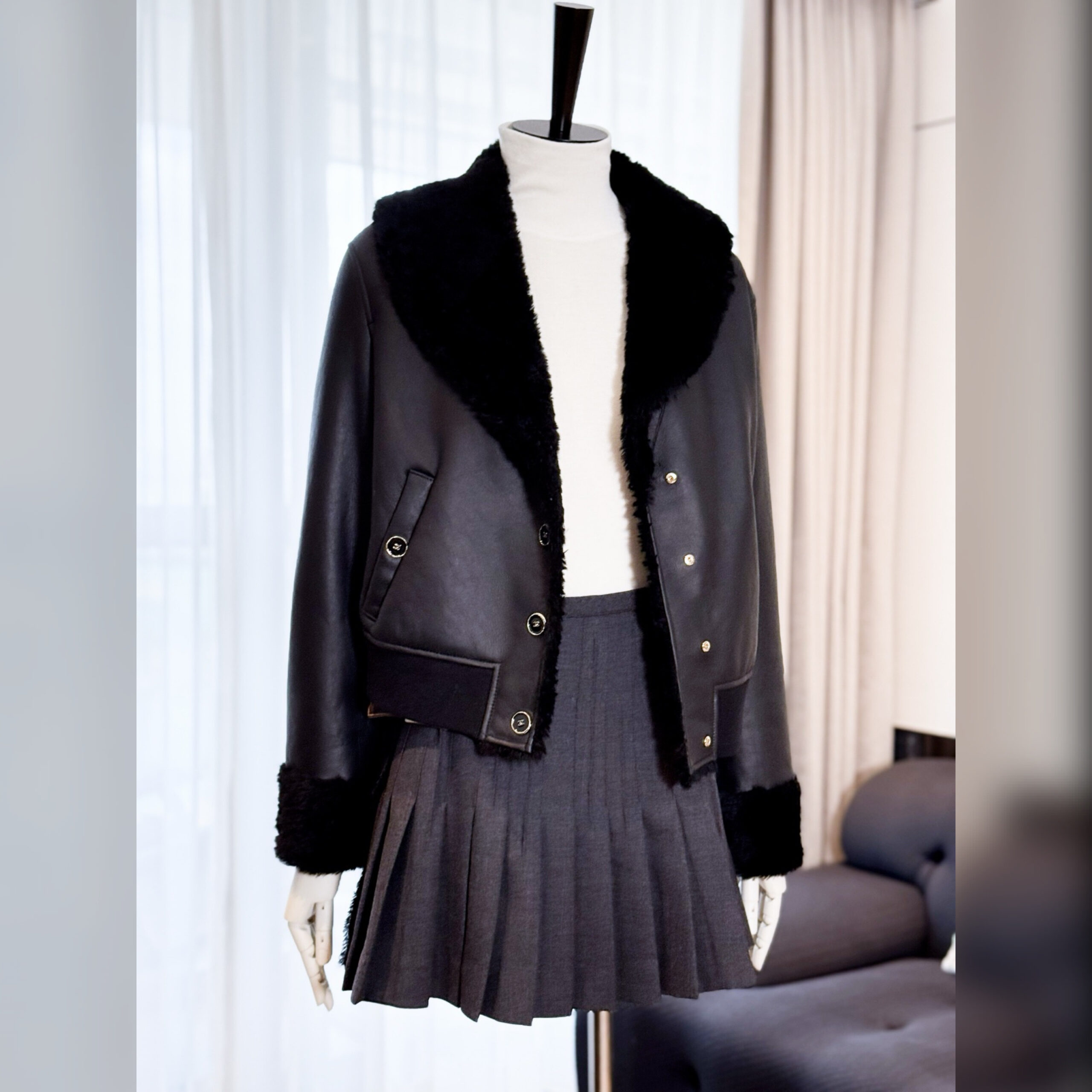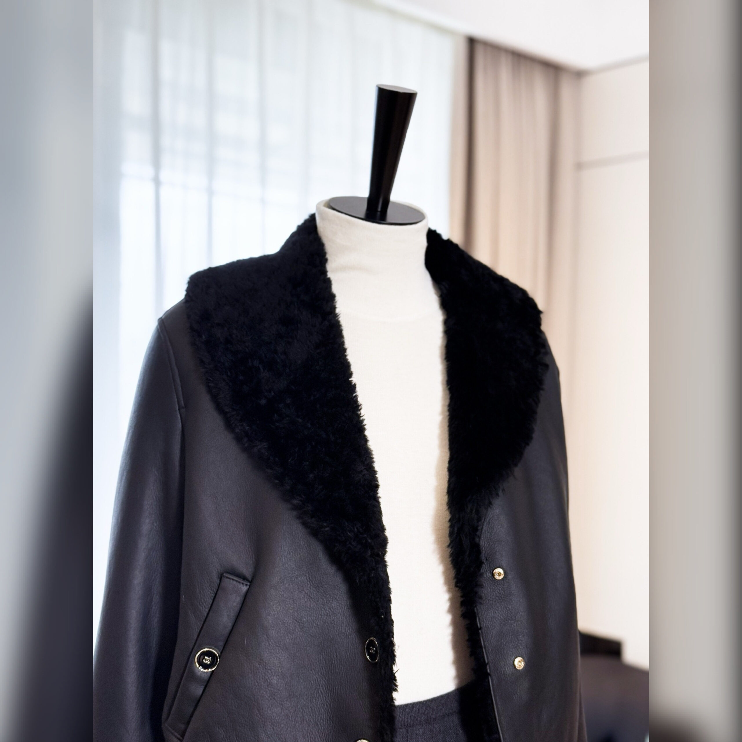 Дизайнеры марки сделали дубленку эффектной, совместив в ней черты бомбера и жакета. От первого взяли слегка спущенную линию плеч и эластичный подол, а от второго—отложной воротник.
