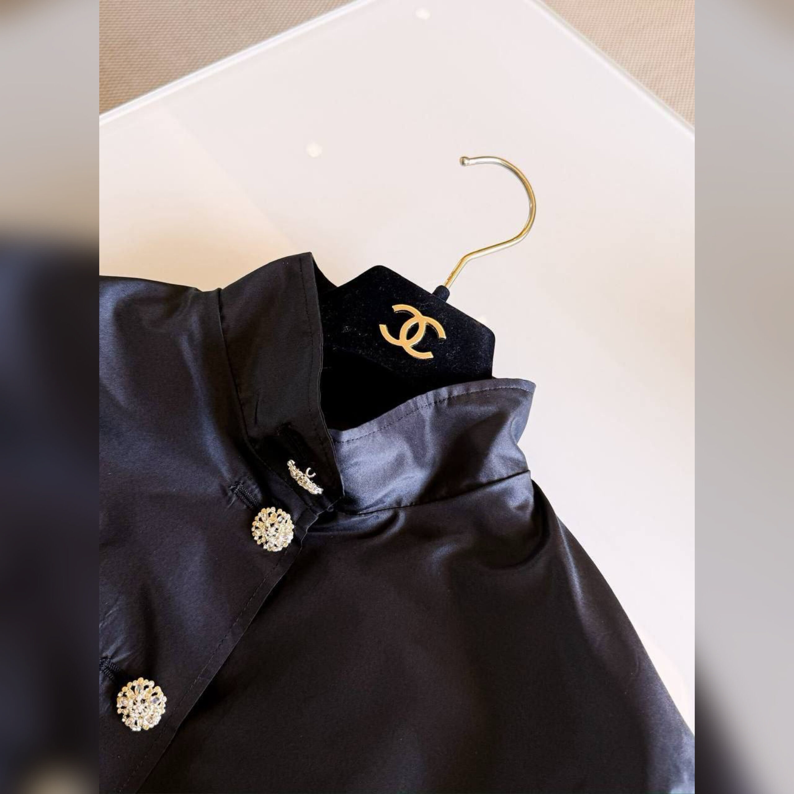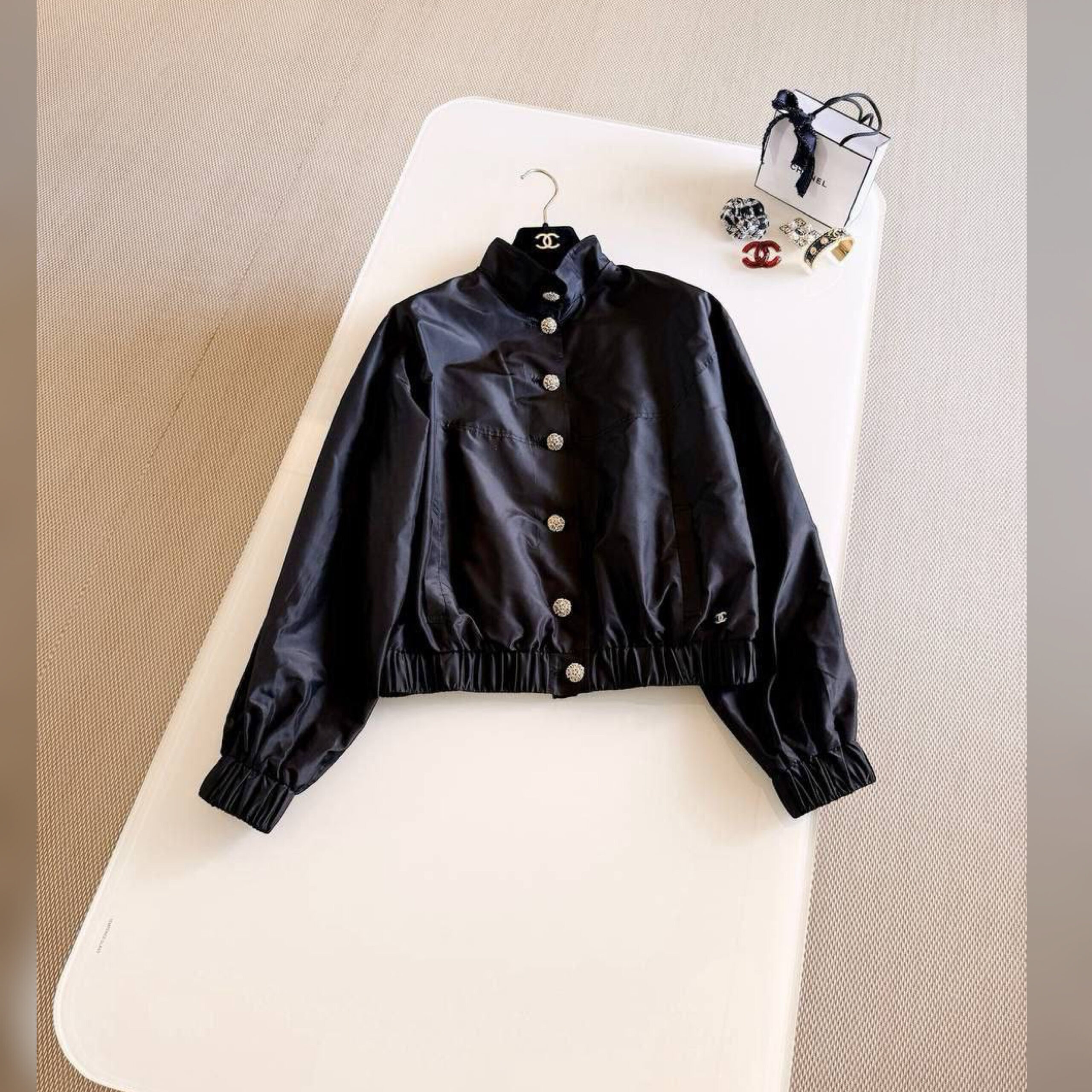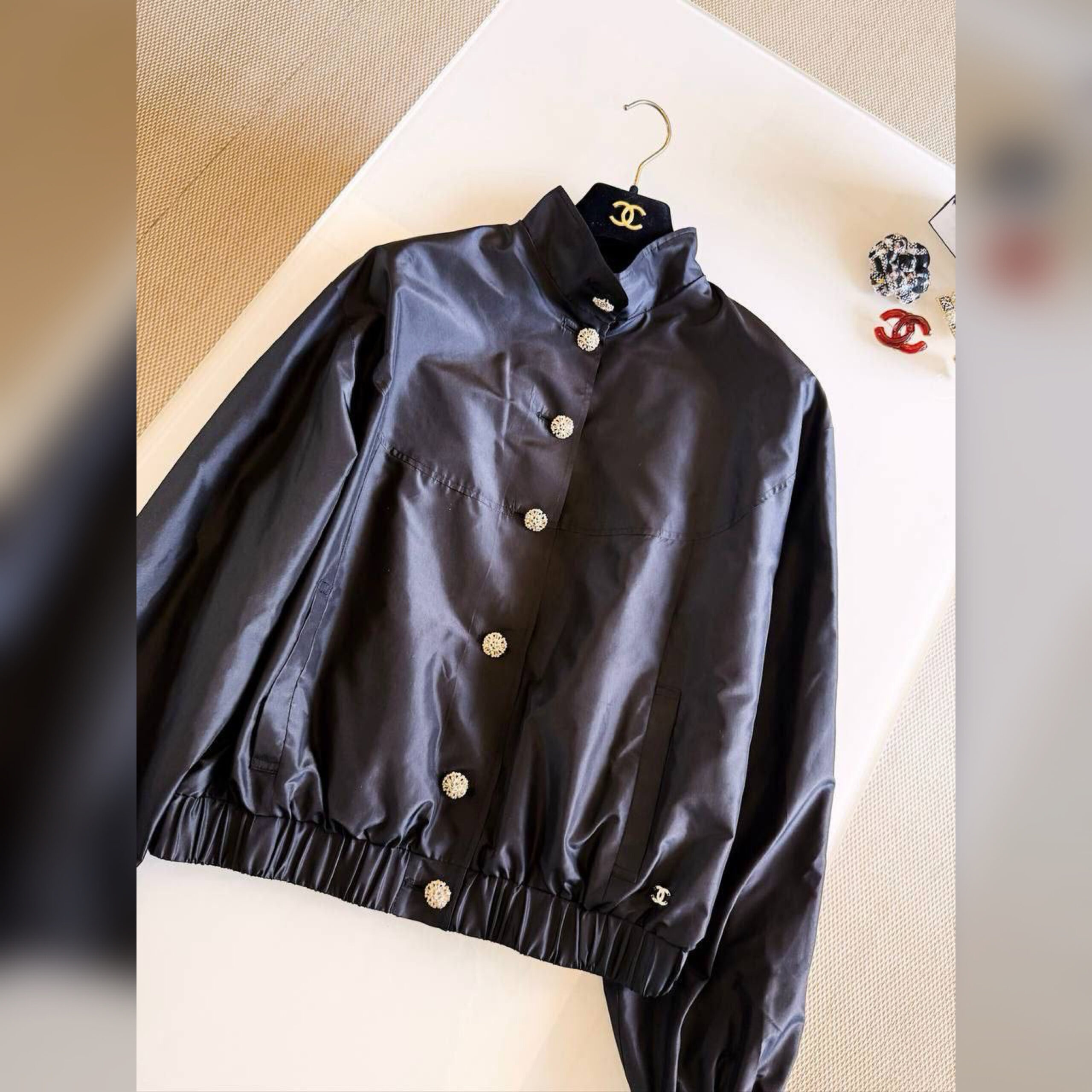 Лаконичная куртка, украшенная лишь фирменными пуговицами, легкостью и силуэтом напоминает атласную блузу. Мастера марки изготовили модель из тафты, тесное переплетение нитей которой создает шелковистую фактуру.