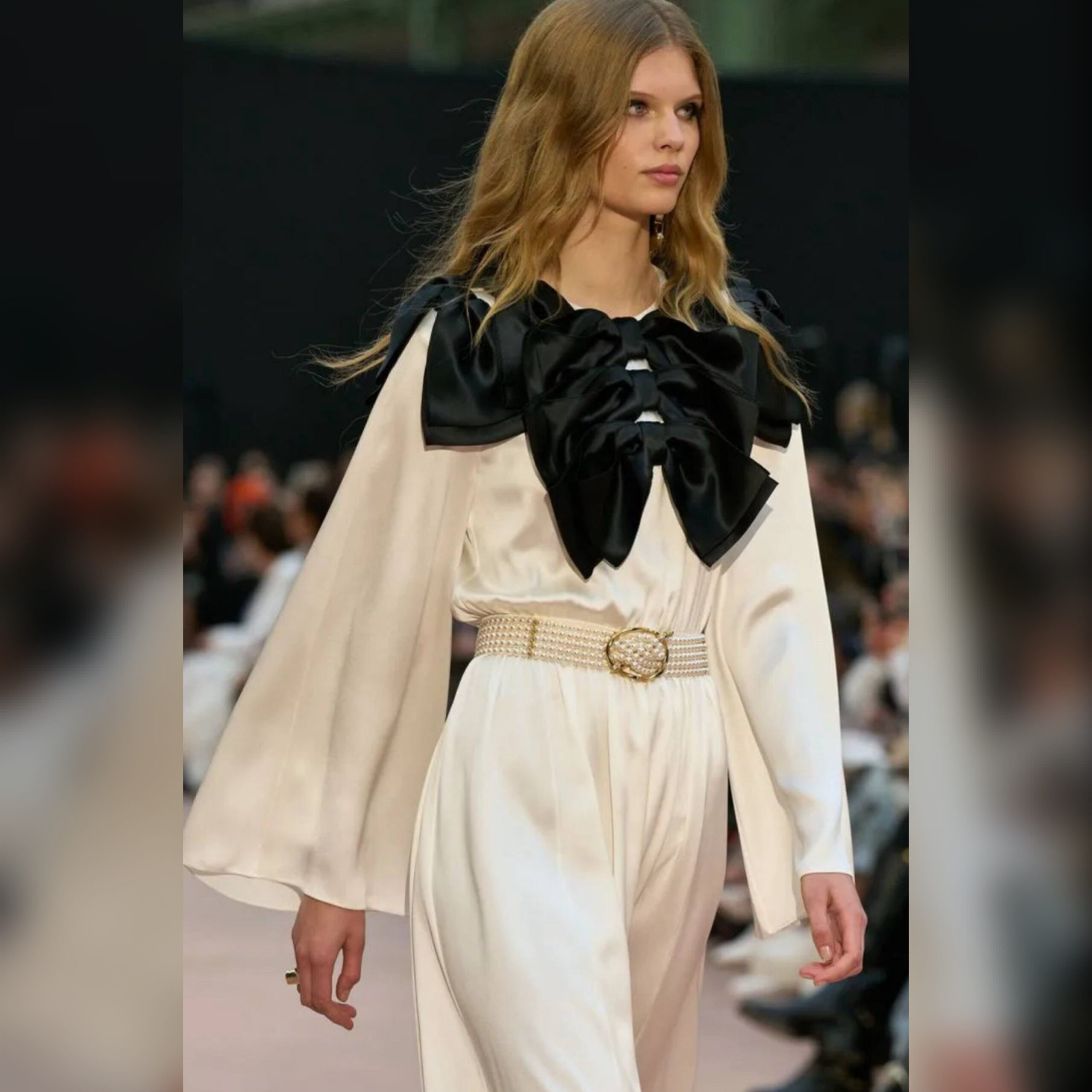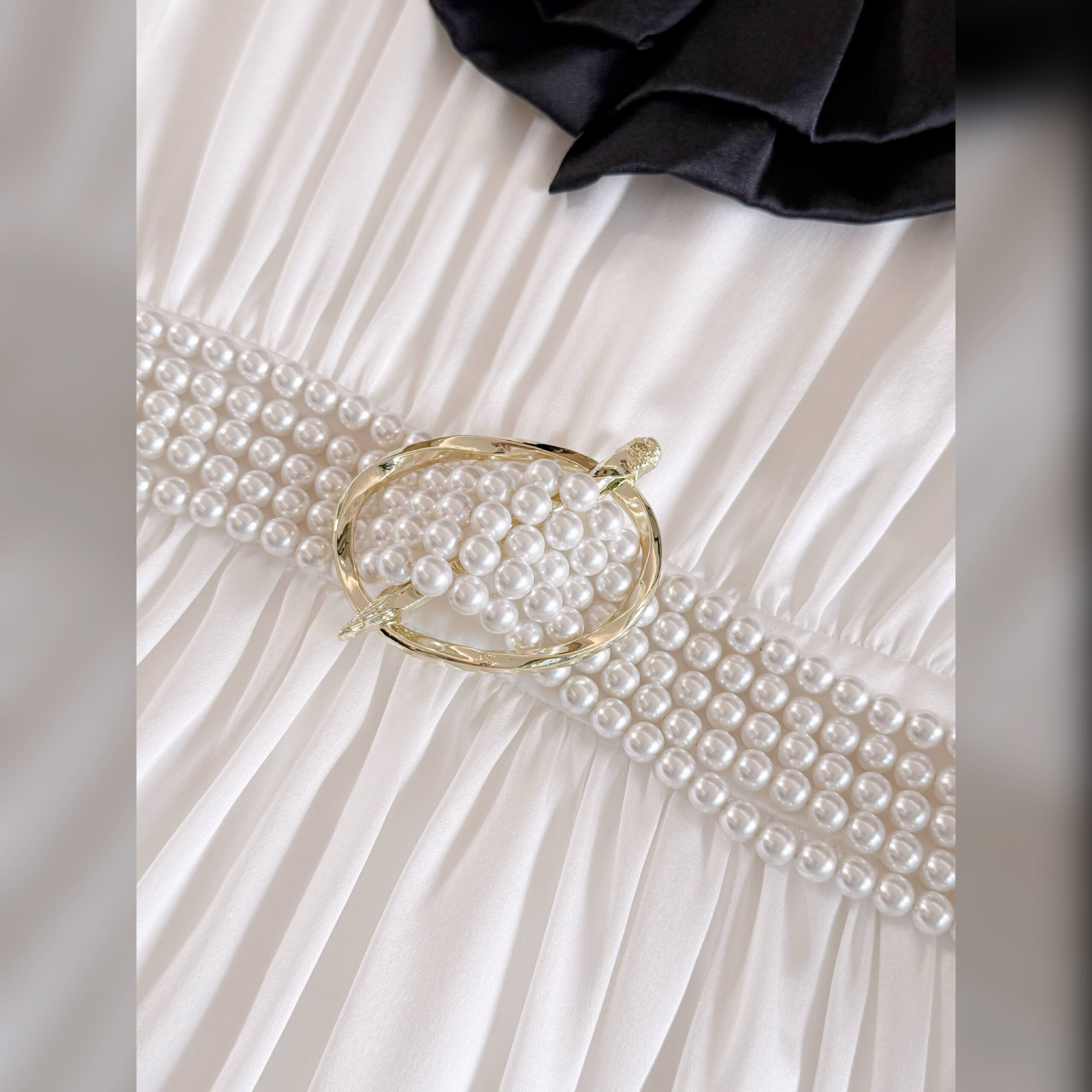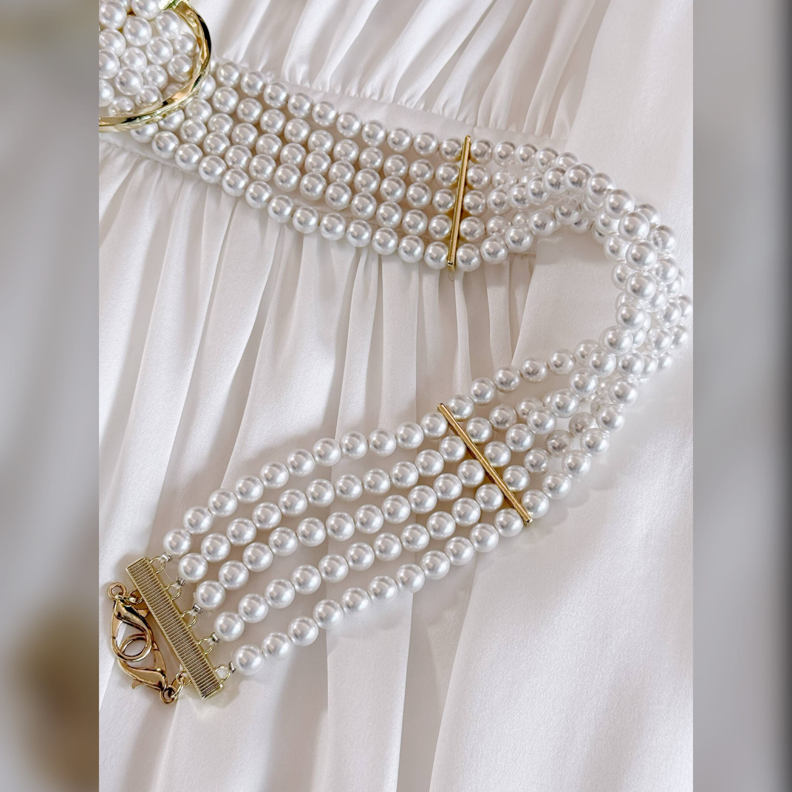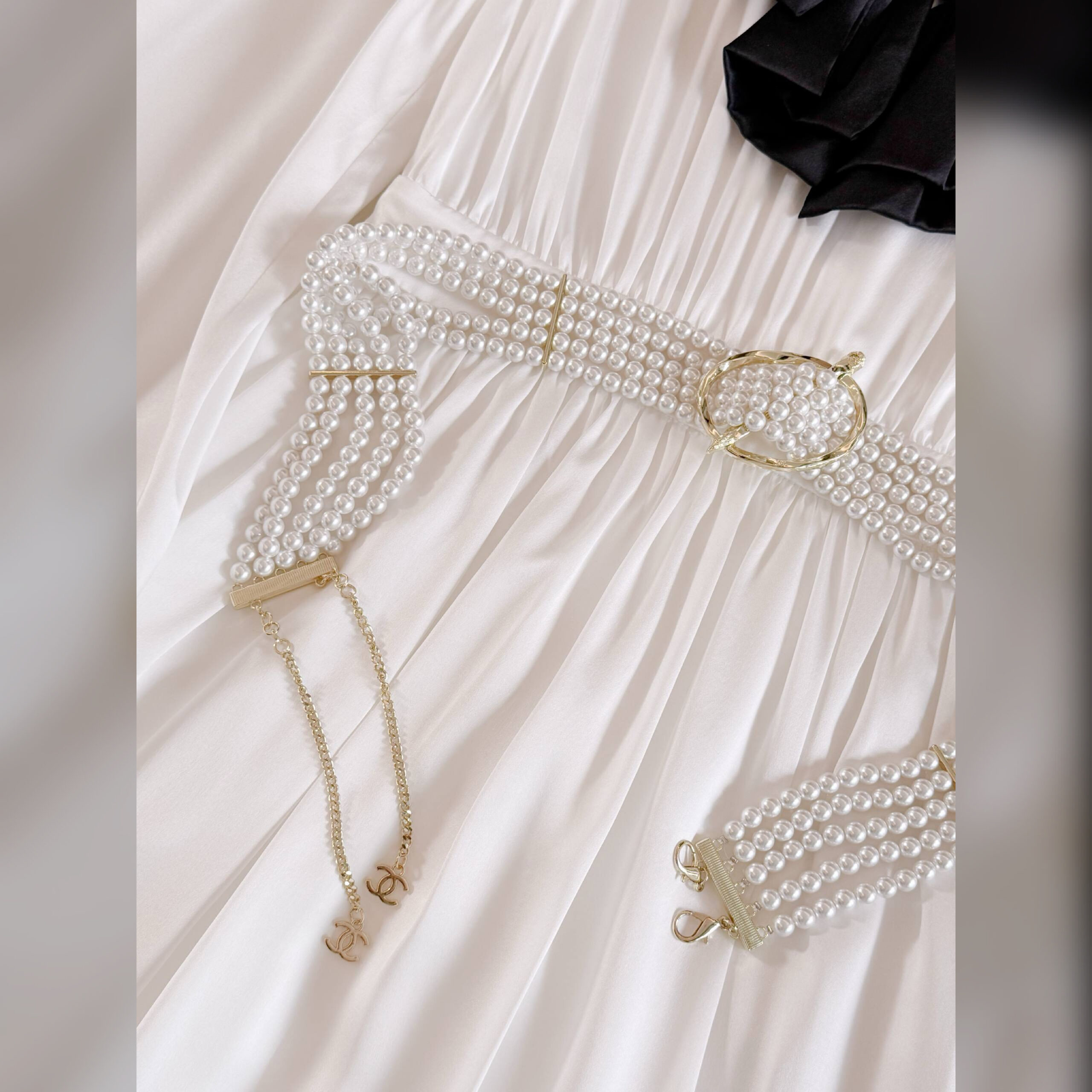 Пояс, собранный из нитей фантазийного жемчуга, дополнили перемычками из золотистого сплава и фигурной овальной пряжкой. Посадка модели регулируется цепочками с карабинами, конец которых свободно ниспадает сзади.