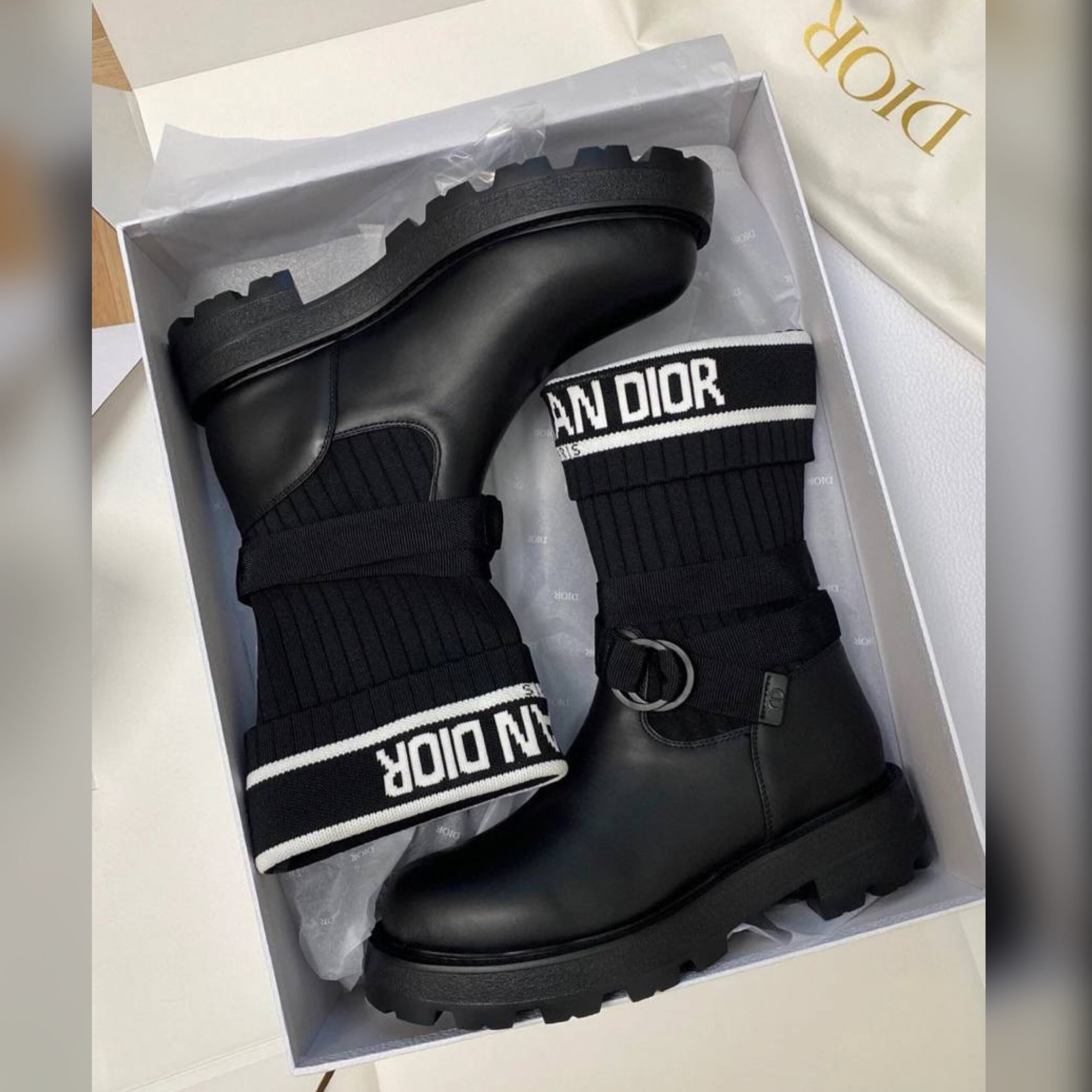 Сапоги D-Major— эффектная модель в современном стиле. Изделие выполнено из трикотажа с фирменной лентой Christian Dior и черной телячьей кожи. Модель на ультралегкой рифленой подошве дополнена регулируемым ремешком, подчеркивающим щиколотку.